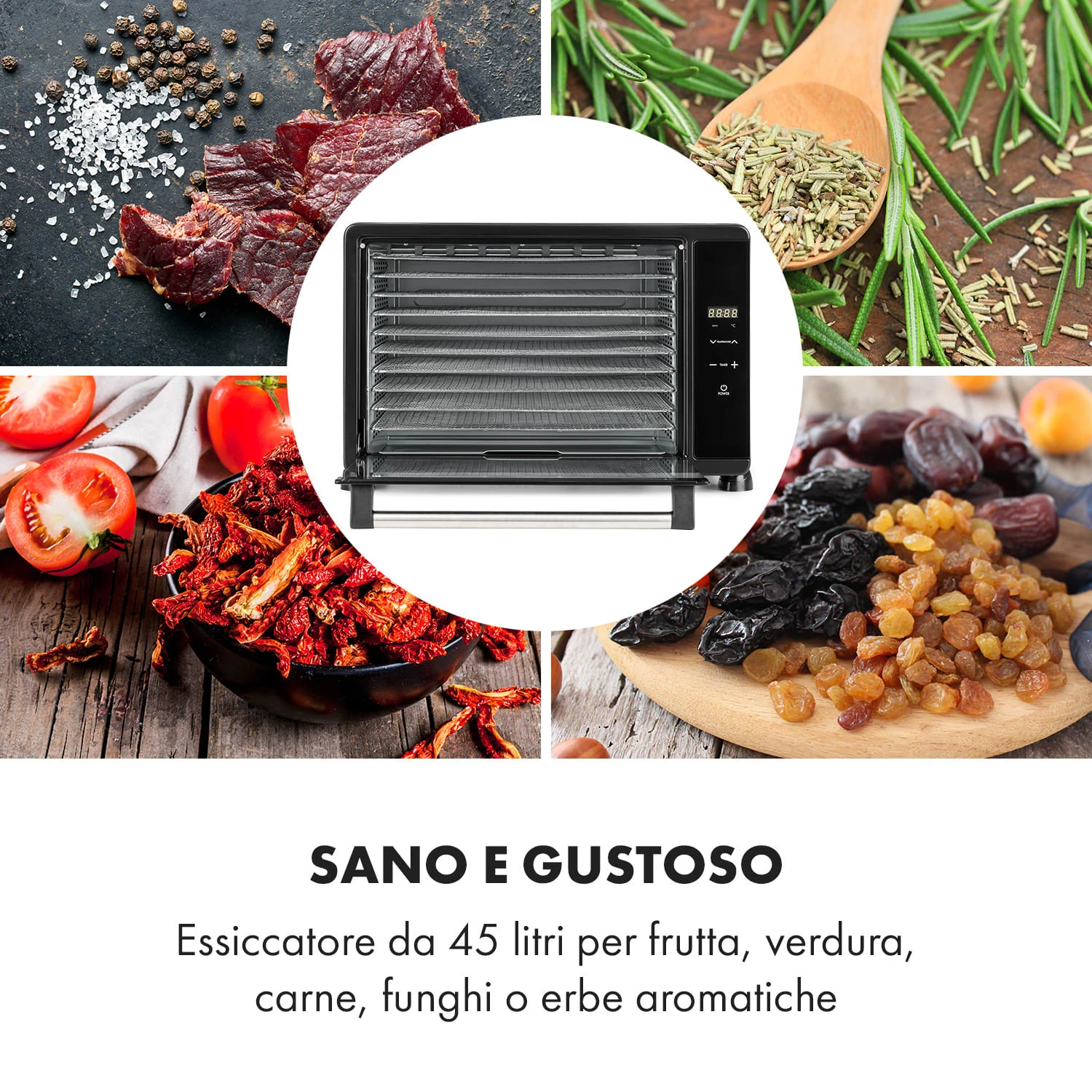 Perfetto per grandi quantità: sui 10 ripiani da 40 x 30 cm potrete comodamente posizionare gli alimenti da essiccare. Il timer programmabile in intervalli di 30 minuti garantisce sempre la durata corretta. La pulizia dell’essiccatore a preparazione terminata è facilissima: basta sciacquare i ripiani cromati. Una teglia sul fondo raccoglie succo di frutta o briciole in caduta, facilitando ulteriormente il processo di pulizia. L’alloggiamento in metallo con sportello in vetro e display touch LC di facile lettura rendono il dispositivo un elegante complemento di design in ogni cucina.