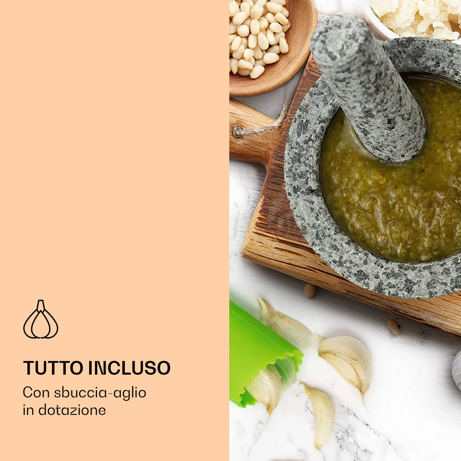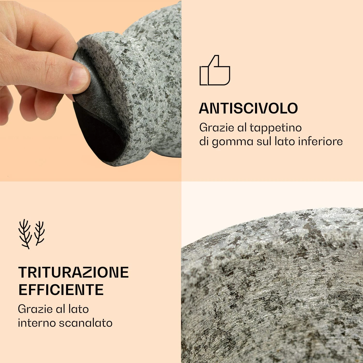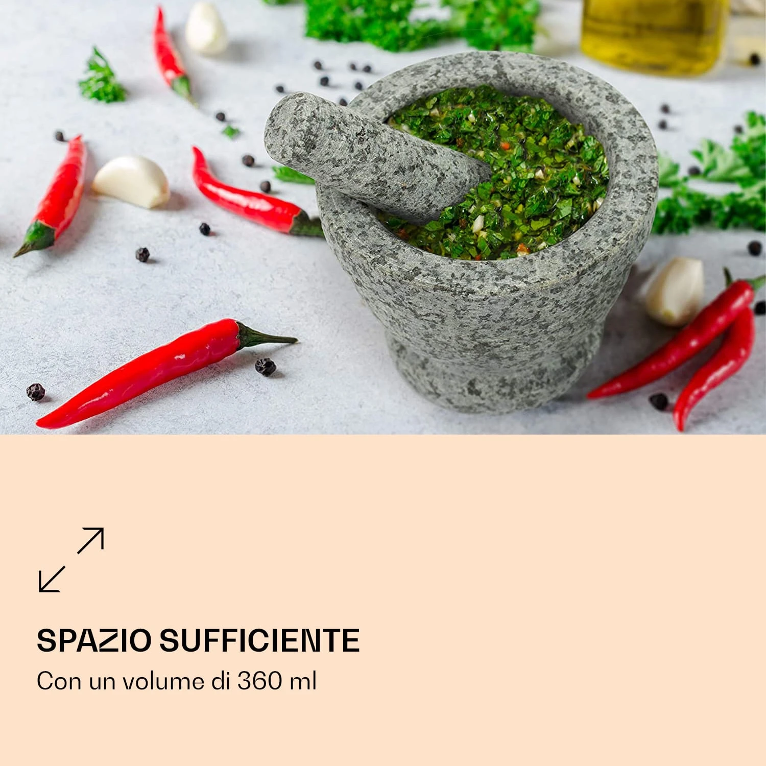 Il set con mortaio e pestello di Gramercy by Klarstein è dotato di tutte le caratteristiche fondamentali per risultati eccellenti: una ciotola profonda che impedisce agli ingredienti di schizzare, un interno scanalato che facilita la lavorazione degli ingredienti e un’applicazione in gomma sul lato inferiore per evitare che scivoli sul piano di lavoro. Abbiamo anche incluso un pratico pela aglio per una sbucciatura più rapida e comoda. Con una capacità di 360 ml, il set offre anche spazio sufficiente per sminuzzare, pestare e macinare con grande facilità. Grazie alla sua struttura robusta, il mortaio con pestello di Gramercy by Klarstein non è solo particolarmente resistente, ma porta anche un tocco di stile in ogni cucina.