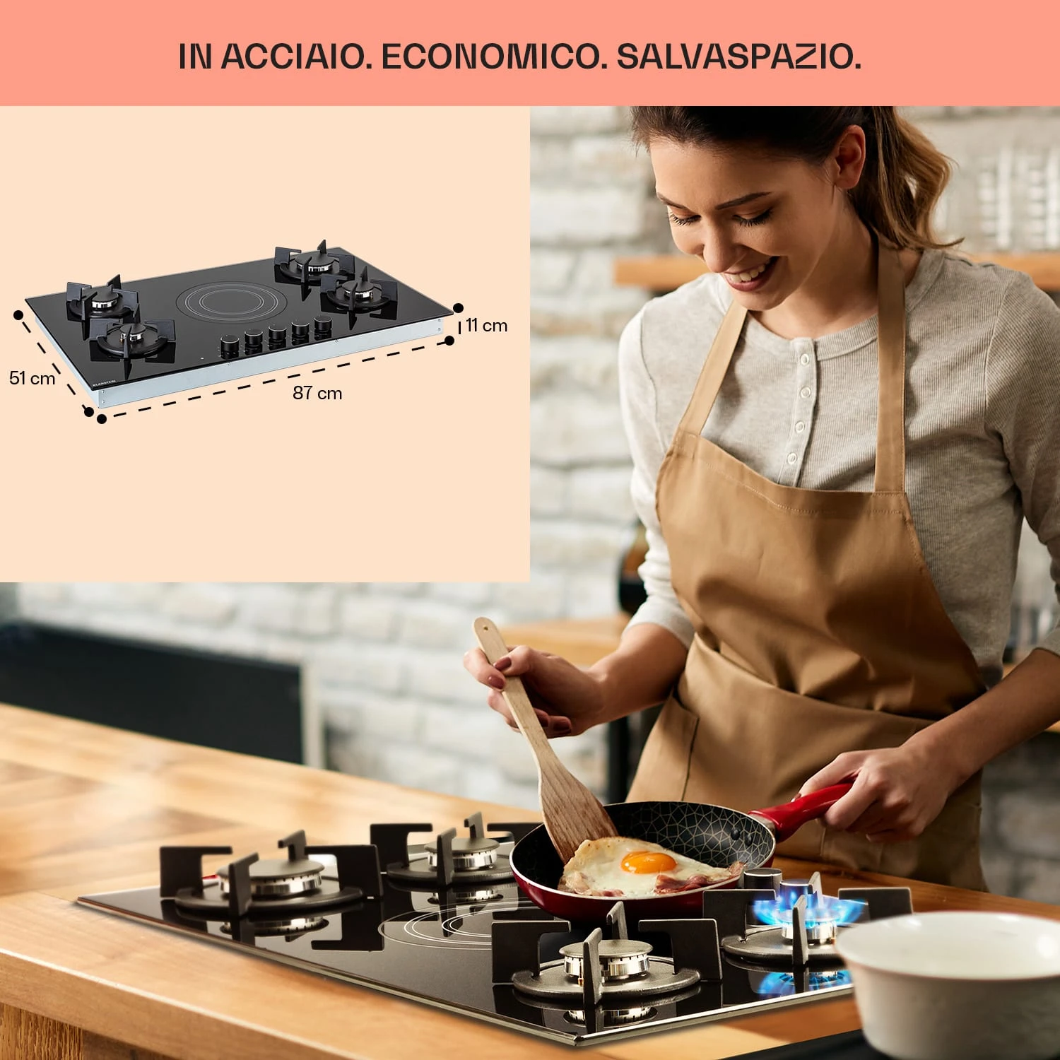 Il piano cottura a gas combinato MultiChef 5 di Klarstein è la fusione ideale di 4 piani cottura a gas e un piano cottura in vetroceramica per creare un vero multitalento. Con un totale di 9,2 kW di potenza, 4 diverse dimensioni di bruciatori e 4 supporti per pentole in ghisa, è perfettamente attrezzato per ogni pasto immaginabile. Si può facilmente regolare la portata della fiamma in qualsiasi momento, utilizzando le pratiche manopole di controllo. La superficie in vetroceramica temprato non solo ha un aspetto elegante, ma è anche meravigliosamente facile da pulire. Il sistema di accensione elettrica con protezione in caso di spegnimento della fiamma garantisce un utilizzo sicuro.