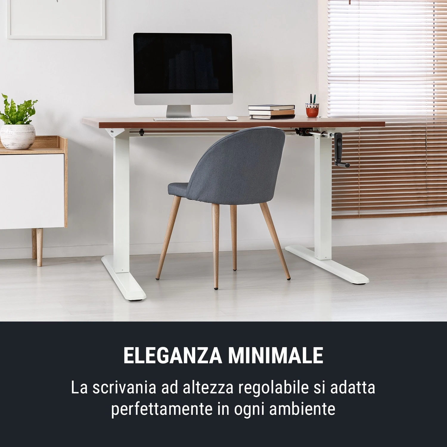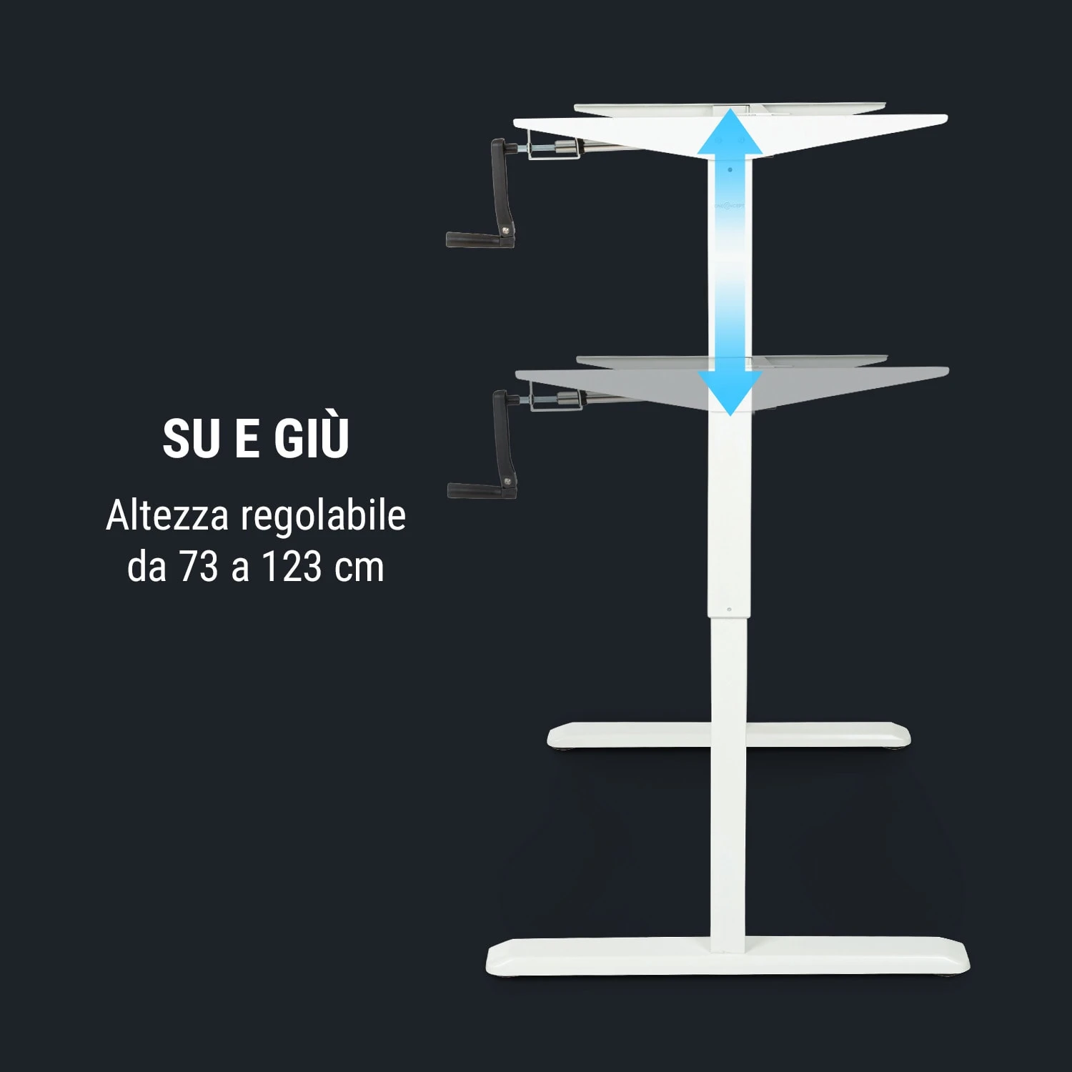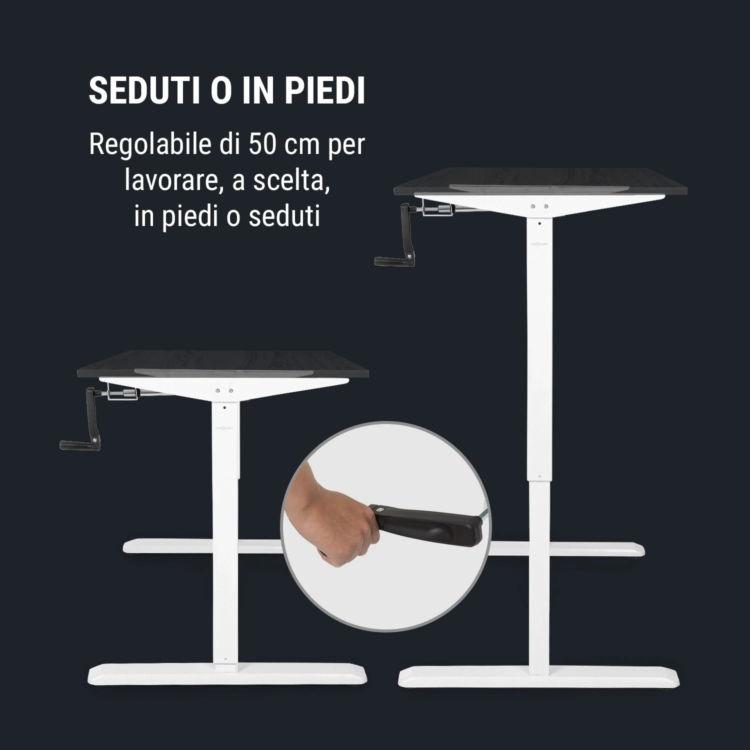Concedi al tuo corpo una postura sana: con la scrivania Multidesk di oneConcept è facilissimo. Con la nostra standing desk aumenti il rendimento corporeo, i muscoli accorciati si allungano di nuovo e si evitano posizioni sedute afflosciate. Una differenza che sentirai già dopo pochi giorni alla Multidesk quando i dolori alla schiena diminuiranno e il corpo sarà di nuovo elastico. E la cosa migliore: puoi svolgere le tue attività quotidiane un po’ da seduto e un po’ in piedi. Grazie al meccanismo manuale a manovella, il piano del tavolo sale o scende e si può regolare in altezza tra 73 e 123 cm. Per fare in modo che la manovella non stia tra i piedi, è possibile piegarla e nasconderla sotto al piano del tavolo.