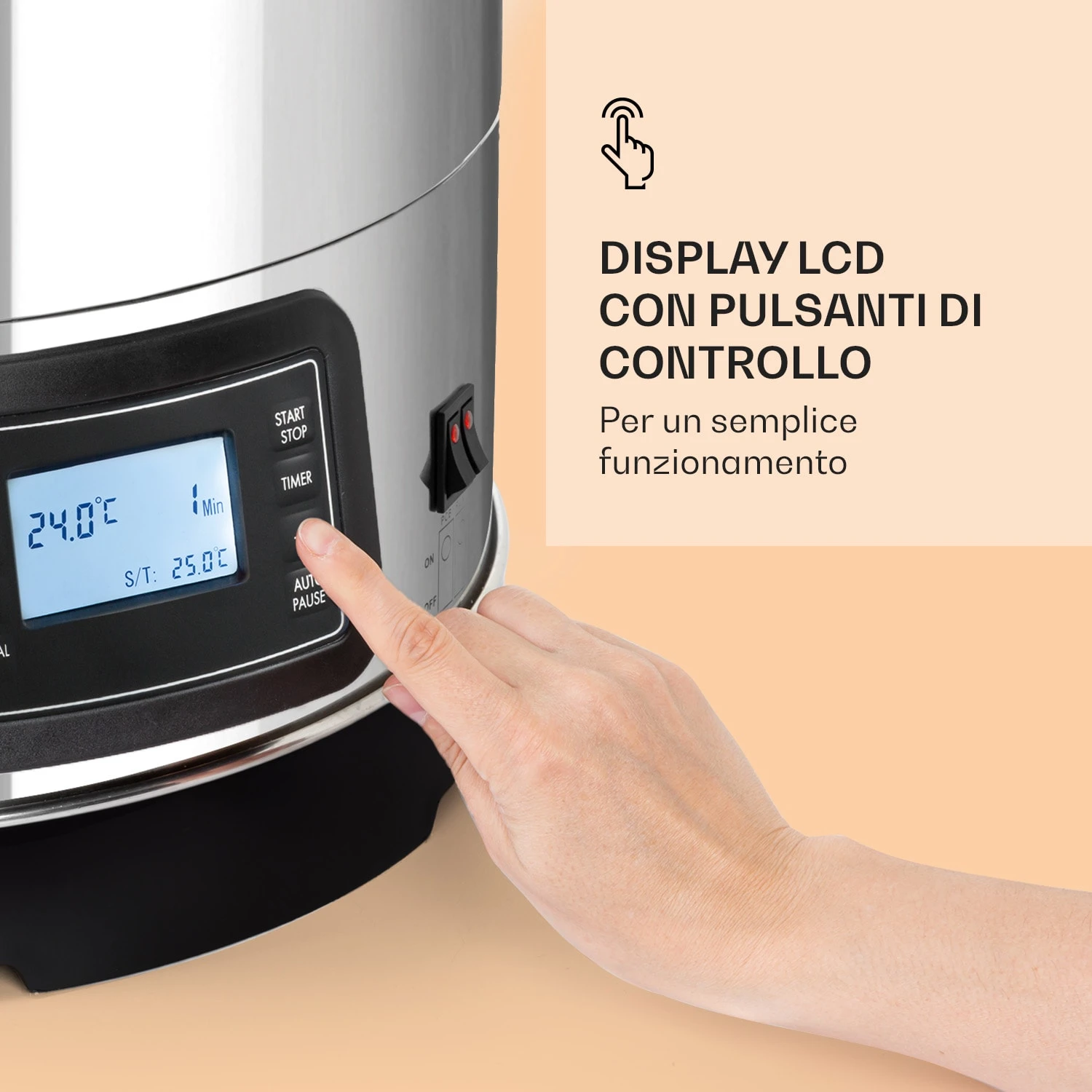 Chiara o scura, a fermentazione lenta o lunga, di frumento o pilsner: con la caldaia di ammostamento Mundschenk 3XL di Klarstein avrai tutto il necessario per preparare una birra fatta in casa da leccarsi il baffo. Puoi impostare con precisione la temperatura, il tempo di cottura e la potenza tramite un chiaro schermo LCD con pulsanti di controllo o affidare tranquillamente l’intero processo al sistema di automatico MemoryBrew.