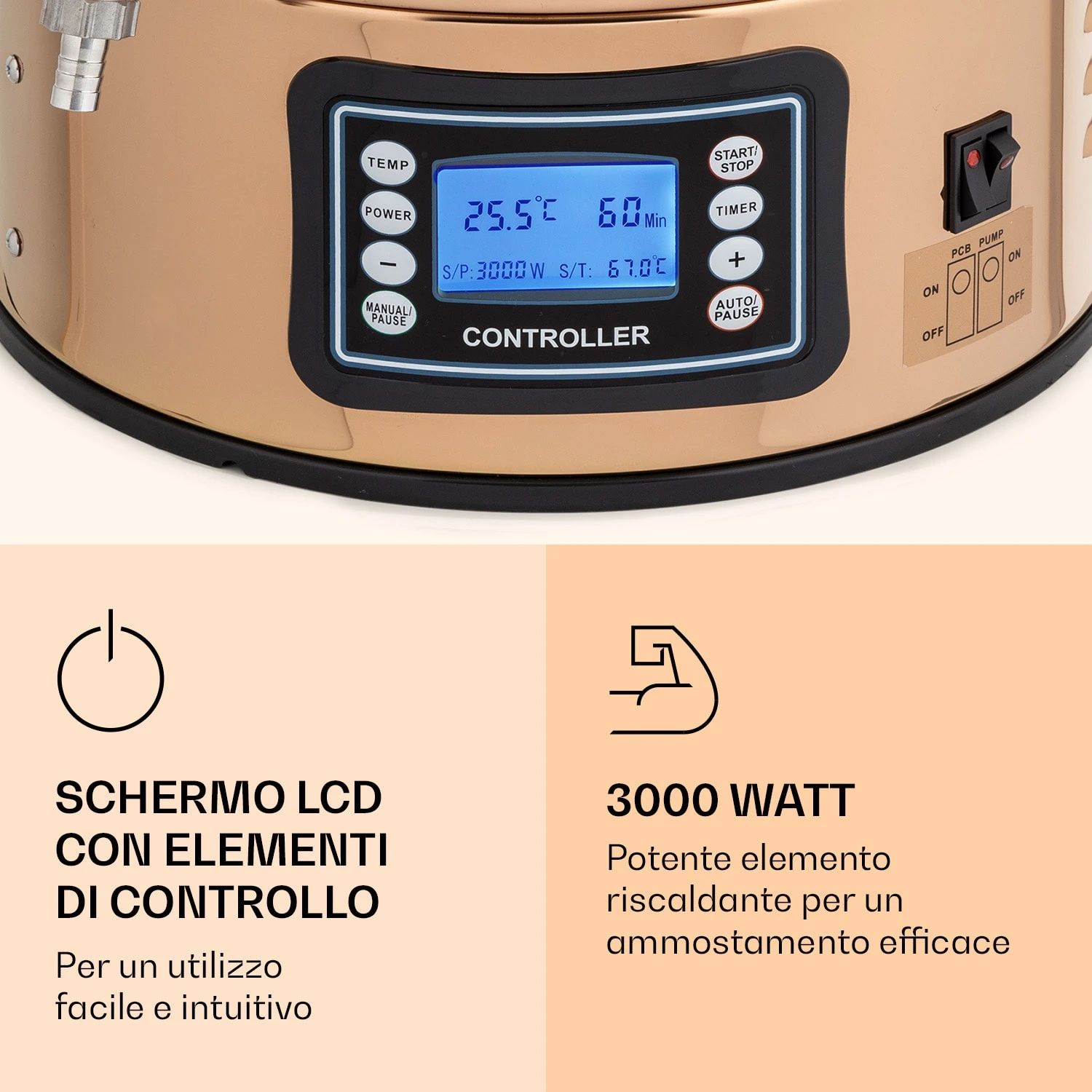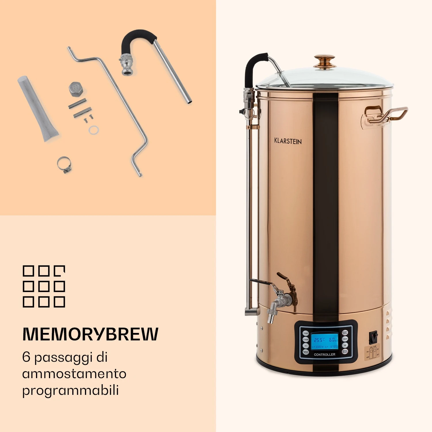 Chiara o scura, a fermentazione lenta o lunga, di frumento o pilsner: con la caldaia di ammostamento Mundschenk XXLdi Klarstein avrai tutto il necessario per preparare una birra fatta in casa da leccarsi il baffo. Puoi impostare con precisione la temperatura, il tempo di cottura e la potenza tramite un chiaro schermo LCD con pulsanti di controllo o affidare tranquillamente l’intero processo al sistema di automatico MemoryBrew.