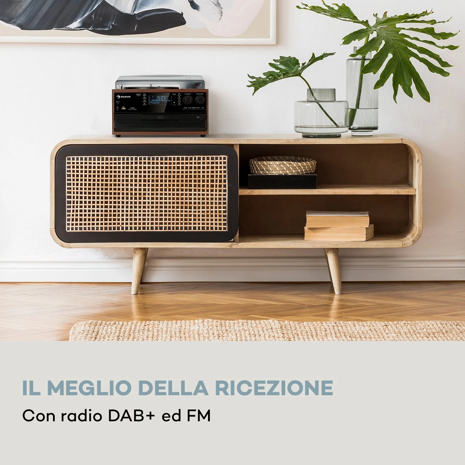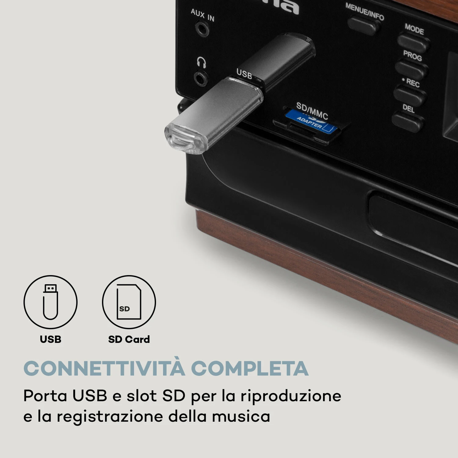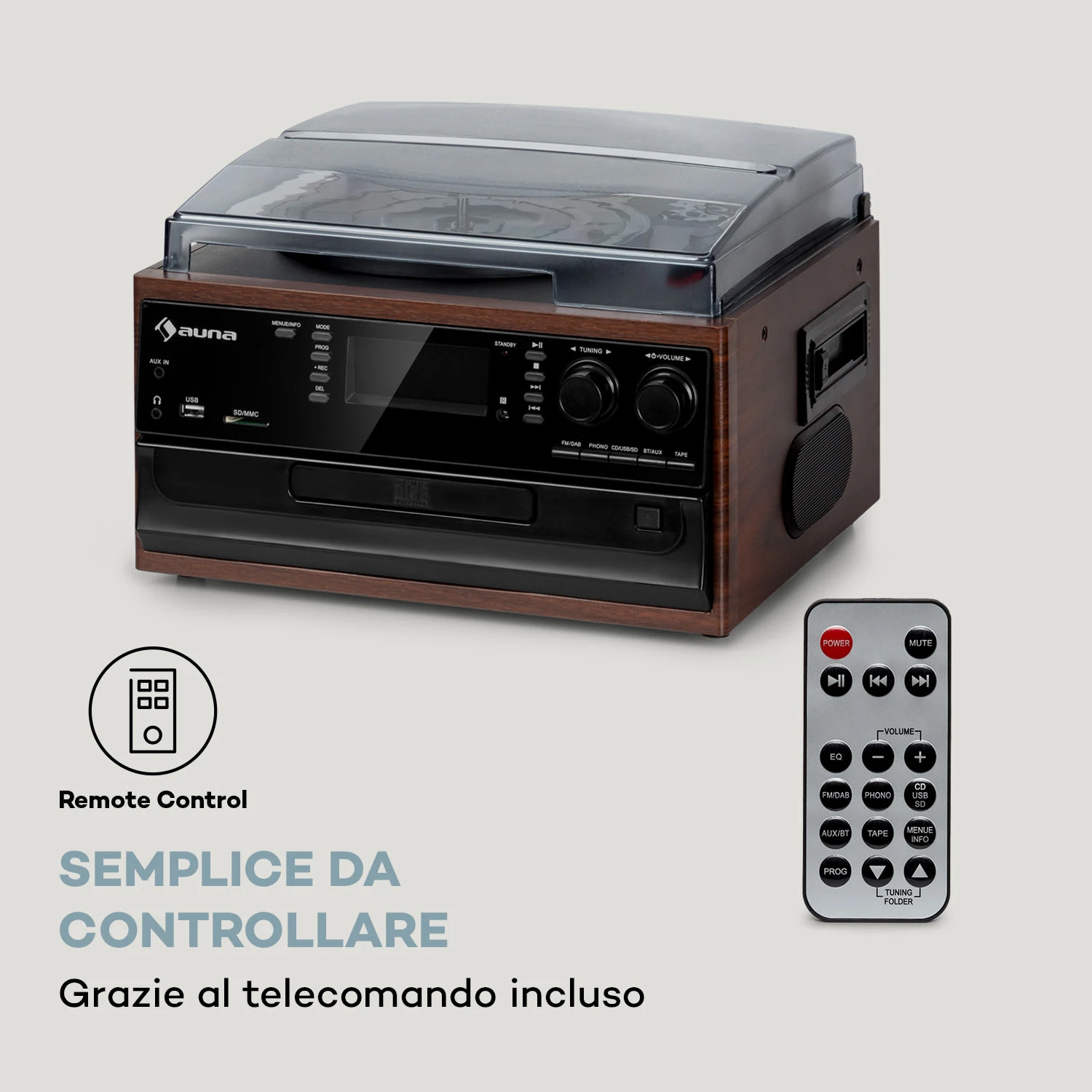 Il fulcro dell’impianto stereo vintage è il giradischi, che si nasconde sotto un coperchio protettivo. Insieme alla piastra a cassette installata sul lato e al lettore CD con capacità MP3, copre tutti i principali media musicali dall’inizio del XX secolo. Un giradischi con una trasmissione a cinghia e tre velocità di 33, 45 e 78 giri al minuto mantiene così il sistema stereo auna in rotazione continua, proprio come le cassette e i supporti CD. La connettività dell’unità alle moderne abitudini mediatiche è dimostrata dalle connessioni USB e SD incorporate nella parte anteriore, utilizzabili per registrare tracce audio da cassette, CD o dischi direttamente come file MP3 su supporti dati USB o SD senza troppe difficoltà. In futuro si troverà un sintonizzatore radio FM/DAB+ in grado di ricevere i segnali locali e le stazioni digitali in alta qualità sonora e senza disturbi. Tuttavia si può raggiungere l’era moderna solo grazie alla funzione Bluetooth, attraverso la quale tutti i file audio da smartphone o tablet possono essere riprodotti senza fili e comodamente tramite l’impianto stereo vintage Oakland DAB di auna. Grazie alle sue numerose funzioni e agli altoparlanti integrati, l’impianto stereo vintage Oakland DAB di auna si dimostra una soluzione hi-fi completa estremamente salvaspazio integrabile nelle zone living dagli spazi ridotti. Gli altoparlanti stereo integrati del sistema micro auna creano una potente immagine sonora che può essere sostenuta da un amplificatore hi-fi esterno attraverso l’uscita di linea.