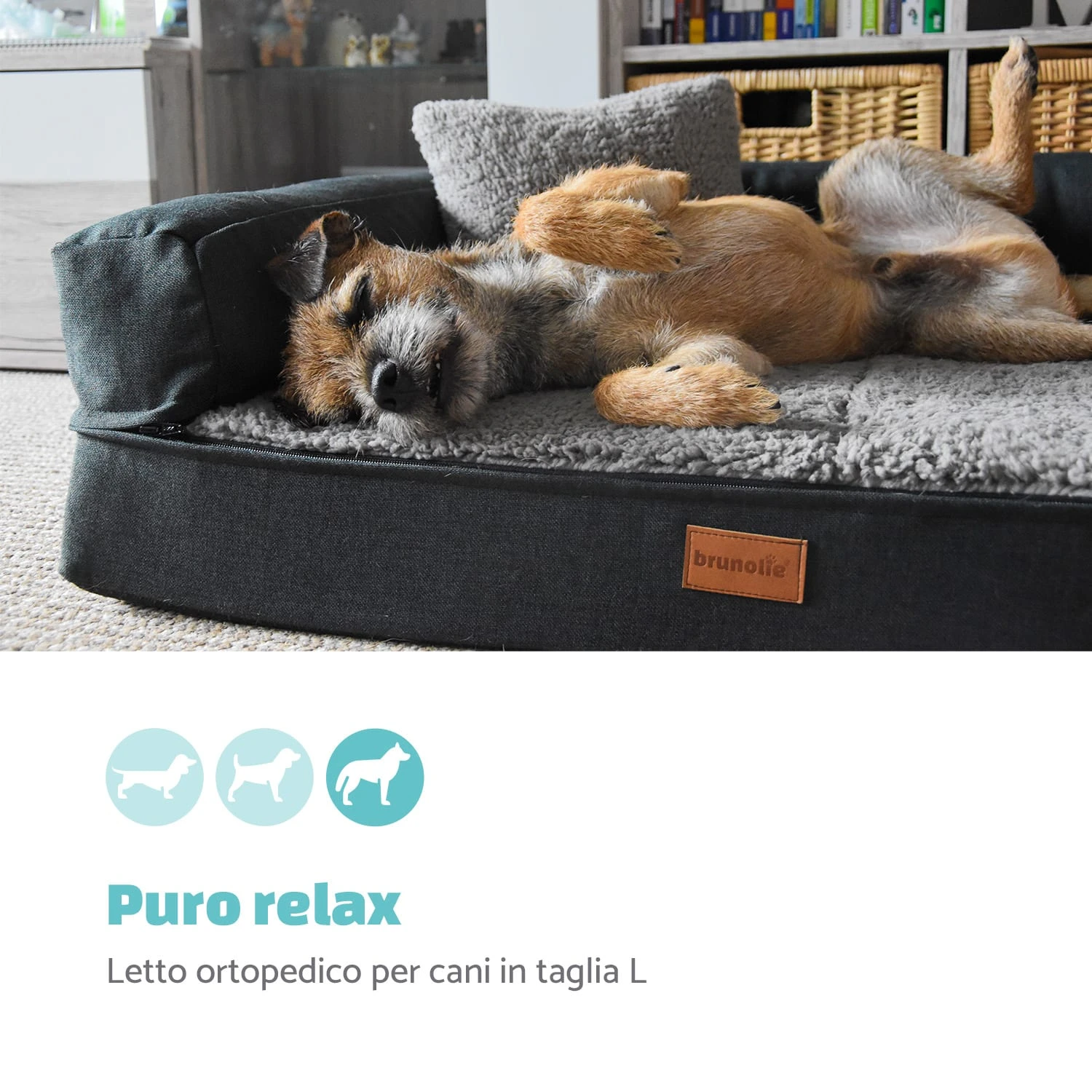 Con il nostro divanetto per cani Odin di Brunolie farete qualcosa di buono per il corpo e lo spirito dei vostri beniamini. Il lettino ortopedico si adatta perfettamente alla forma del corpo e assicura una riduzione della pressione nella zona della colonna vertebrale e delle articolazioni. Il sistema a 3 strati rende il lettino un luogo di riposo premium per il vostro cane. Il primo strato composto da comodo espanso spesso 6-8 cm isola dal pavimento e tiene il freddo lontano dai vostri amati compagni. Il nucleo in memory foam viscoelastica particolarmente densa non si limita ad adattarsi perfettamente al corpo dell’animale riducendo la pressione nella zona della colonna vertebrale e delle articolazioni, ma impedisce anche efficacemente la formazione di conche e la deformazione strutturale del divanetto per cani Odin. Il terzo strato in ovatta di alta qualità si trova subito sotto al rivestimento e assicura la circolazione dell’aria e la dissipazione del calore durante l’estate. In questo modo, si evita l’accumulo di calore, permettendo il massimo agio anche in giornate particolarmente calde. Grazie allo schienale, agli appoggi laterali rimovibili e al cuscino reversibile, i vostri cuccioloni avranno numerose possibilità di accomodarsi sul loro trono e di poggiare la testa per il massimo comfort.
