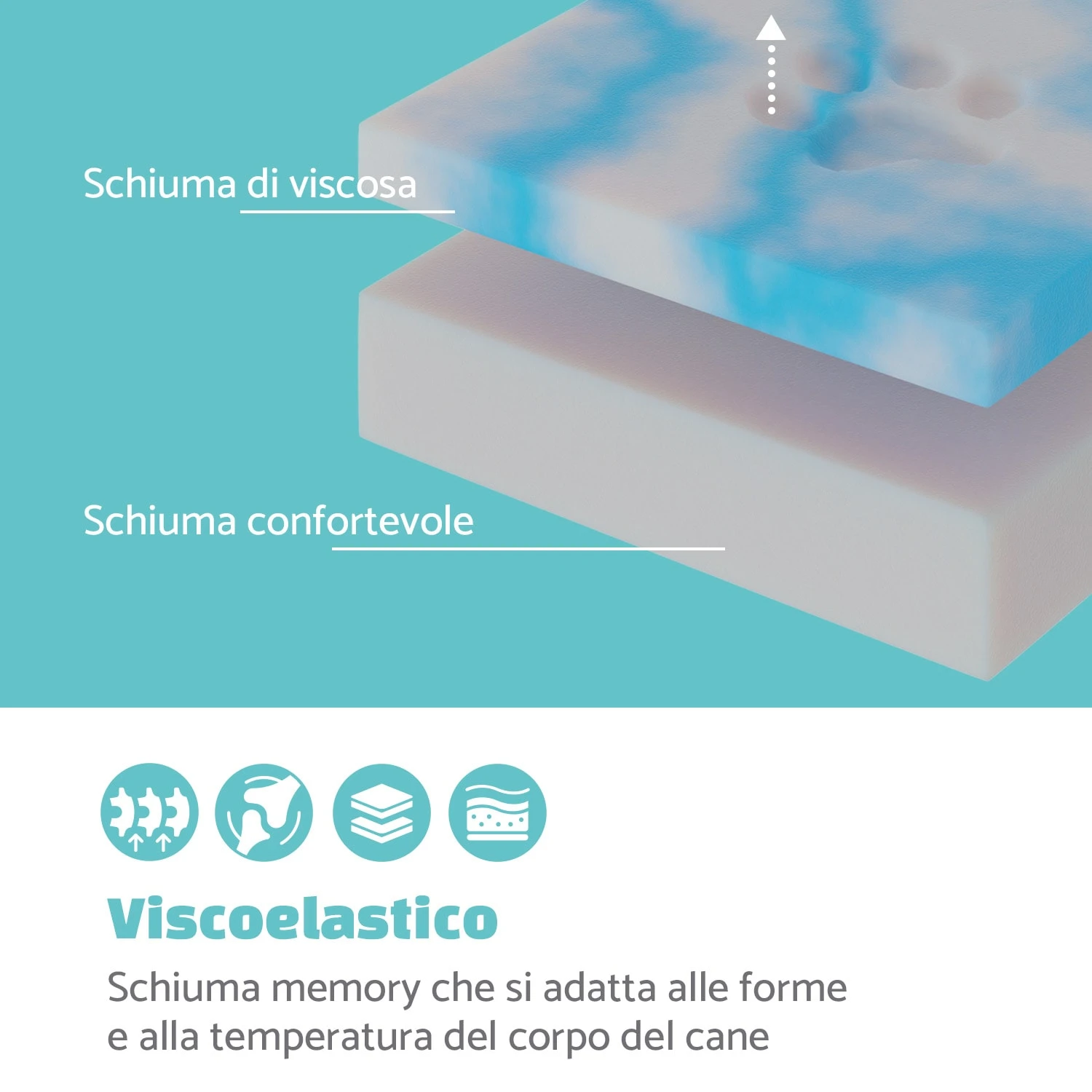 La schiuma viscoelastica, nota anche come memory foam, presenta caratteristiche uniche: si adatta perfettamente ai contorni del corpo del vostro cane, dato che la schiuma reagisce alla pressione e alla temperatura corporea. In questo modo il cane potrà stendersi in maniera ortopedicamente corretta, senza il rischio di problemi circolatori.