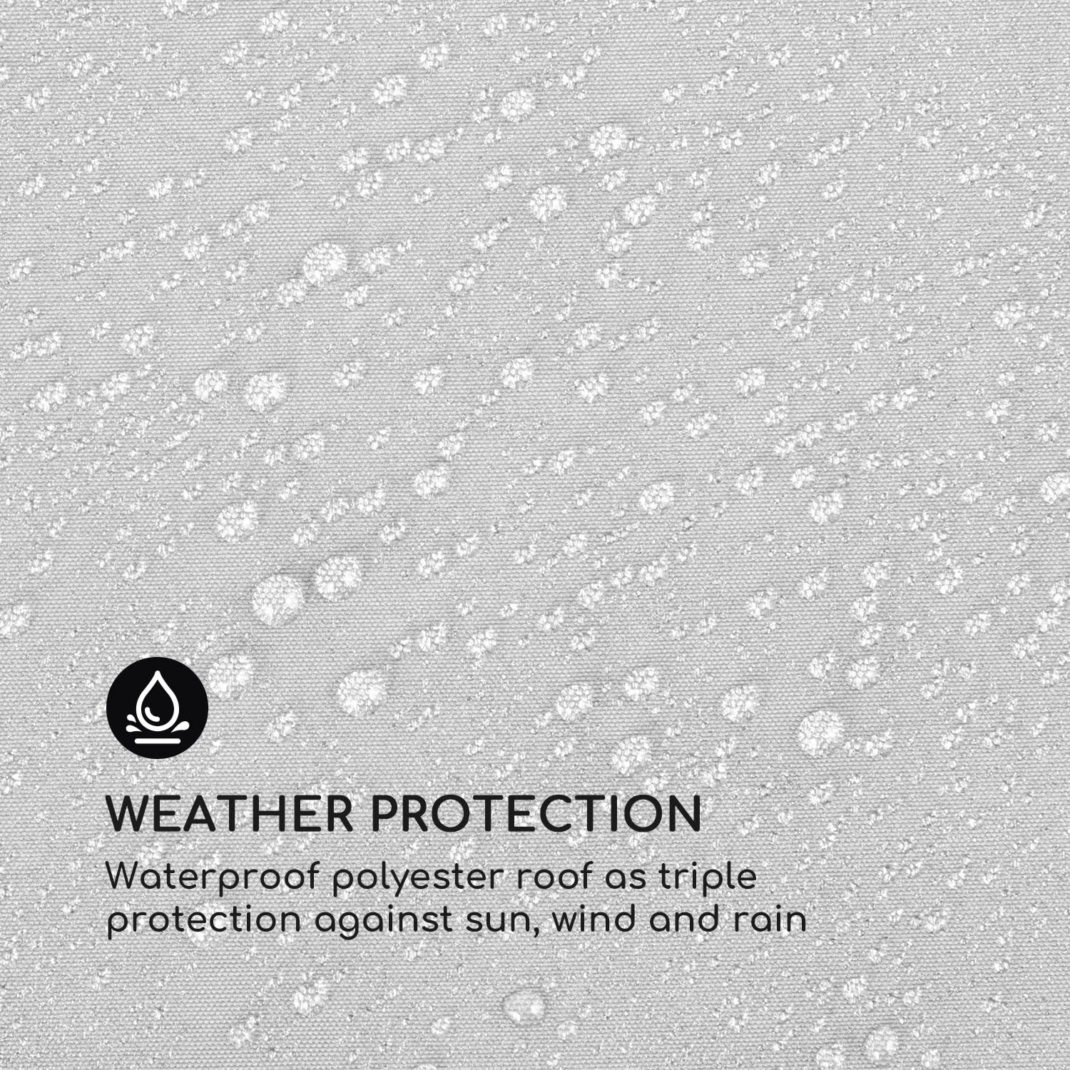 Sotto al tettuccio flessibile sei protetto da pioggia, vento e sole. La particolarità: è fissato alla struttura con ganci di scorrimento e dispone di un raffinato sistema con comando a cavo flessibile. Così puoi alzare e abbassare comodamente il telone tramite il comando a cavo flessibile. Goditi le tue ore di sole con il tettuccio aperto o parzialmente aperto!