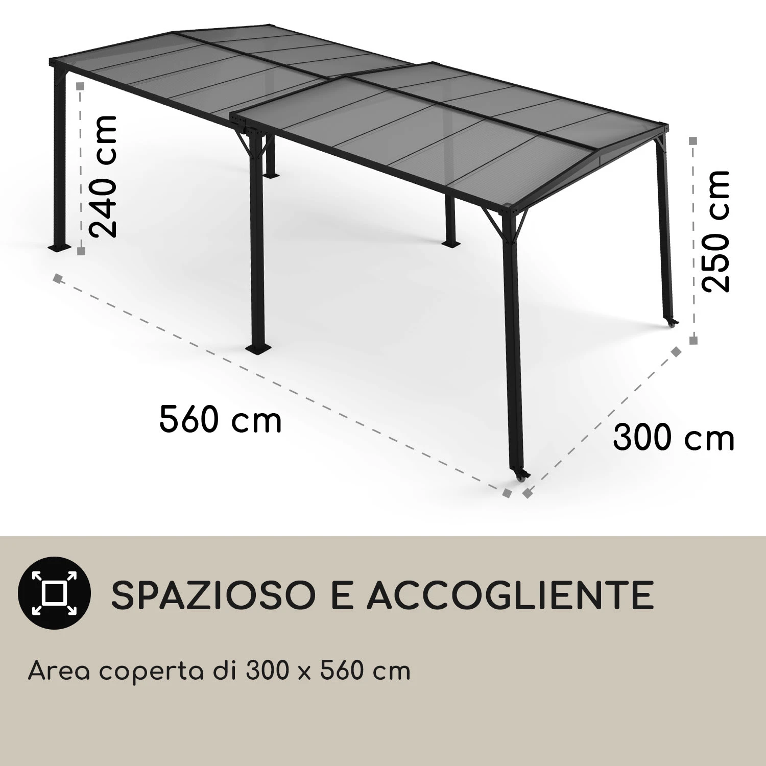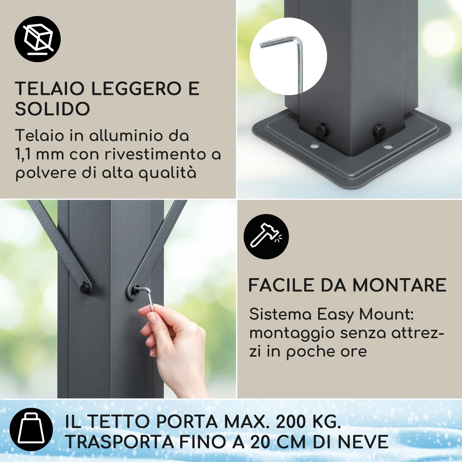 Bello, stabile e flessibile: così deve essere un gazebo da giardino per far sì che la permanenza in giardino o sul terrazzo diventi un’avventura. Il gazebo Pantheon Solid Sky Expand di Blumfeldt supererà le tue aspettative: la pergola 3 x 5,6 m (dimensioni max.) fa una bellissima figura con il suo design modesto e la tonalità delicata. La sua struttura formata da barre d’alluminio verniciate a polvere le conferisce un’elevata stabilità ed è particolarmente leggera allo stesso tempo. Inoltre il gazebo convince grazie al facile montaggio senza attrezzi aggiuntivi. A fornire la miglior protezione in tutte le posizioni ci pensa il tetto leggermente inclinato composto da lastre in policarbonato da 6 mm idrorepellenti e leggermente colorate. In questo modo la pioggia non ha nessuna possibilità di rovinare il buon umore. Grazie ai suoi due pali con rotelle è possibile regolare flessibilmente e facilmente la dimensione del tetto. Inoltre il gazebo può essere sfruttato come carport o riparo per biciclette o attrezzi da giardinaggio.