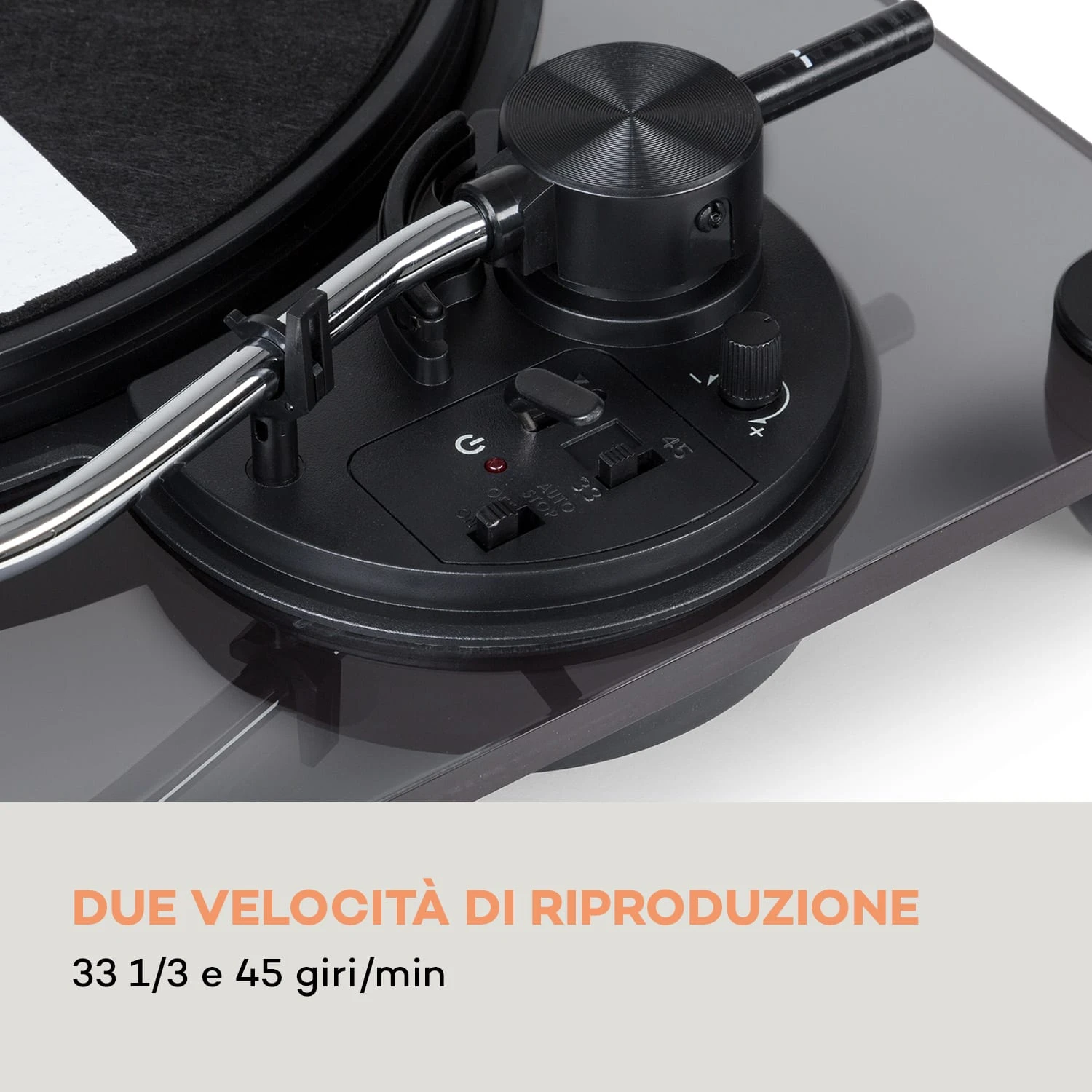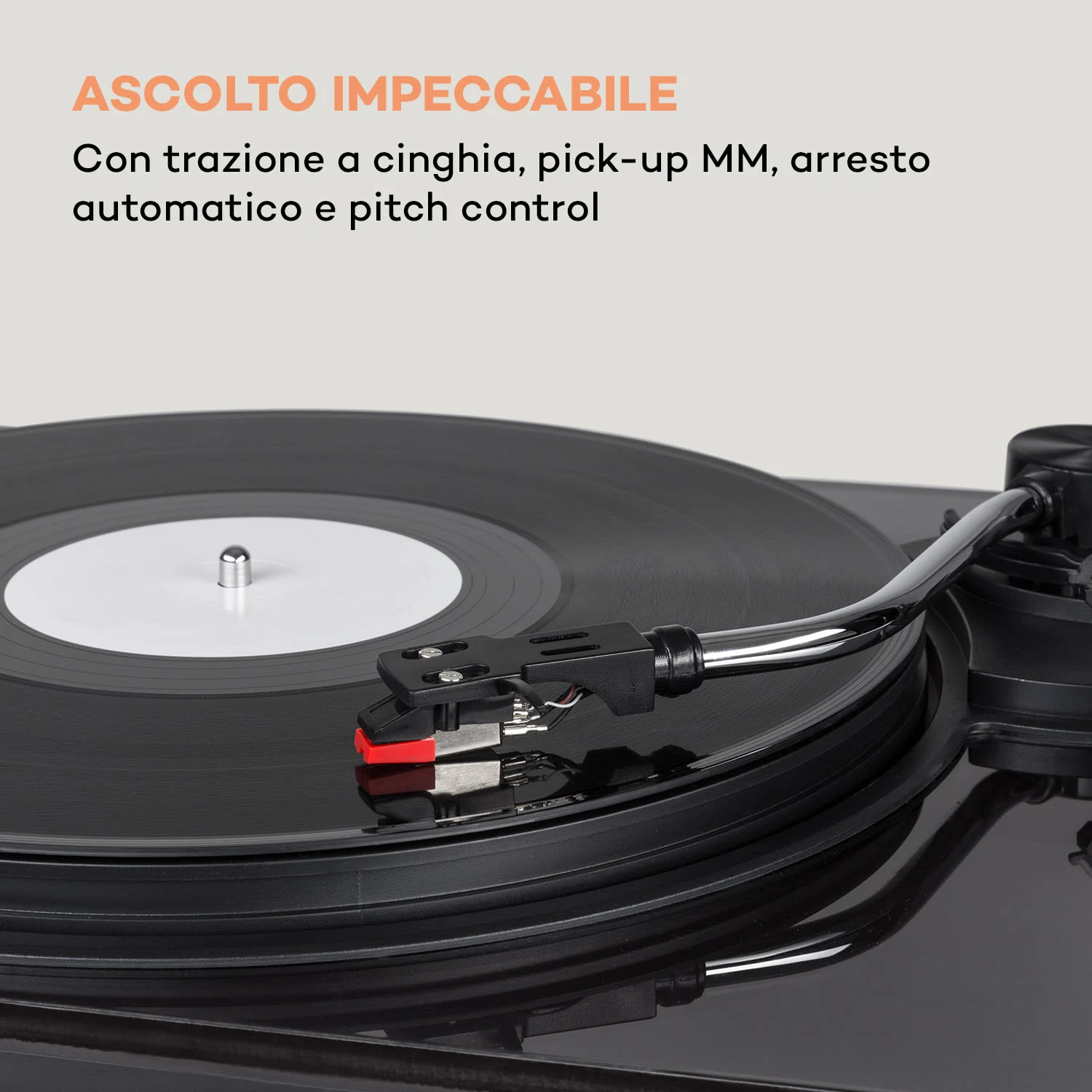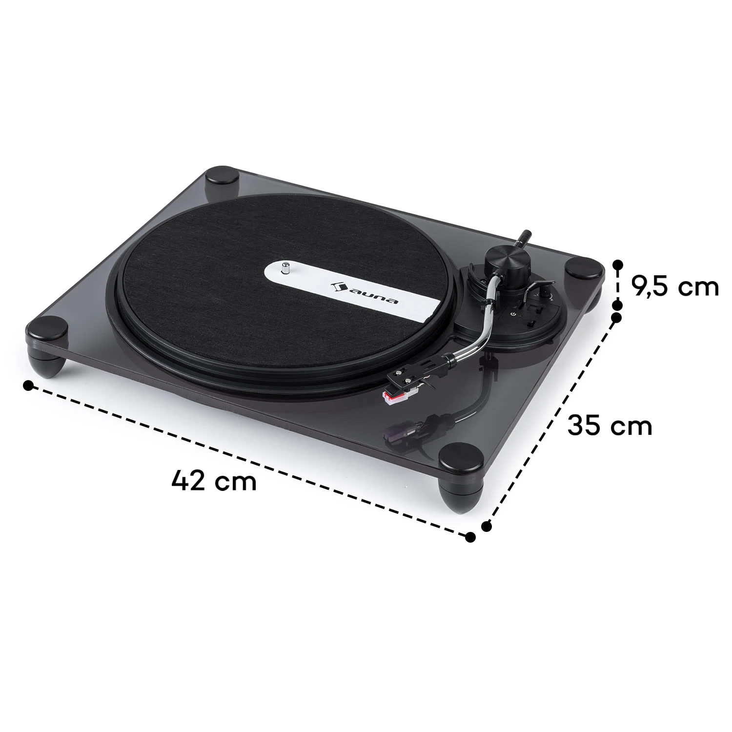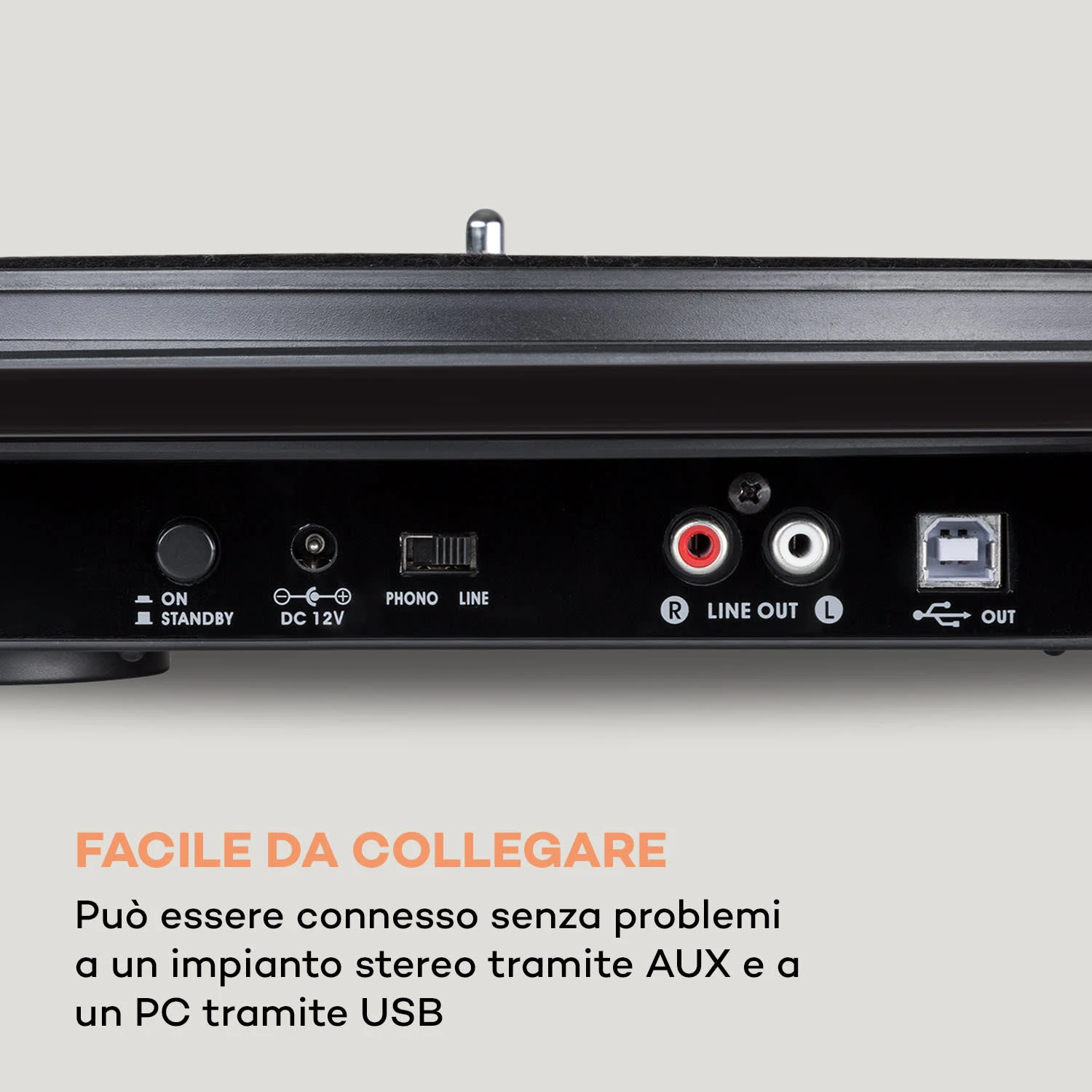 Il giradischi Pureness di auna fornisce solo la musica migliore. Con la trasmissione a cinghia fa girare in modo silenzioso i dischi da 33 1/3 o 45 giri/min. Il sistema pick-up MM garantisce il suono migliore. Con il Pitch Control si può regolare la velocità di rotazione. Inoltre il giradischi consente la registrazione e la conversione dei giradischi in MP3: basta collegare il dispositivo tramite cavo USB al proprio PC. Con un software scaricabile gratuitamente si possono compilare semplicemente canzoni MP3 da vinili.