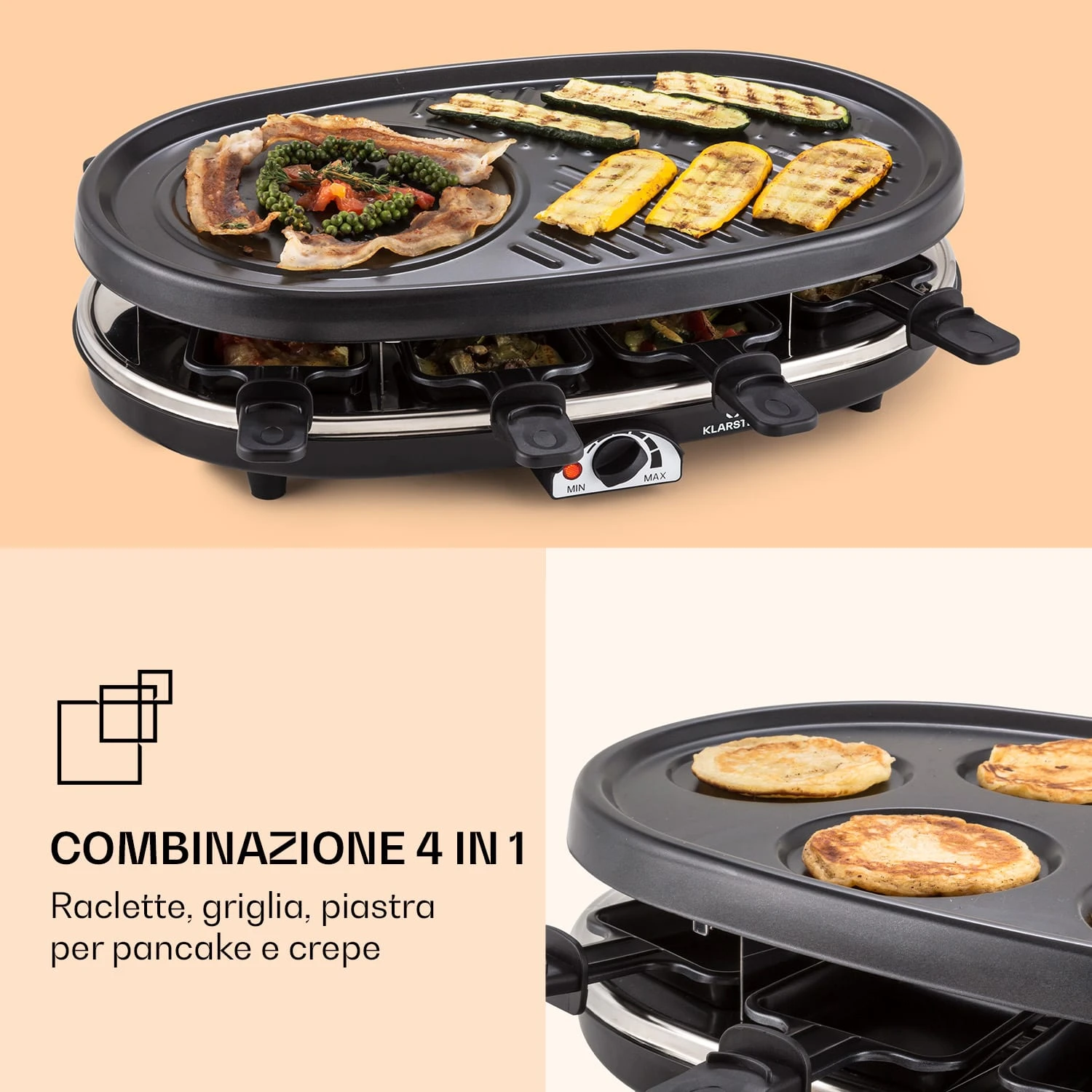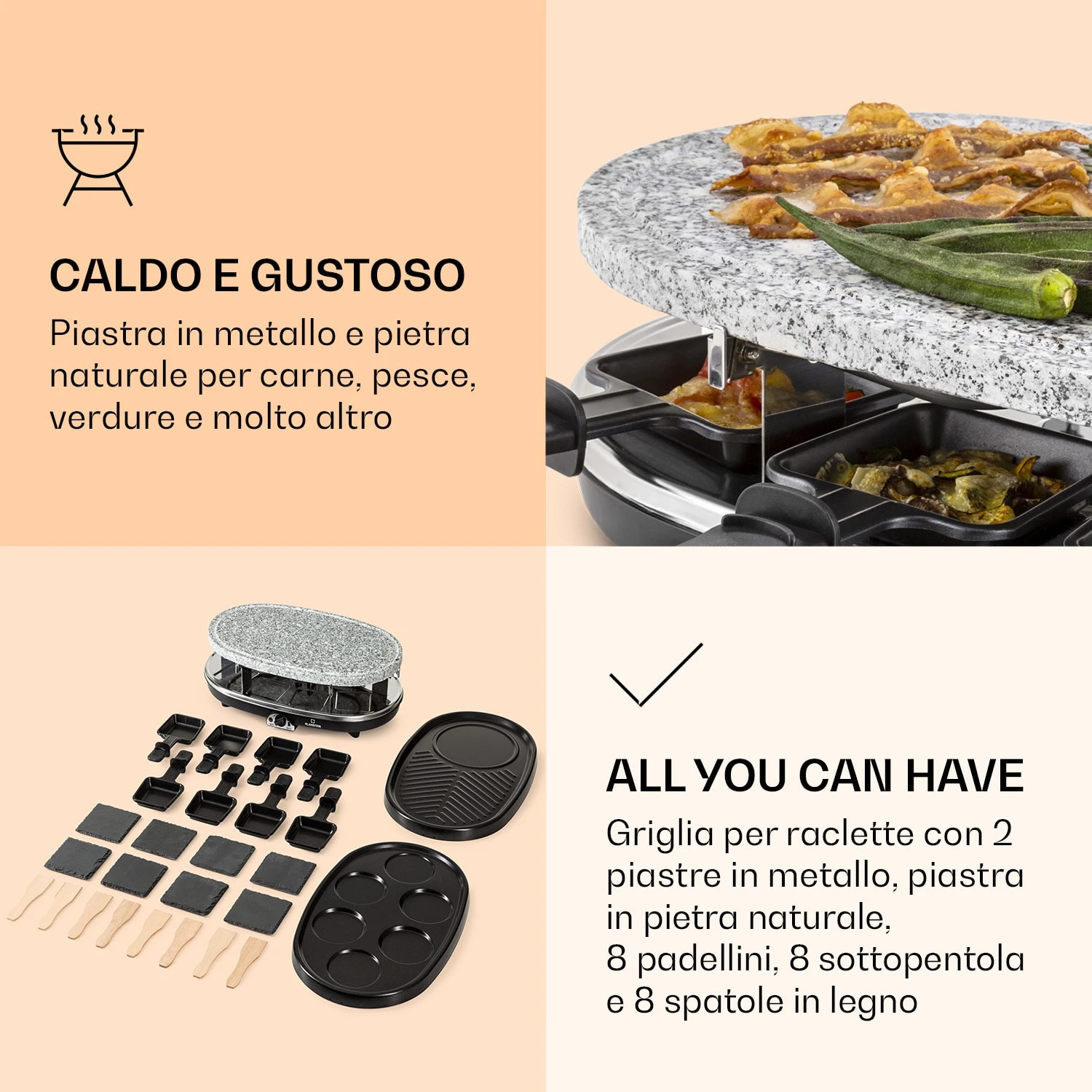 Festeggiate come a Capodanno: con la raclette All-U-Can-Grill potete deliziare 8 bocche contemporaneamente con le migliori prelibatezze in ogni occasione. Che sia una classica serata da raclette, di carne e verdure finemente grigliate, di crepes salate o di pancake dolci, questa griglia raclette vi offre proprio quello che il suo nome promette: All-U-Can-Grill. La piastra di pietra naturale permette di grigliare senza grasso e può facilmente essere scambiata con le piastre di metallo leggero per pancake, crepes o per grigliate convenzionali. Le sottostanti bobine di riscaldamento da 1500 watt promettono successo assicurato.