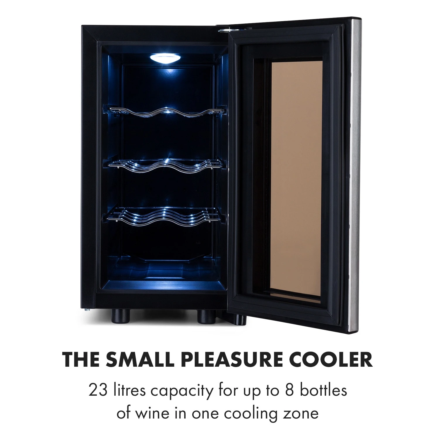 Nella sua zona di raffreddamento da 23 litri, la cantinetta frigo per vini Reserva 8 Slim Uno di Klarstein conserva fino a 8 bottiglie di vino alla temperatura ideale per degustazioni impeccabili. Quattro livelli di stoccaggio con tre ripiani in metallo estraibili e un’illuminazione interna LED attivabile assicurano una presentazione incredibilmente raffinata. Con l’aiuto del pannello touch e dello schermo LCD sul lato esterno dello sportello è possibile impostare individualmente la temperatura tra 11 e 18 °C con la massima comodità.