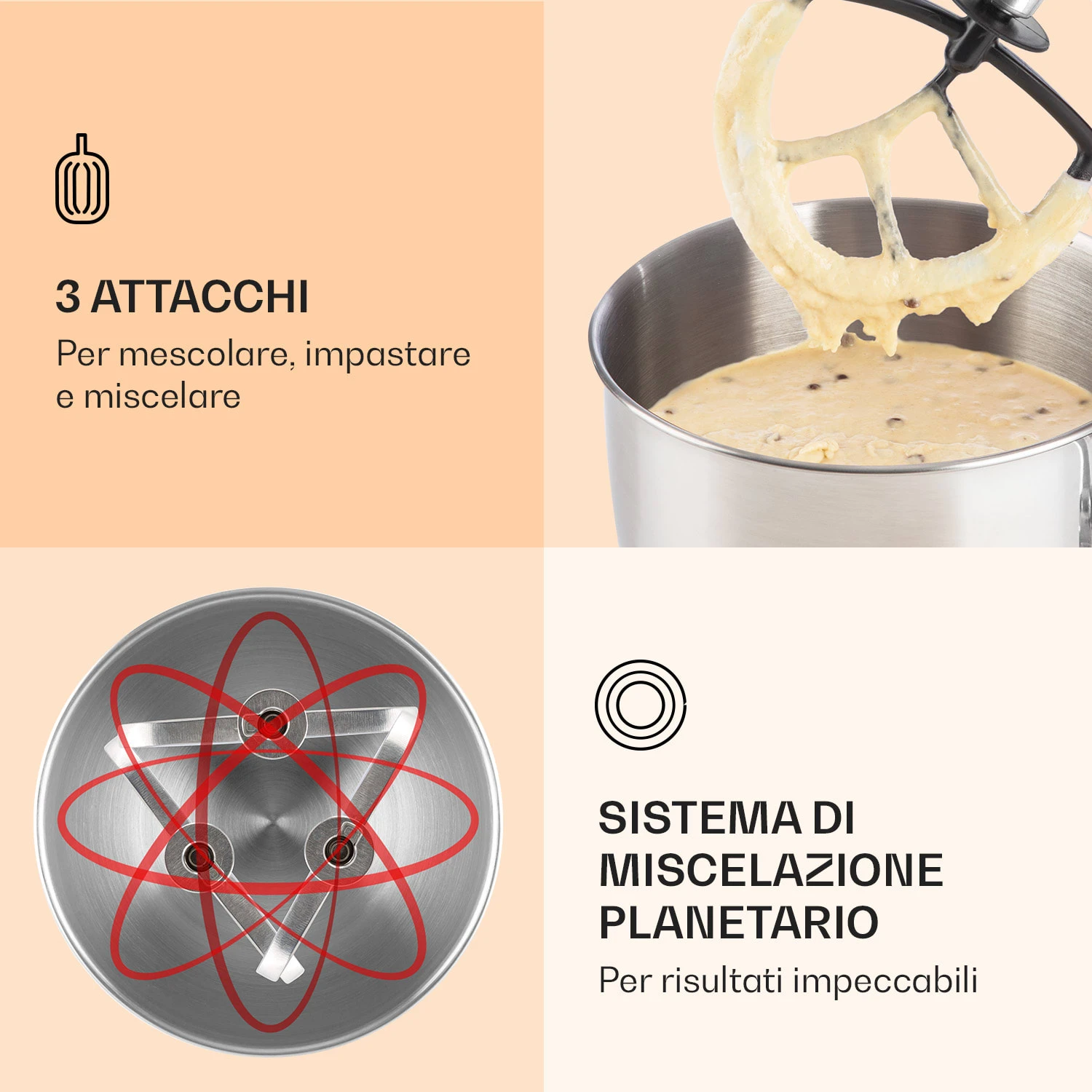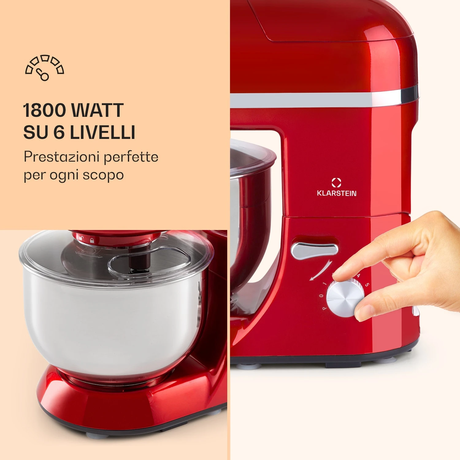 Il robot da cucina 3-in-1 Lucia Elegance di Klarstein è il talento versatile per la cucina: con un’impastatrice per impastare, amalgamare o montare, un frullatore per tritare e mescolare , e un tritacarne per il macinato fresco, per salsicce fatte in casa o deliziose varietà di pasta. Con 2000 watt, 6 velocità e il collaudato sistema di mescolamento planetario di Klarstein, supera facilmente tutte le sfide della cucina moderna. Anche le grandi quantità non sono un problema: grazie alla ciotola di miscelazione in acciaio inossidabile da 5 litri e alla brocca del frullatore da 1,5 litri. Il robot da cucina è anche bello da vedere: con il suo alloggiamento dal design compatto, l’impastatrice Lucia Elegance di Klarstein fa una gran figura nella vostra cucina.