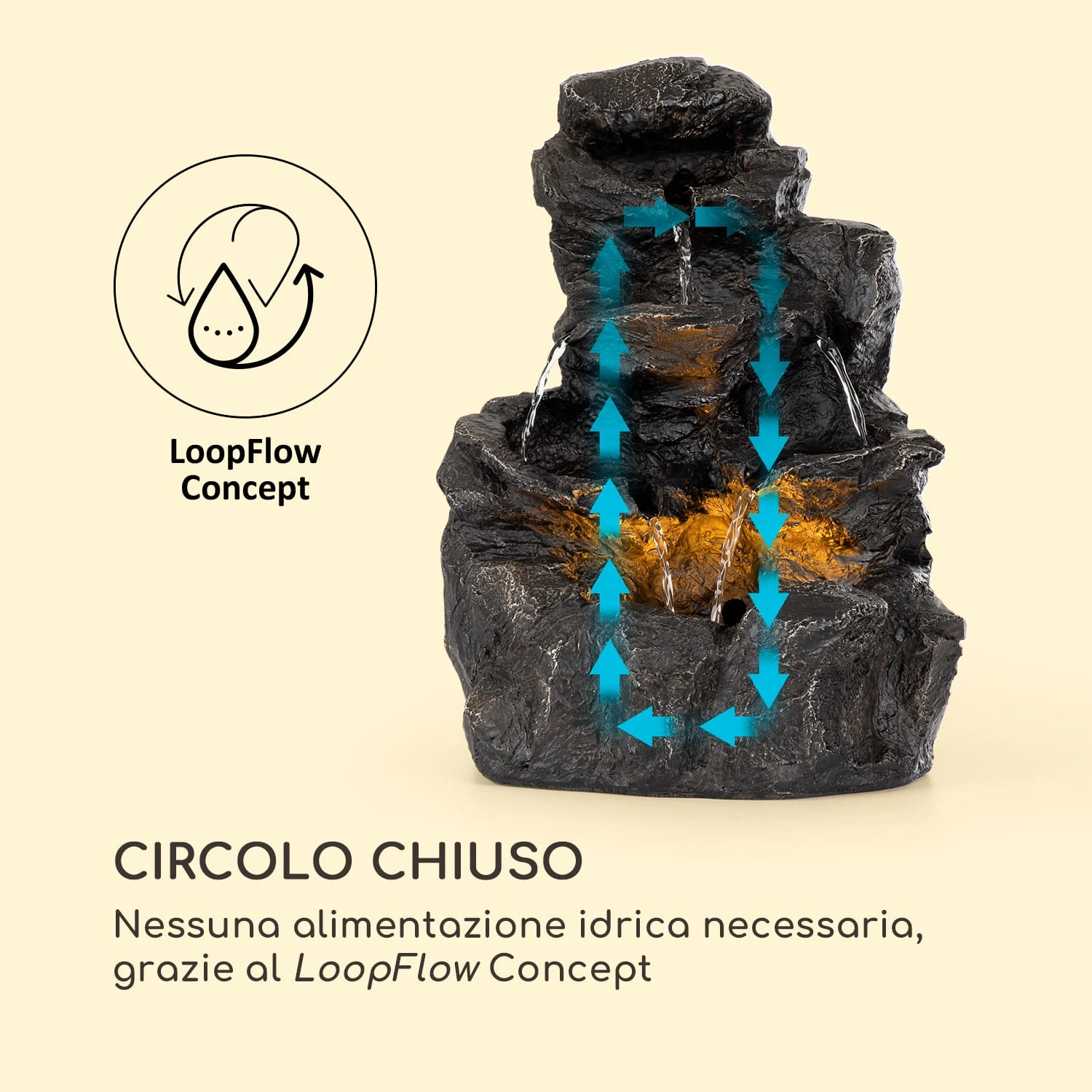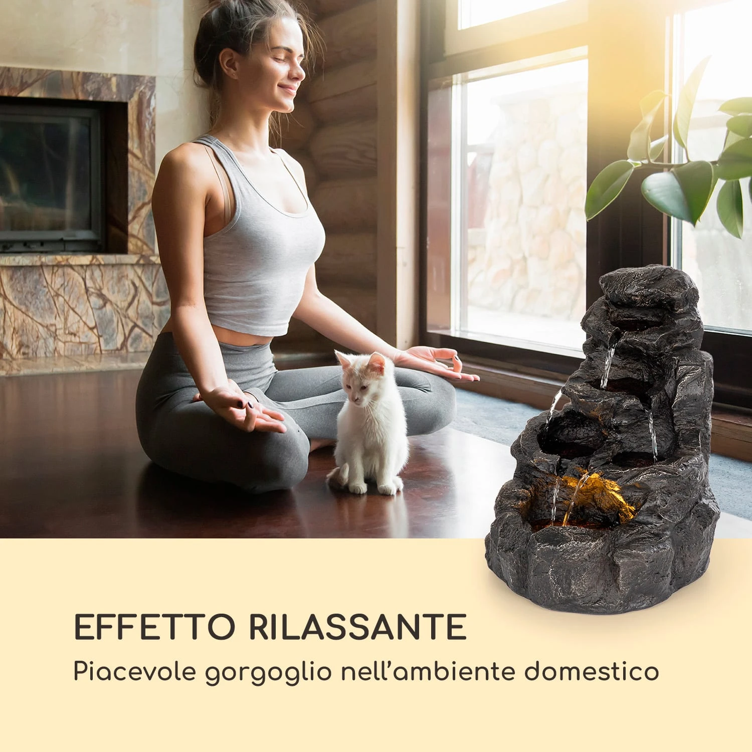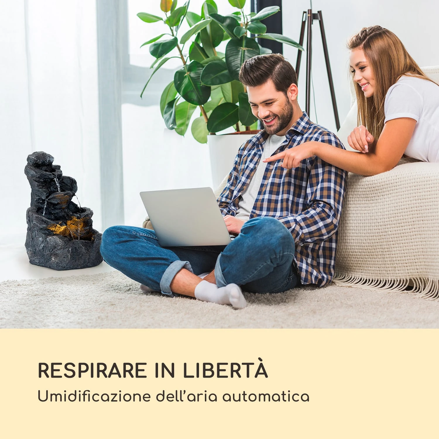 Grazie al materiale in poliresina che sembra pietra vera, la fontana non è soltanto una gioia per gli occhi, ma è anche resistente ai raggi UV, al gelo ed è estremamente robusta. Nonostante il suo peso esiguo, è molto stabile anche nelle giornate ventose. Oltre al lieve sciabordio dell’acqua, la fontana da giardino Rocky Waters ha un’illuminazione a LED, che rischiara suggestivamente la scena e la rende la punta di diamante in qualsiasi luogo di installazione. In casa la fontana, oltre ad avere un effetto rilassante, ha anche un effetto positivo sulla salute: umidifica automaticamente l’aria, migliora le condizioni ambientali e fa respirare meglio.