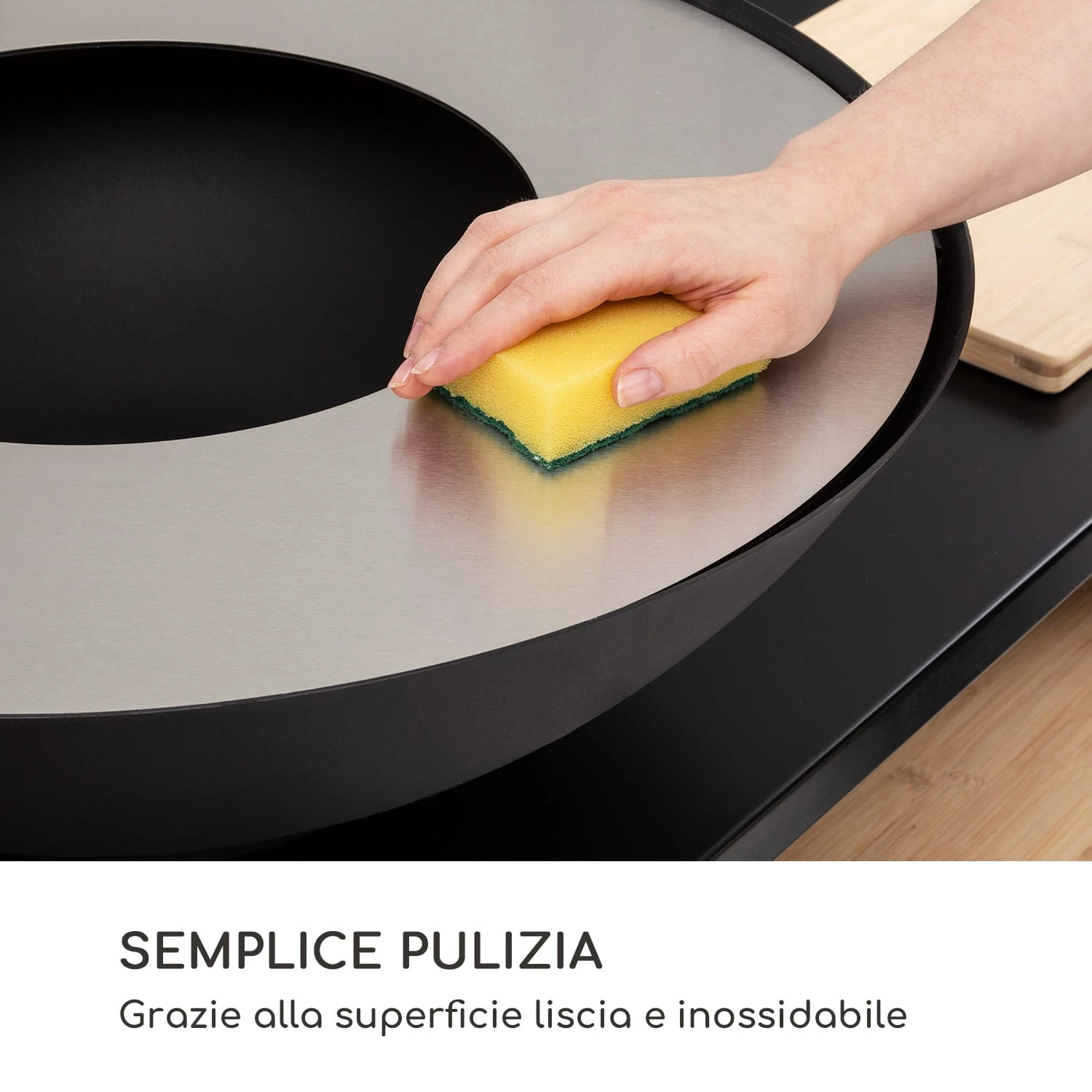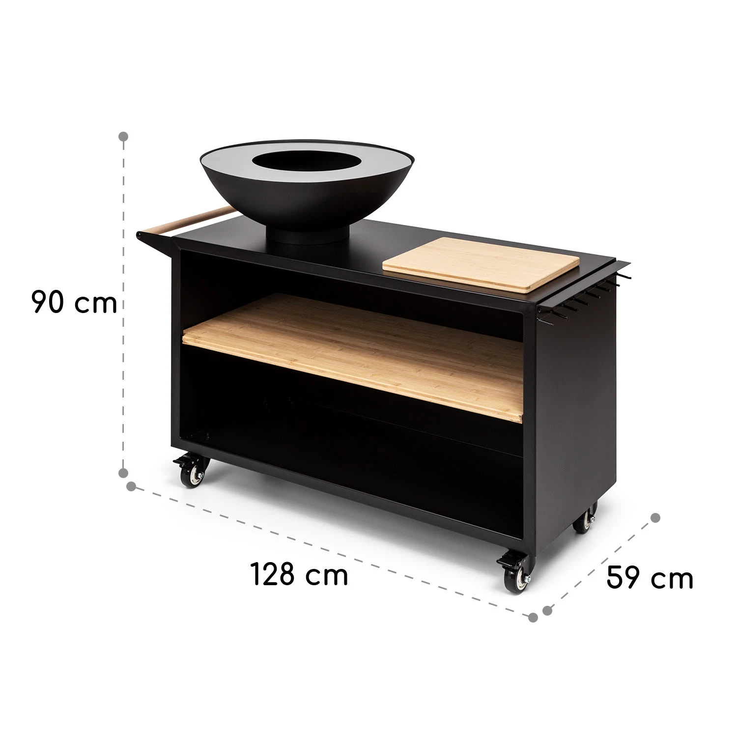 L’elegante braciere dal diametro di circa 59 cm è realizzato interamente in acciaio, protetto dall’acqua e dal gelo e, grazie ad uno spessore del materiale di 2 mm, anche decisamente leggero. La stabile base è perfetta per riporre comodamente la legna da barbecue o il carbone, grazie al suo ripiano in bambù. Il tagliere incluso è ideale anche per preparare cibi alla griglia, come verdure o carne. Mettendo la griglia ad anello in acciaio smaltato sulla parte superiore, il tremolio del fuoco è un po’ limitato, ma il calore della brace e le deliziose salsicce, bistecche o spiedini di verdure possono facilmente compensare questa perdita. Sono incluse anche 4 rotelle con freni di stazionamento per un facile spostamento, nonché una copertura resistente alle intemperie che tiene l’unità 2-in-1 sempre protetta dal vento e dalla pioggia.