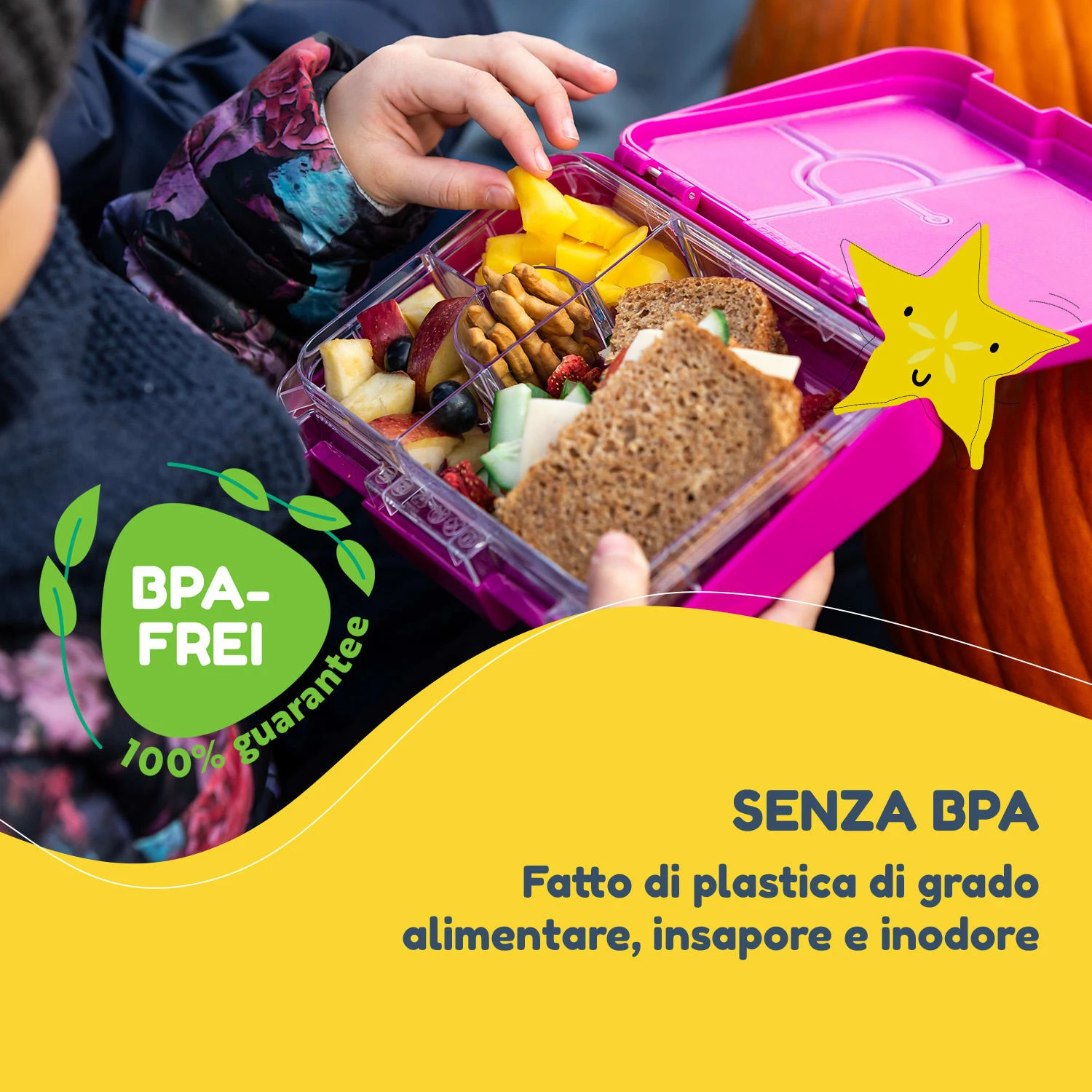 A scuola o all’asilo: nella lunchbox schmatzfatz junior di Klarstein ogni pietanza rimane fresca e gustosa! Grazie al pratico inserto, tutte le pietanze possono essere conservate separatamente. Non si mischia nulla: la frutta sa di frutta, gli affettati di affettati e il formaggio di formaggio. I piccoli separatori nell’inserto assicurano l’aroma perfetto. Tagliate a pezzettini e posizionate nei diversi scomparti, potrete rendere frutta e verdura ancora più belle e invitanti per i vostri piccini! Per un’alimentazione sana e ricca di vitamine tutti i giorni, per una gita fuoriporta o per uno spuntino al parco giochi.