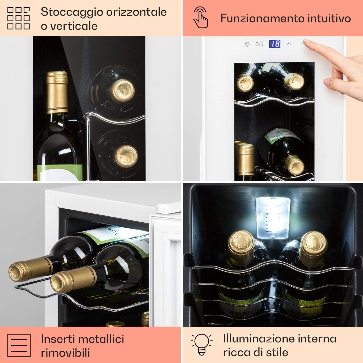 Per amor del vino: il frigorifero per vini Shiraz 12 Slim Uno di Klarstein assicura degustazioni impeccabili dei tuoi vini a temperature perfette. Assicura anche le condizioni ideali per la conservazione a lungo termine di vini pregiati. Grazie allo sportello panoramico in vetro e all’illuminazione LED interna bianca, potrai anche presentare le tue scorte di vino con la massima raffinatezza. Grazie al pannello touch, tutte le impostazioni sono intuitive ed è possibile selezionare con la massima precisione una temperatura di raffreddamento tra 5 e 18 °C.