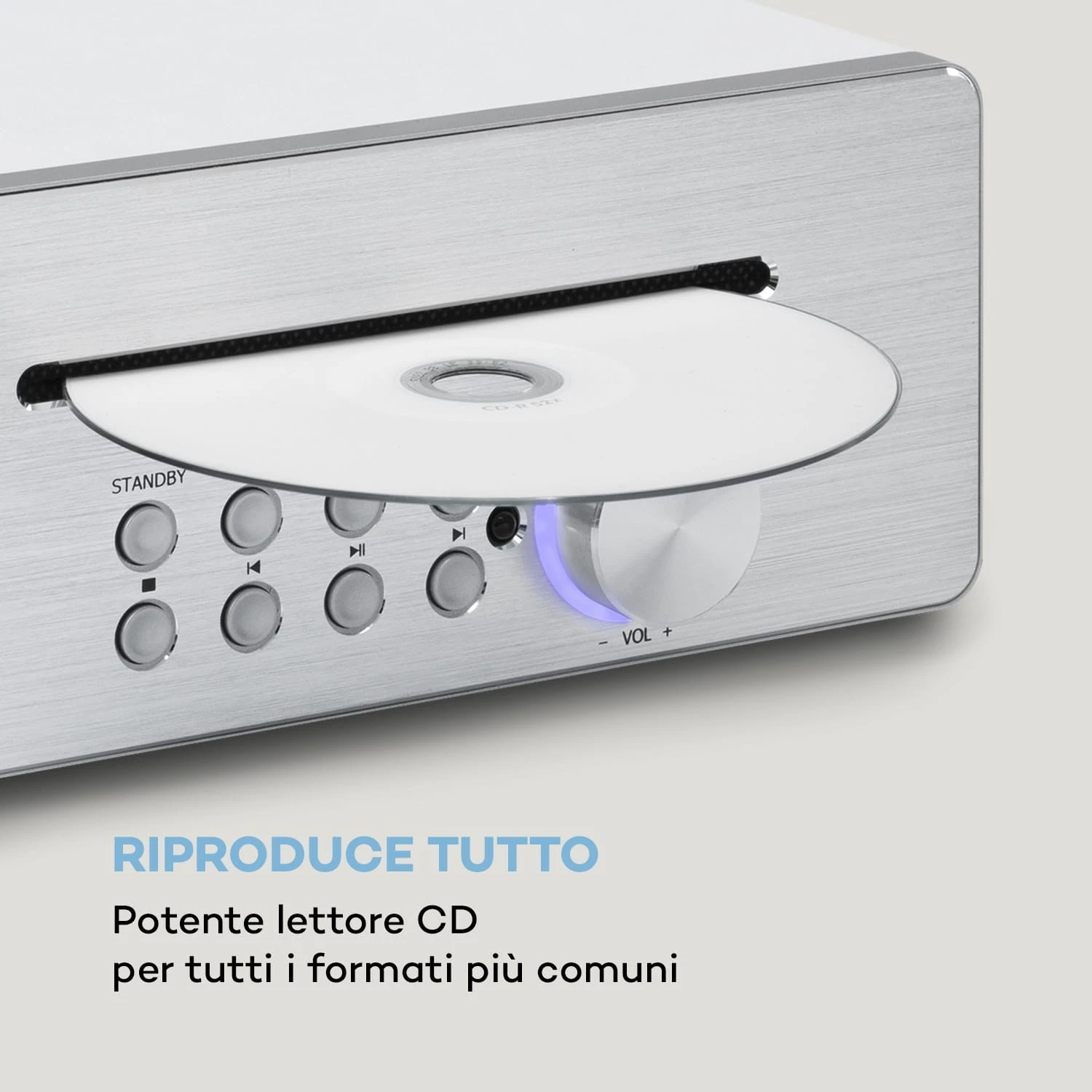 Un sintonizzatore radio internet, DAB+ e FM offre l’accesso a innumerevoli emittenti, da quelle locali a quelle più remote attorno al mondo. Grazie al display a colori TFT da 2,4″ con tecnologia HCC Display, è possibile tenere sempre sott’occhio l’ora, l’emittente, i brani e le informazioni meteo durante l’ascolto. Tramite l’interfaccia bluetooth si può scaricare facilmente in streaming la musica da smartphone, tablet o PC per riprodurla attraverso l’altoparlante posizionato verso il basso. Il lettore CD incorporato riproduce i formati tradizionali e conquista con il suo utilizzo semplice. La radio da cucina Silver Star Chef viene comandata con una potenza di 10 Watt RMS e 20 Watt max. direttamente dal dispositivo o comodamente da lontano tramite l’app Air Music Control. La porta USB collocata lateralmente e l’ingresso AUX ampliano la riproduzione musicale grazie al semplice collegamento di dispositivi esterni. La radio sottopensile convince inoltre con il sleep timer e la funzione sveglia. Inoltre, come già suggerisce il nome, può essere montata sotto i pensili o ripiani in modo semplice e salvaspazio. Un lato frontale in acciaio inox spazzolato e un alloggiamento dall’aspetto sobrio di legno conferiscono al dispositivo un look elegante e accattivante.