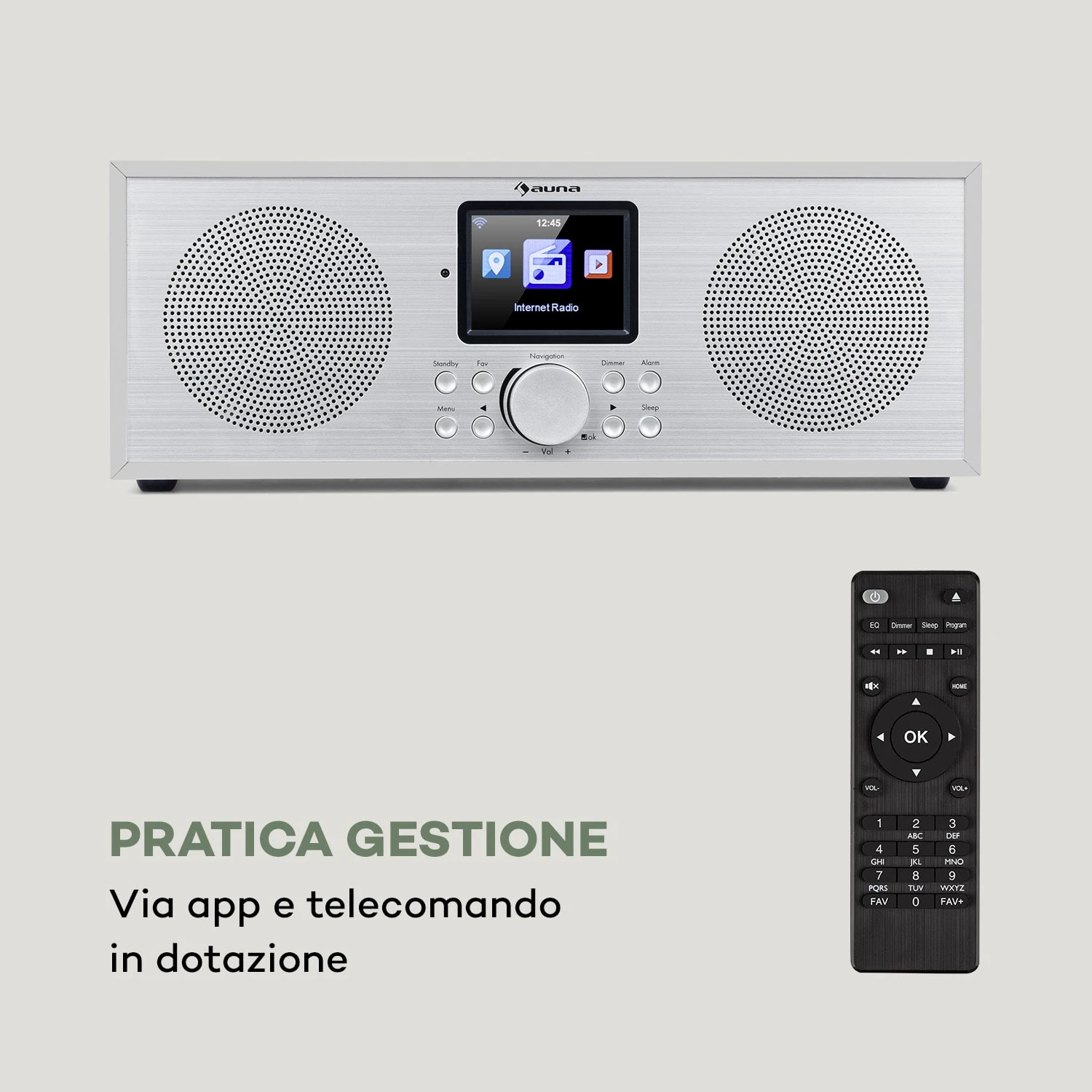 Ora di godersi musica di qualità! Con la radio web DAB+/FM Silver Star Stereo di auna, portate a casa vostra un tuttofare musicale che unisce in un solo dispositivo una potenza elevata, numerose funzioni e un design elegantissimo. Con una potenza di uscita di 2 x 8 Watt RMS, la radio All-In-One offre un sound della migliore qualità come elemento stazionario in cucina, bagno o soggiorno. Per connessioni senza filo è a disposizione la funzione Bluetooth integrata, con cui è possibile riprodurre file da dispositivi esterni in modo rapido e semplice. L’interfaccia WiFi permette di ricevere fino a 10.000 emittenti rado web e l’utilizzo come lettore di rete, grazie alla connessione in rete con altri dispositivi attraverso la app Air Music Control per lo streaming con standars UPnP/DLNA. Con il sintonizzatore DAB+ è possibile ricevere anche tutte le emittenti digitali oltre a quelle analogiche FM, per uno spettro sonoro pulito e stabile e un sound di altissima qualità. I servizi aggiuntivi DAB+ sotto forma di testo e immagini vengono valorizzati soprattutto dal grande schermo: descrizione del programma, informazioni, notizie o titoli possono essere letti comodamente dall’HCC-Display (High Contrast and Colore) da 2,8″ (7 cm). Chi desidera utilizzare altre fonti musicali può sfruttare gli ingressi Line e USB sul retro per trasmettere sull’impianto contenuti da smartphone, laptop, chiavette USB o lettori MP3. La web radio viene gestita dal pannello di controllo frontale o comodamente con il telecomando o la app Air Music Control. Utili sono anche senza dubbio la funzione sveglia con dual alarm e snooze. Oltre che per i dettagli tecnici, la radio convince con il suo fine telaio in legno bianco, che dona alla radio con pannello di controllo in alluminio una particolare eleganza che valorizza ulteriormente l’aspetto del dispositivo.