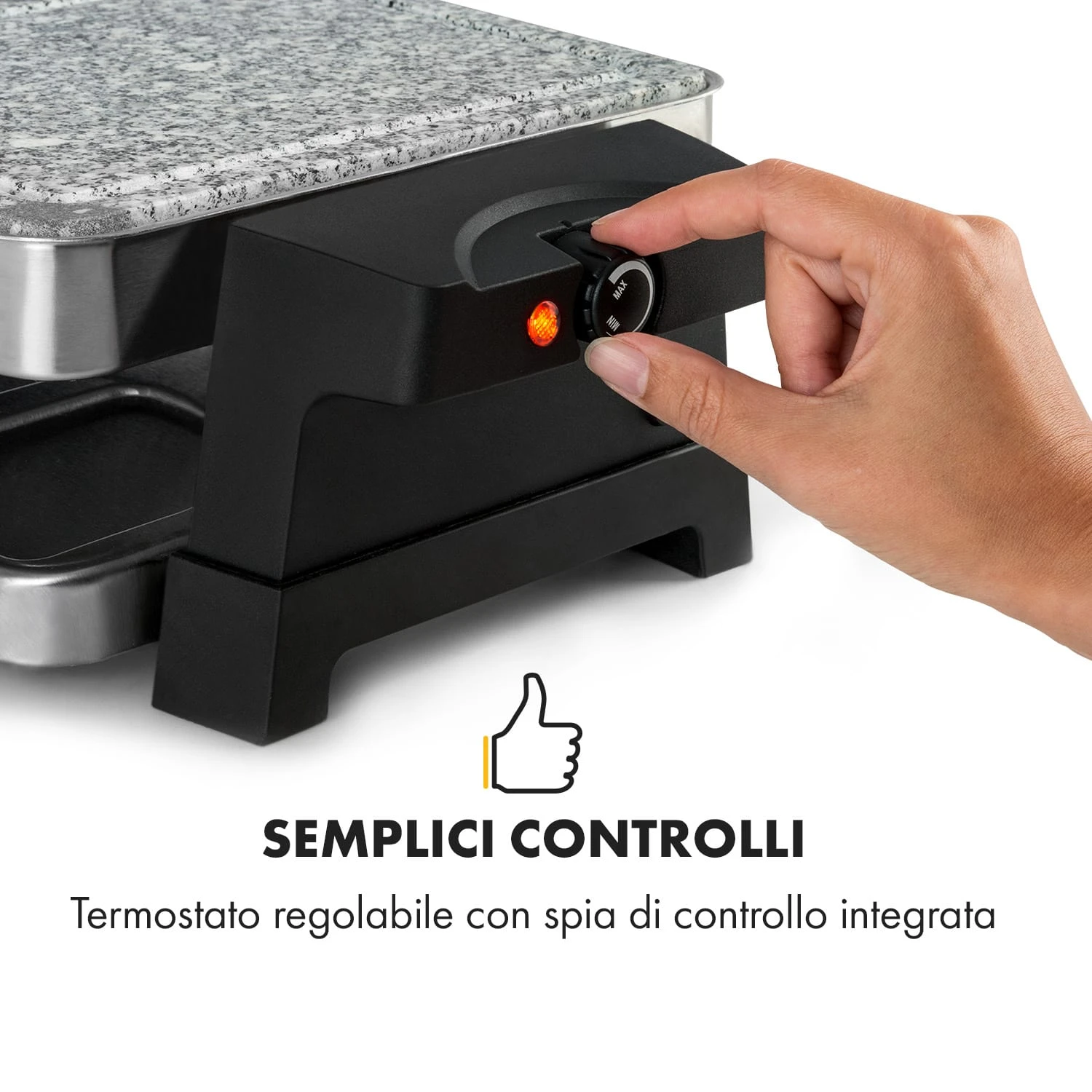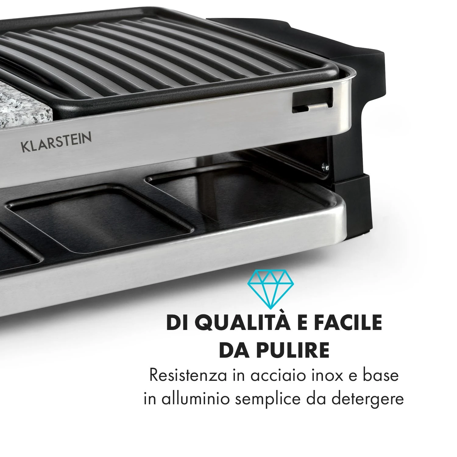 Con una potenza di 1500 Watt il raclette grill Sirloin di Klarstein fonde il formaggio e cuoce verdure o funghi in tempi record. La temperatura si regola semplicemente con il termostato. Grazie alla struttura su due livelli è possibile grigliare sia sopra che sotto. Mentre sotto si utilizzano le 8 padelle d’acciaio antiaderenti per gratinare il formaggio, sopra si riscaldano le piastre grill. Ce ne sono addirittura due a disposizione: una d’alluminio antiaderente e l’altra di pietra naturale in granito levigato. Entrambe offrono con i loro 18,5 x 23 cm abbastanza spazio per grigliare per tutti i presenti. Mentre la piastra di metallo trasmette il calore uniformemente e in modo rapido agli alimenti da grigliare che necessitano di poco olio grazie al rivestimento antiaderente, la pietra naturale brilla con il suo lungo immagazzinamento del calore per continuare a riscaldare anche dopo lo spegnimento. Quest’ultima è l’ideale per cuocere pizzette e altri impasti. Una spia incorporata indica quando il dispositivo è acceso o spento. La piastra di base d’alluminio si pulisce facilmente grazie alla superficie piatta.