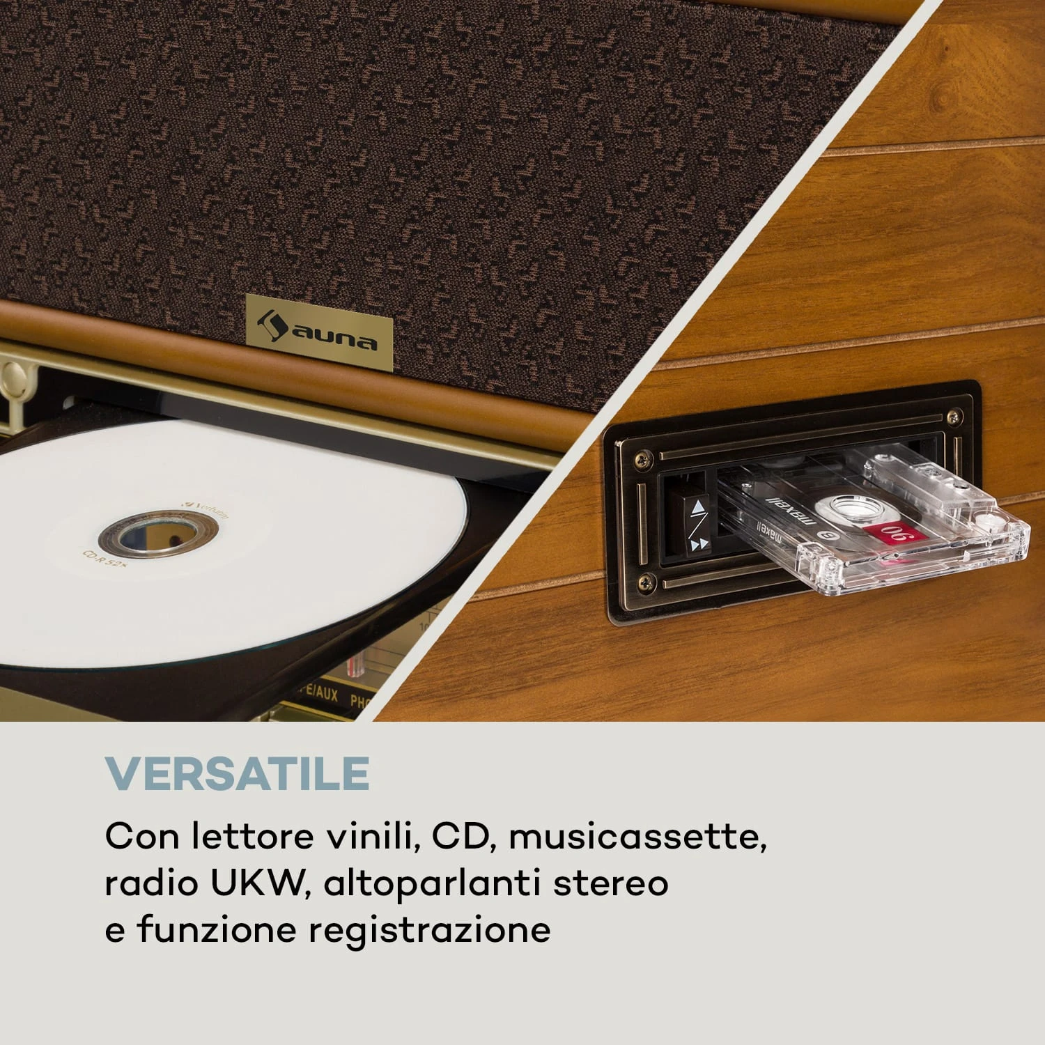 Il sistema stereo vintage Belle Epoque 1910 di auna prende il meglio del passato unendolo alla tecnologia del futuro. Le opzioni di riproduzione classiche si avvalgono di un giradischi in grado di riprodurre i vinili a tre velocità: a 33 1/3, a 45 e a 78 giri. Inoltre il sistema ha un alloggiamento per la riproduzione delle audiocassette, ha un lettore CD e, infine, un sintonizzatore radio FM.
