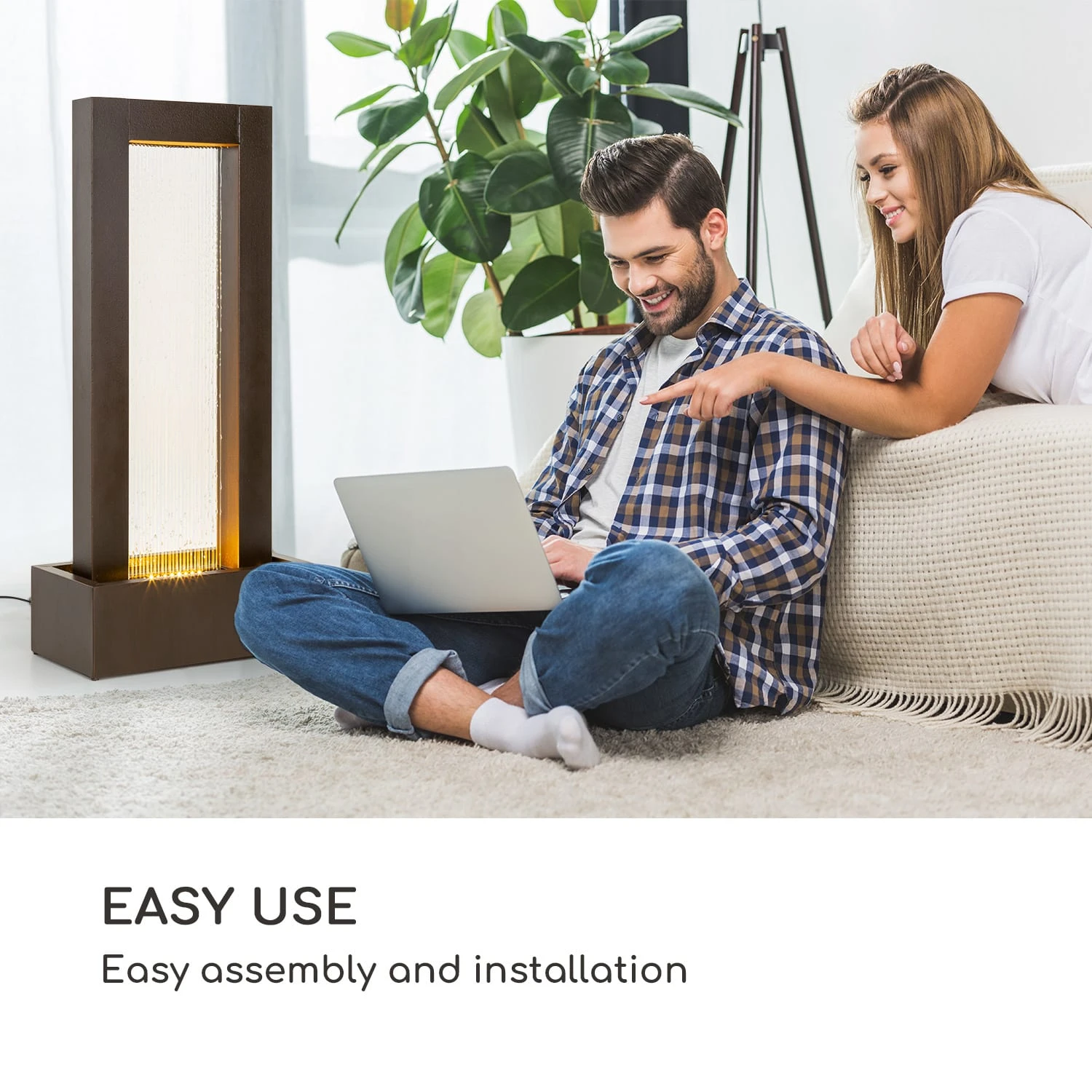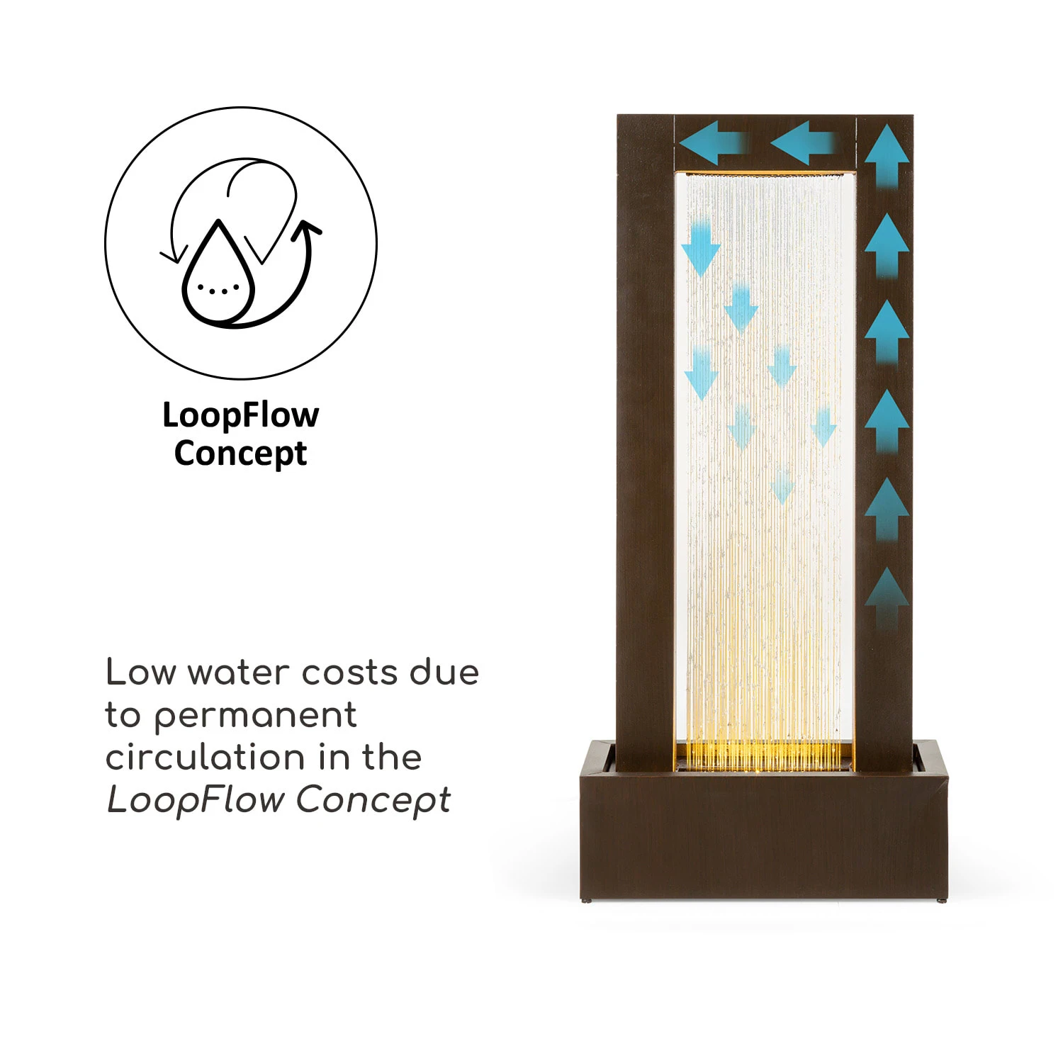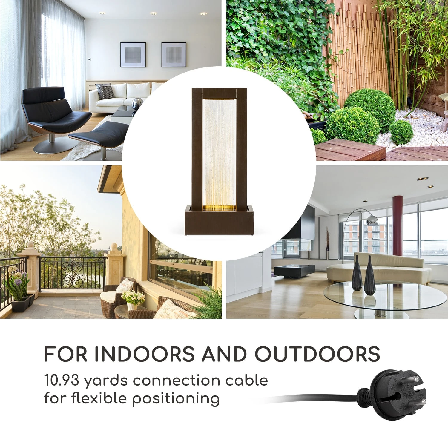 Con il dolce sciabordio della fontana decorativa Skyriver di Blumfeldt, rilassarsi non è mai stato così bello. Dalla sua apertura larga 20 cm viene liberata una cascata con un fantastico gioco d’acqua che si riversa nella vasca sottostante, ponendo le premesse ideali per relax e meditazione. Non è però solo il bellissimo flusso costante dell’acqua a riempire di gioia i vostri occhi: una striscia LED lunga 20 cm nella vasca della fontana fa risplendere l’acqua con riflessi di luce bianco caldi. L’arco della fontana di ispirazione cubista in metallo zincato è dotato di una finitura effetto bronzo, in modo che Skyriver possa entusiasmare visivamente e anche acusticamente. La fontana non è robusta e resistente alle intemperie solo grazie alla realizzazione in metallo, ma anche grazie alla totale zincatura: senza ruggine o scolorimento, si inserisce alla perfezione in ogni ambiente. Per un gioco d’acqua instancabile, si trova la pompa da 12 W che garantisce un ricircolo costante. Il delicato gorgogliare sprigiona un effetto altamente meditativo e dona un tocco di freschezza.