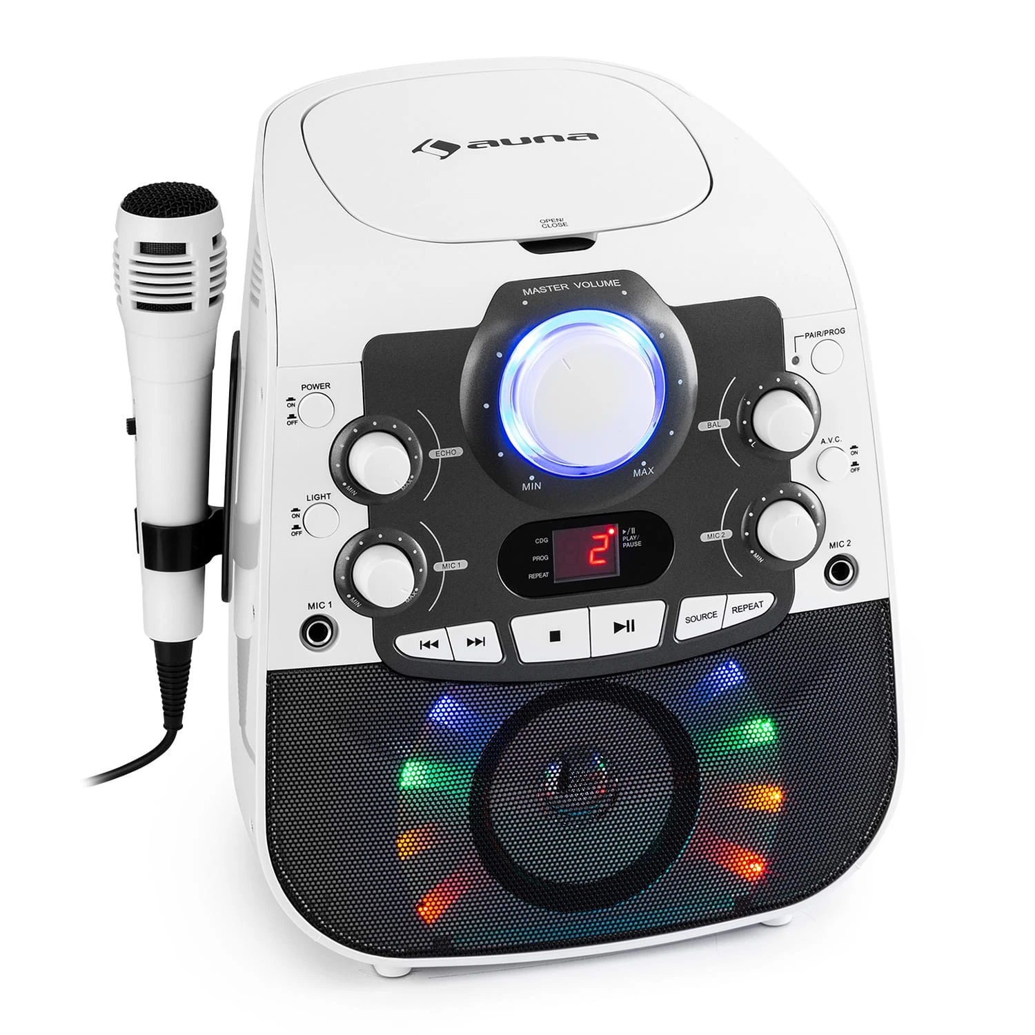Il lettore integrato legge CD tradizionali, ma anche CD riscrivibili e CD+G con appositi sottotitoli per karaoke. Collegate un proiettore o un televisore all’uscita A/V e avrete tutto il necessario per sessioni al karaoke fenomenali. Abbiamo già pensato anche all’illuminazione necessaria per uno spettacolo di livello: la musica viene accompagnata da bellissimi effetti luminosi in diversi colori.