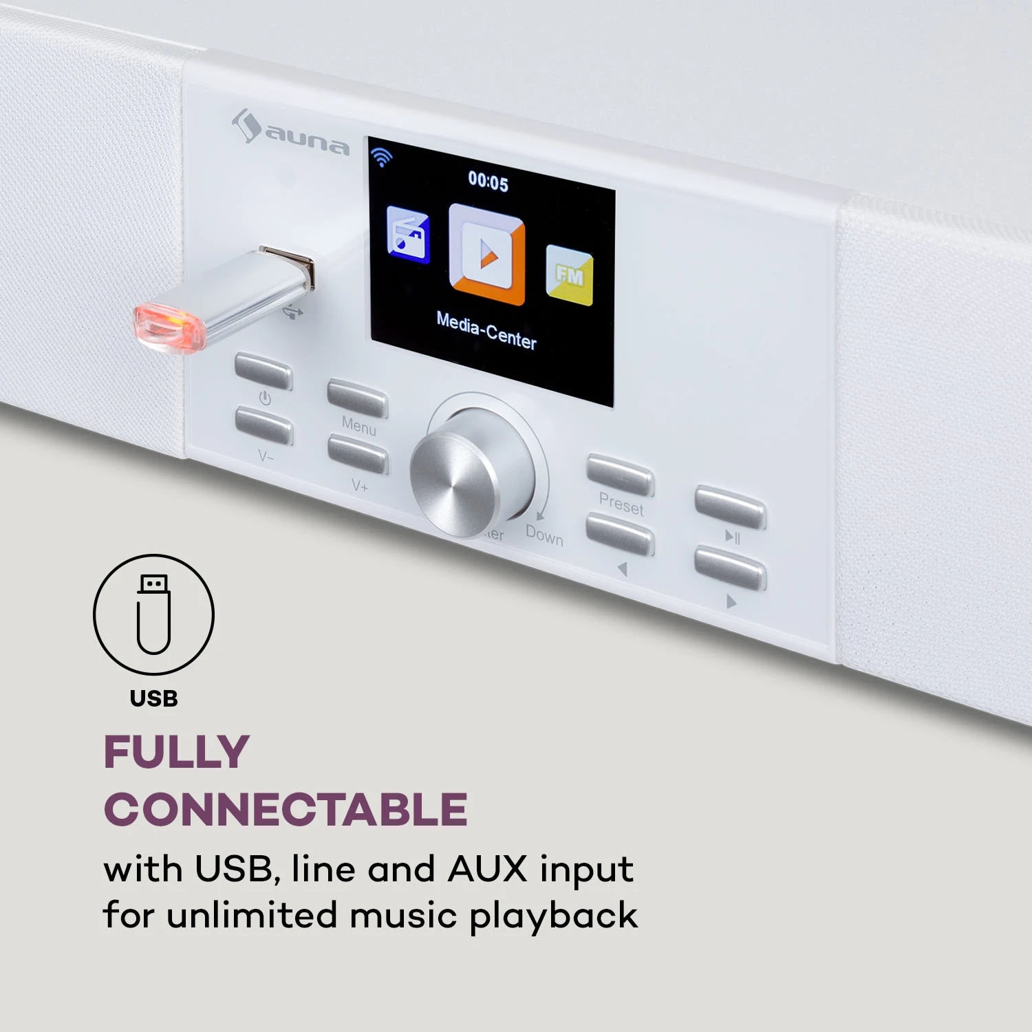 La soundbase con una potenza di 2 x 15 Watt RMS per entrambi gli altoparlanti stereo e 30 Watt RMS per il subwoofer è perfettamente adatta all’home cinema e allo streaming musicale, grazie alle sue numerose possibilità di connessione. Tramite l’ingresso ottico e coassiale la soundbase di auna si può collegare facilmente alla TV, mentre una radio internet riproduce tramite WiFi più di 27.000 stazioni internazionali, suddivise secondo il paese, il genere e la popolarità. Un sintonizzatore DAB+/FM è responsabile della ricezione digitale e analogica di tutte le stazioni radio locali.