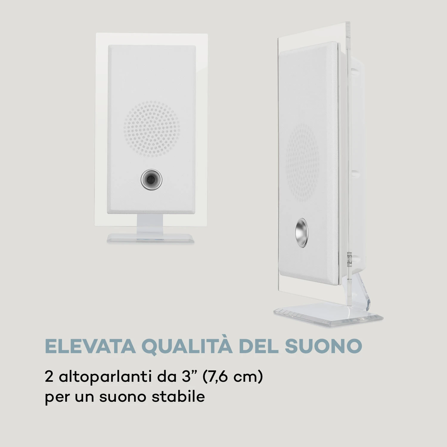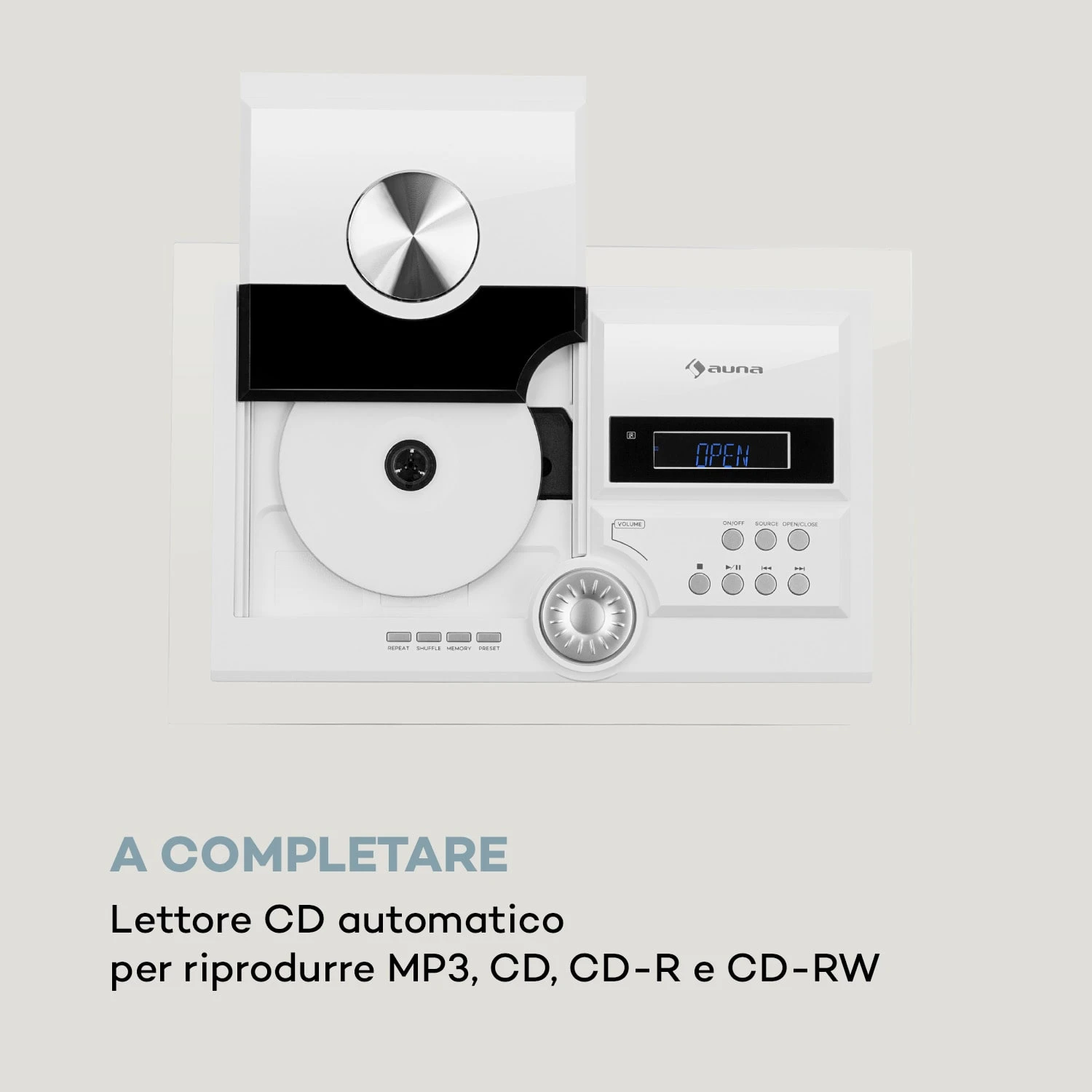 L’impianto stereo può essere utilizzato con i piedi d’appoggio in acrilico inclusi in consegna o montato a parete e convince con la sua discreta eleganza e il suo spettro sonoro pulito. Un lettore CD automatico sul lato frontale del dispositivo permette l’ascolto di CD, CD-R e CD-RW, mentre una porta USB si occupa dei file MP3. Con l’aiuto della funzione Bluetooth, è possibile lo streaming affidabile e senza fili di file audio da smartphone, tablet o laptop. L’ingresso AUX permette il collegamento di fonti musicali esterne, come ad es. lettori MP3, ampliando ulteriormente le opzioni di ascolto. Se questa varietà di collegamenti non dovesse bastare, è sufficiente accendere il sintonizzatore radio DAB+ e FM per ascoltare senza interferenze segnali digitali ed emittenti locali nella gamma di frequenza 87,5 – 108 MHz. Il display mostra in modo chiaro le funzioni principali, il titolo del brano o l’emittente radio, selezionabile comodamente dalla distanza con il telecomando incluso in consegna. Per finire in bellezza troviamo il timer di autospegnimento e la funzione sveglia, in modo da non dimenticarsi di importanti appuntamenti.