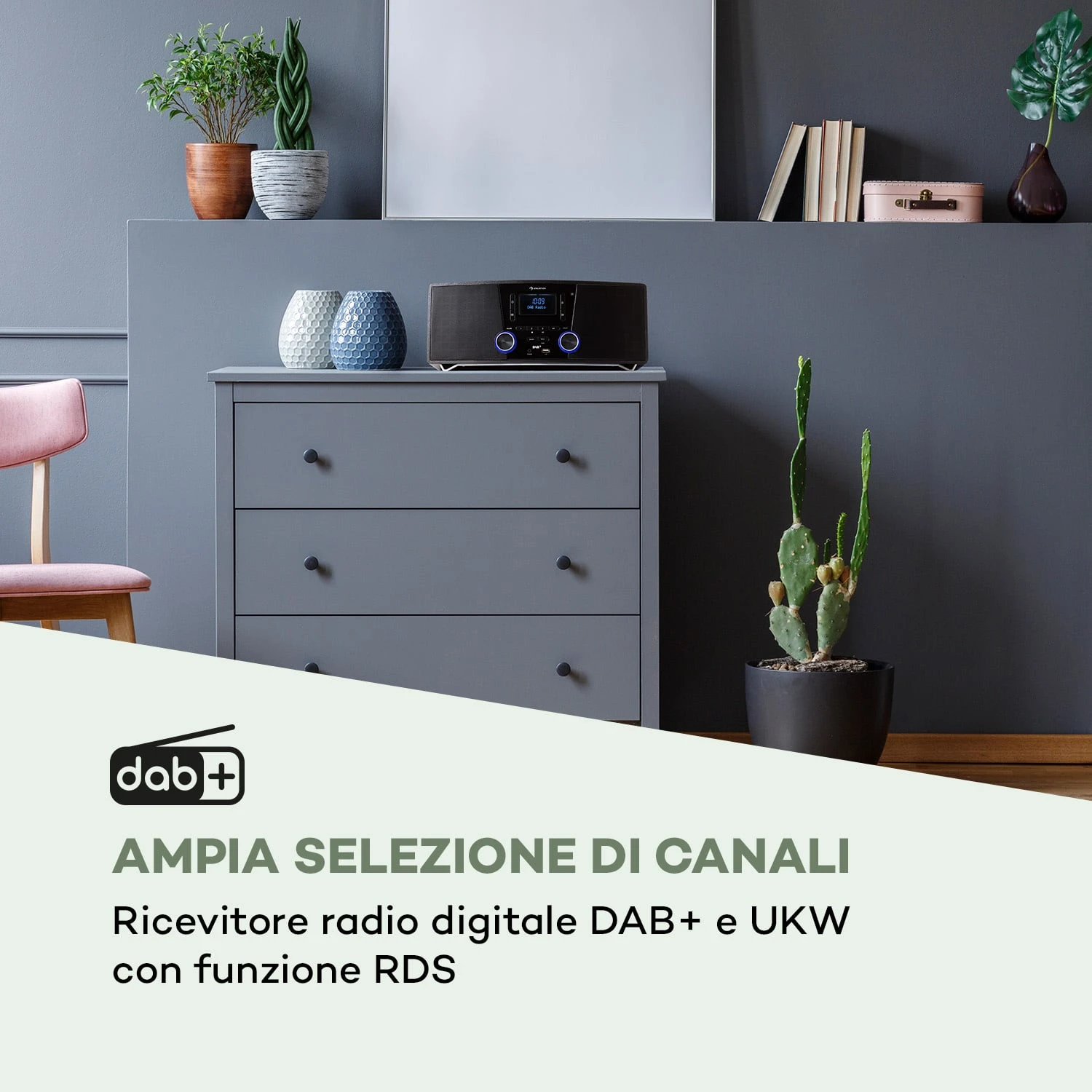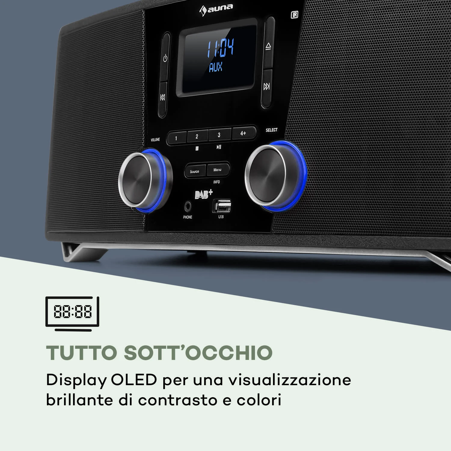 Con il sintonizzatore DAB+ dell’impianto stereo Stockton è possibile ricevere tutte le emittenti radio FM e digitali, che vengono poi riprodotte in altissima qualità. Le informazioni DAB+ e la funzione RDS vengono valorizzate ulteriormente dallo schermo OLED: panoramica sulla programmazione, informazioni, notizie e titoli possono essere letti comodamente sul grande display a colori. La potenza massima di 20W (2 x 5W RMS) garantisce uno spettro sonoro dinamico, mentre X-Bass e EQ permettono di personalizzare il sound.