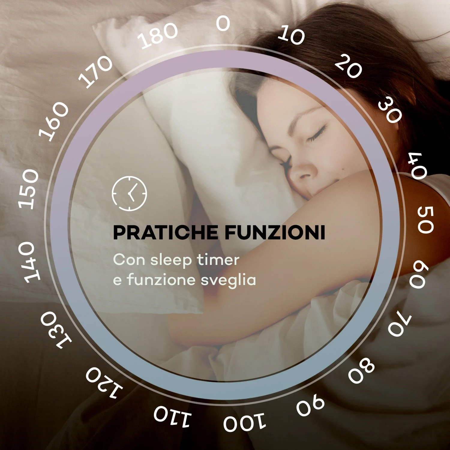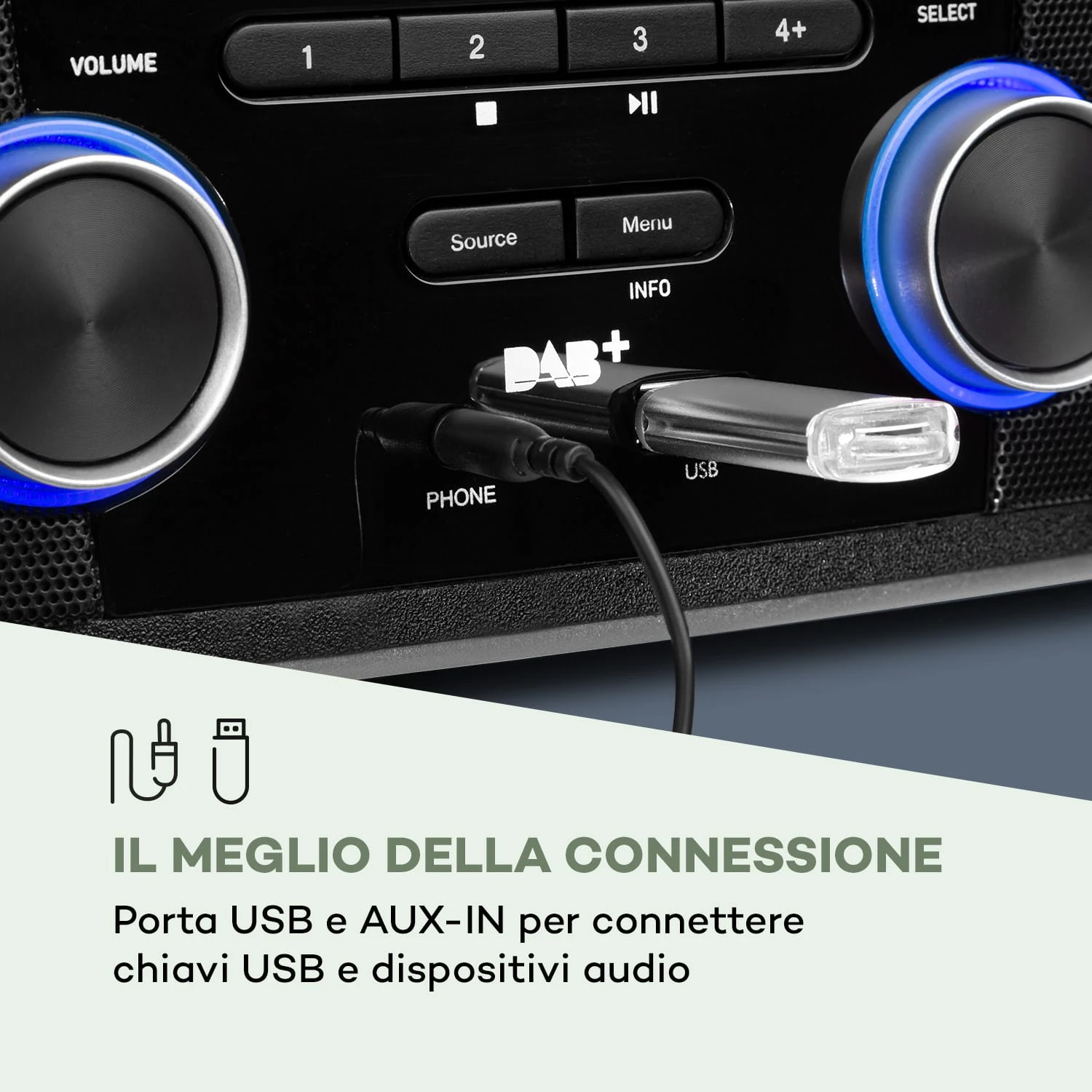 Chi desidera utilizzare altre fonti musicali oltre a CD, Bluetooth, DAB+/FM, può sfruttare la connessione AUX-IN per collegare dispositivi esterni o la porta USB. Ulteriori particolarità dell’impianto stereo sono la funzione sveglia e il timer di autospegnimento, che lo rendono ideale per il posizionamento sul comodino.