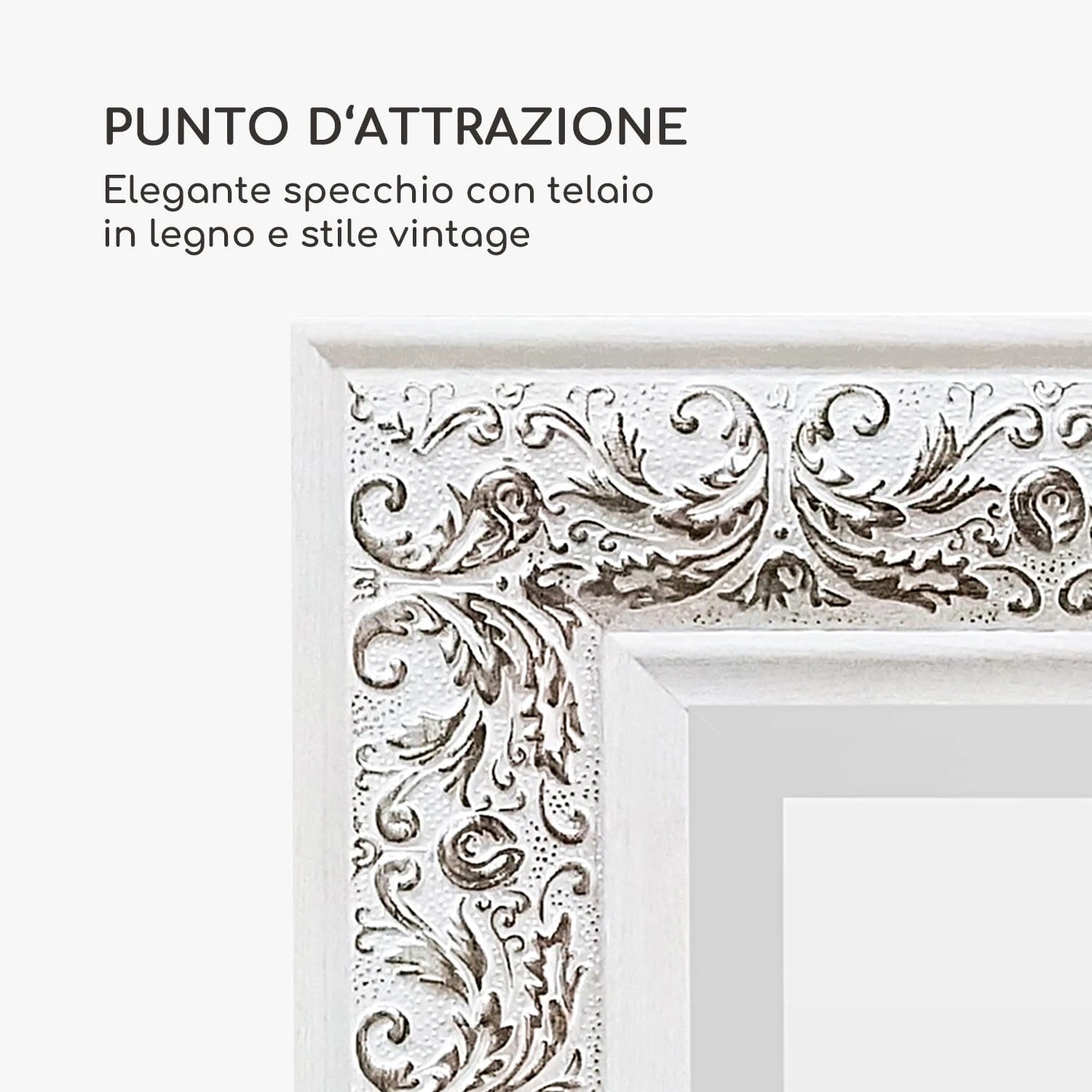 Lo specchio Stratford di Casa Chic by blumfeldt con il suo aspetto vintage crea un effetto Wow in qualsiasi stanza. La sua cornice in legno con motivo floreale è realizzata in un discreto design shabby chic e racchiude perfettamente l’ampia superficie con sfaccettatura dello specchio. Sia in formato orizzontale sopra il divano che in formato verticale nella camera da letto, lo specchio da parete Stratford porta un tocco di eleganza francese alla tua casa. Sul retro si trovano già i ganci per un montaggio sicuro alla parete.