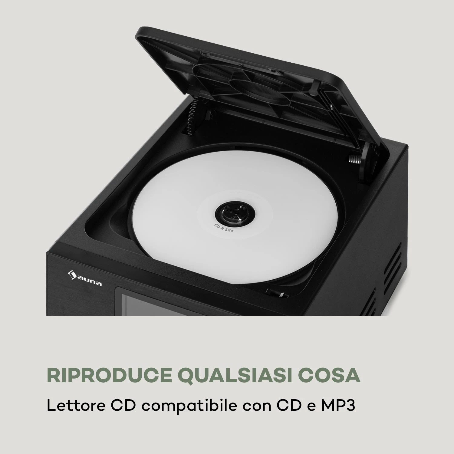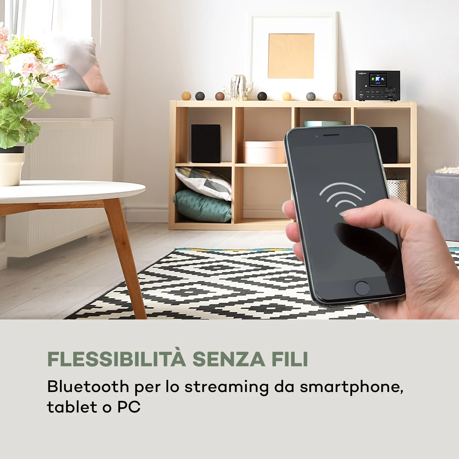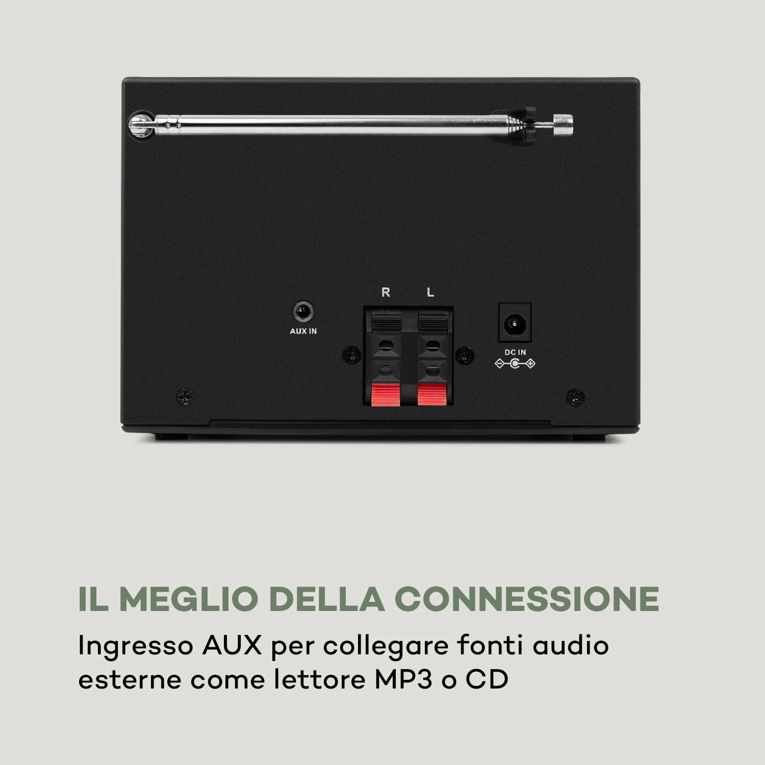 La funzione Wi-Fi permette la ricezione senza fili di innumerevoli emittenti radio web, mentre con DAB, DAB+ e sintonizzatore FM si ottiene l’accesso a oltre 10.000 emittenti in tutto il mondo. Grazie all’HCC Display a colori e ad alta definizione avrete sempre sotto controllo ora, emittente radio, informazioni su titolo, meteo e andamento dei titoli di borsa. Un ingresso AUX per collegare dispositivi esterni come lettori MP3 si trova sul retro dell’impianto stereo, mentre per le chiavette USB si trova un’apposita porta sul lato frontale. L’interfaccia Bluetooth permette di ascoltare musica in streaming da smartphone, tablet o PC, che viene poi diffusa in stereo dai potenti altoparlanti da 10 W RMS.