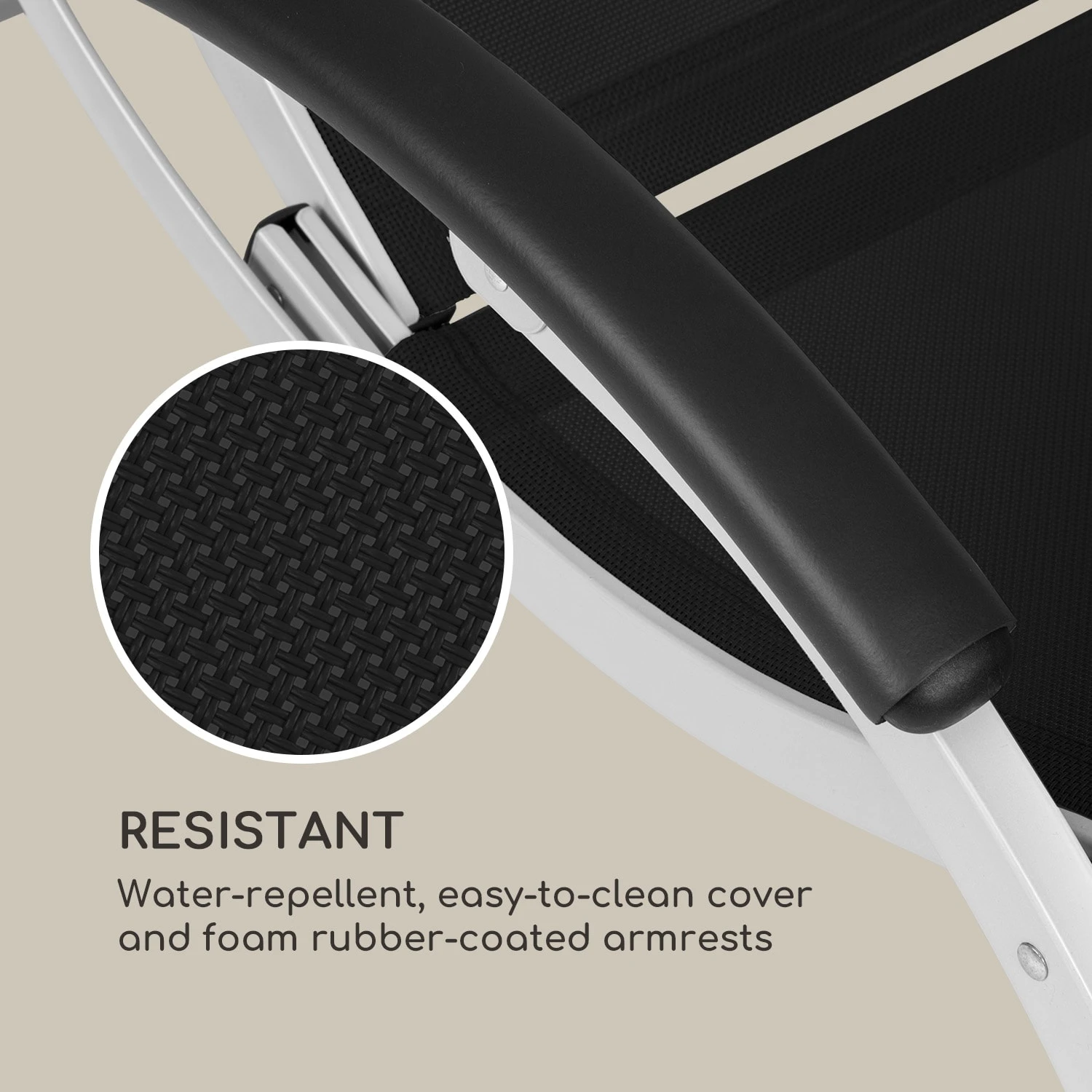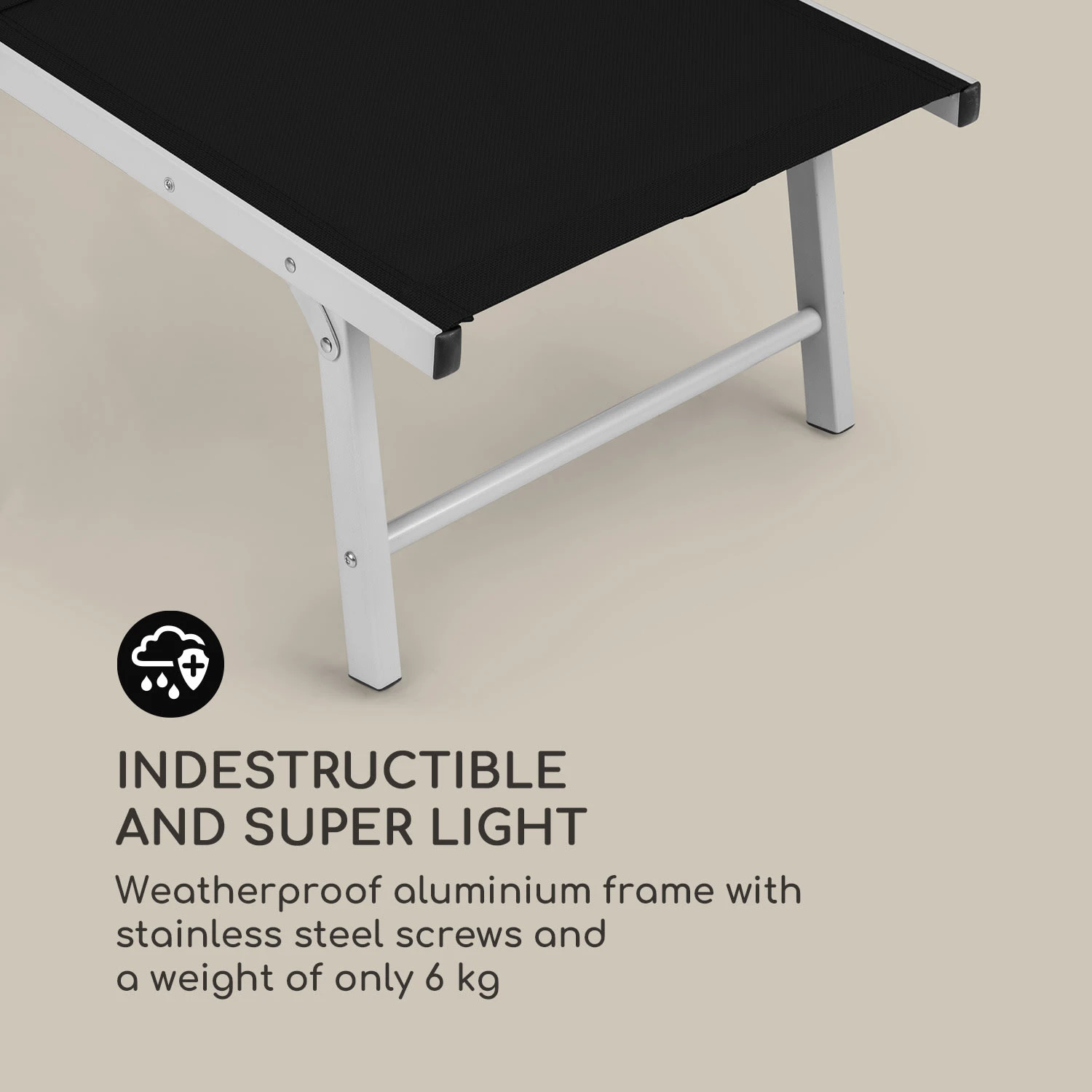 Il lettino da giardino Sunnyvale di Blumfeldt è la tua ricarica personale di vitamina D. A seconda dei tuoi gusti del momento, potrai regolare lo schienale del Sunnyvale in 4 posizioni da seduto a sdraiato. La sedia da giardino Sunnyvale si trasforma in un battibaleno in un lettino da giardino grazie al poggiapiedi ribaltabile: basta sollevare i piedi e rilassarsi. Grazie al tessuto mesh in poliestere resistente, ti riposi sulla superficie ergonomica da sdraio e da seduta da 174 cm come se fossi sulle nuvole. Il tessuto mesh è resistente alle intemperie, si asciuga in fretta e si pulisce facilmente con un panno umido. Così il lettino è sempre pronto per il prossimo bagno di sole. La struttura è composta da tubi d’alluminio robusti per far sì che l’intero lettino pesi solo 6 kg. Spostare il lettino è un gioco da ragazzi. Si può ripiegare il lettino prendisole in poche mosse per riporlo oppure per trasportarlo al lago e prendere il sole.