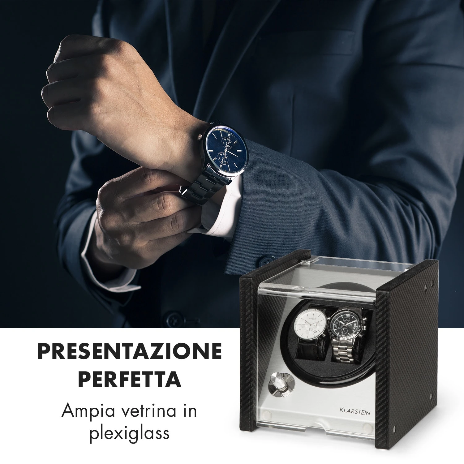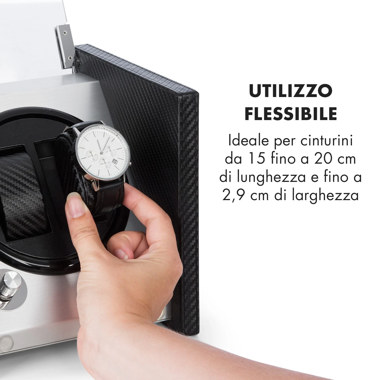 La scatola del tempo Tokyo 2 colpisce per l’elegante alloggiamento effetto fibra di carbonio, che si inserisce con stile in ogni tipo di ambiente. Una superficie di controllo in alluminio spazzolato dona uno splendore inconfondibile alla struttura, mentre l’ampia finestrella frontale in vetro acrilico mette perfettamente in risalto i vostri orologi automatici.