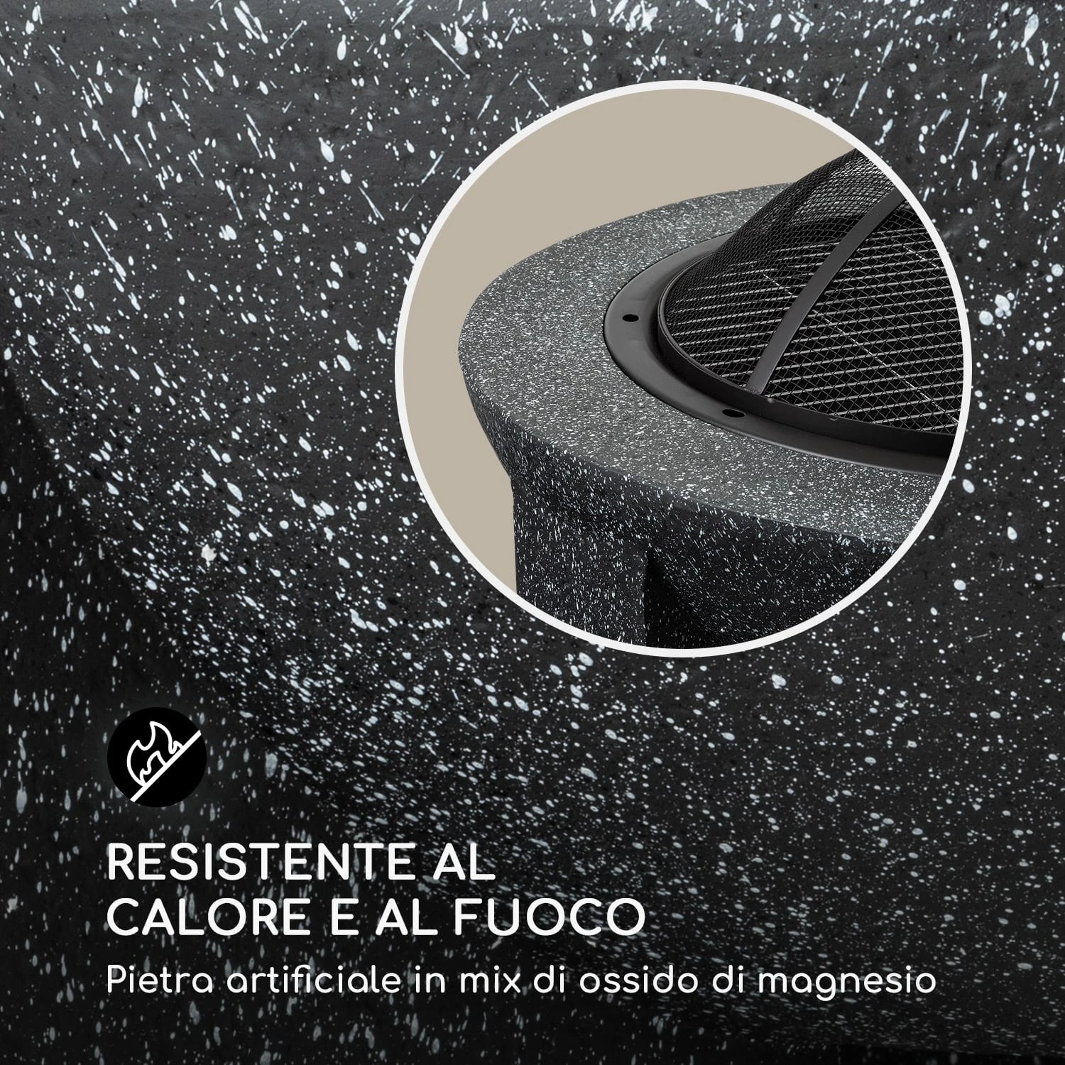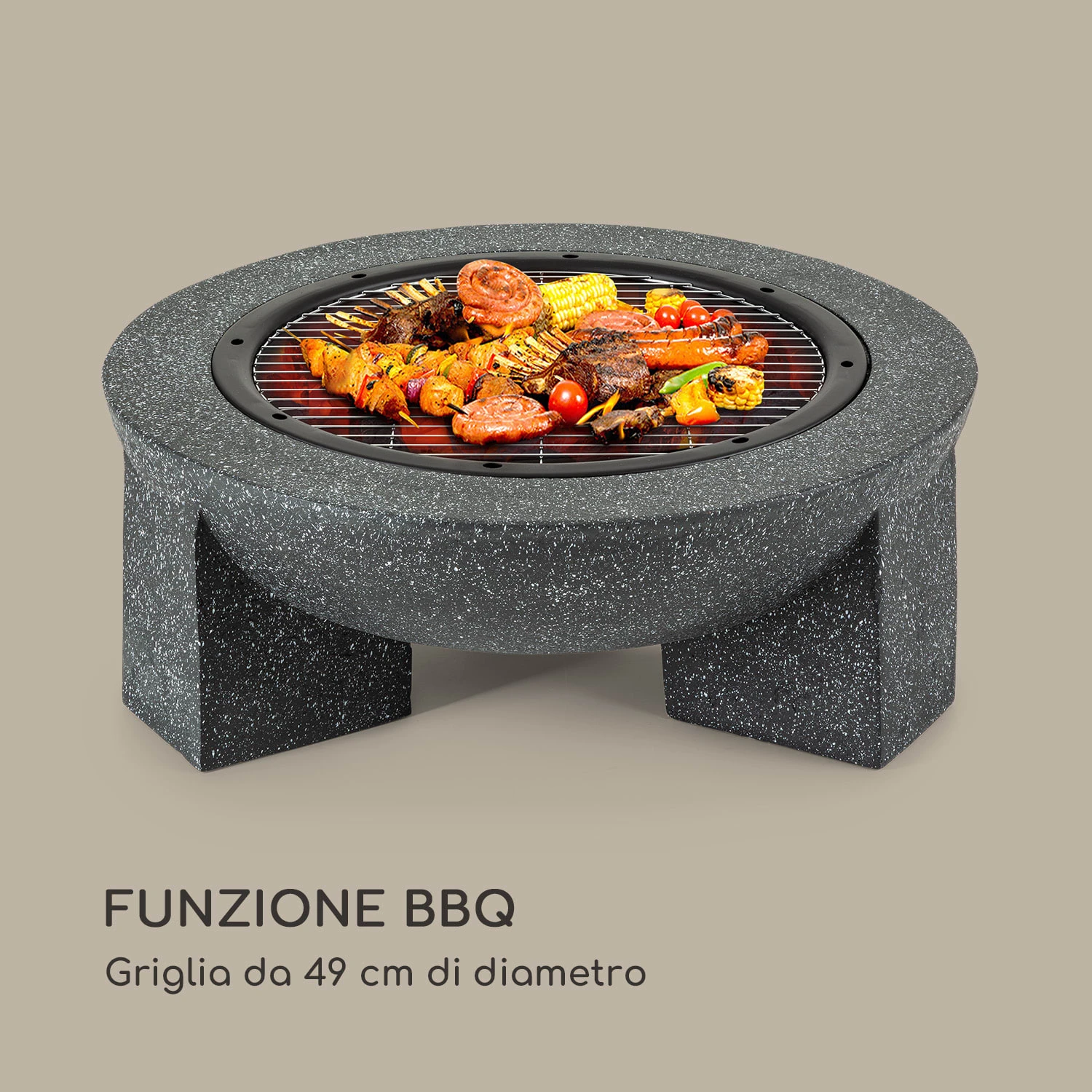 Con il braciere Troja di blumfeldt puoi accomodarti e rilassarti osservando il romantico gioco di fiamme, senza nessuna preoccupazione per la tua sicurezza. La base forma una costruzione decorativa a treppiede in magnesia fusa resistente al calore e al fuoco, in cui è incassato con eleganza il braciere. Per alimentare le fiamme nel braciere in acciaio puoi utilizzare ceppi di legno, carbone o bricchette. Un parascintille d’acciaio a griglia evita pericoli dovuti a braci o scintille volanti. Con l’attizzatoio in dotazione, il parascintille può essere semplicemente sollevato di lato per aggiungere combustibile o per ravvivare il fuoco. La carbonella o i ceppi di legno poggiano su una griglia per la cenere, che assicura che il materiale bruciato si raccolga sul fondo del braciere, per una combustione pulita. Uno scudo termico sotto il braciere protegge inoltre il prato o la pavimentazione della terrazza da eventuali danni dovuti al calore.