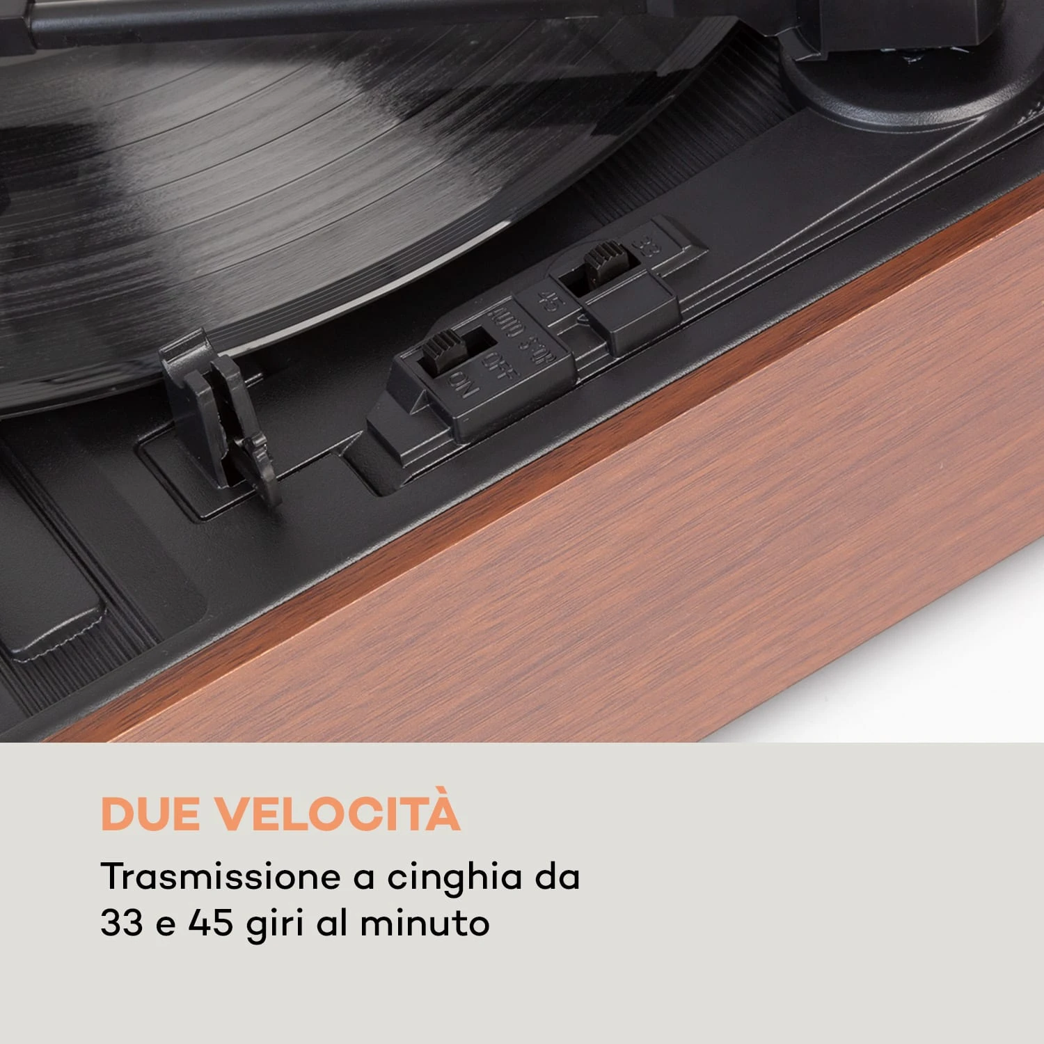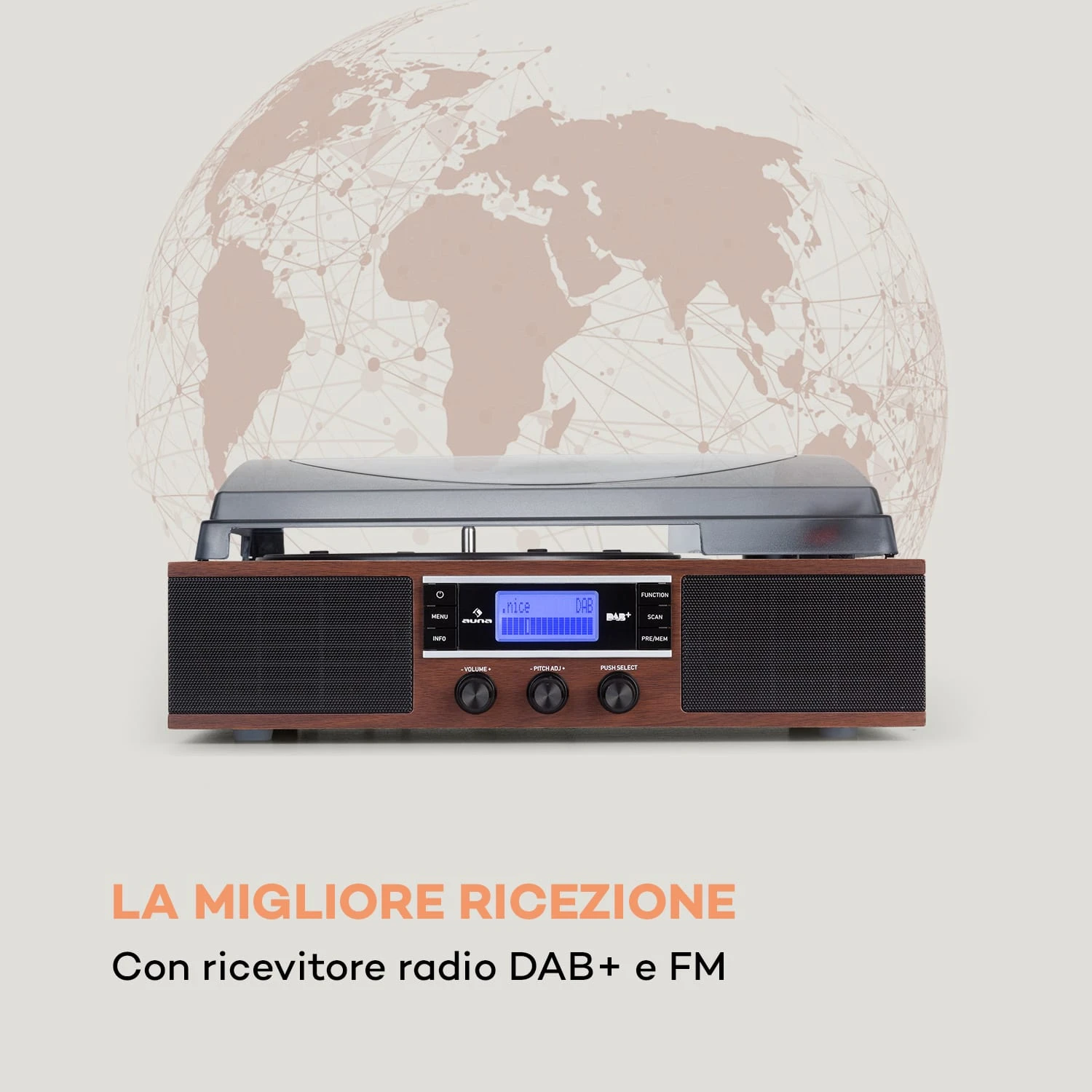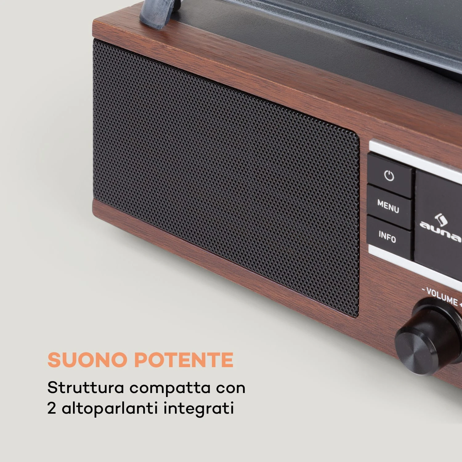 Dotato di sintonizzatore radio DAB+ e FM, permette di ascoltare senza problemi emittenti digitali e locali senza interferenze e con una qualità del suono elevata. Una trazione a cinghia con velocità da 33 e 45 giri al minuto si occupa della riproduzione di diversi tipi di vinili. Un chiaro vantaggio del giradischi auna è il sistema di altoparlanti integrato, con cui il dispositivo funge anche da impianto stereo. Tramite un’uscita line, questo affascinante giradischi può essere inserito senza problemi in impianti Hi-Fi esistenti, per migliorare ulteriormente il suo sound. Il dispositivo compatto presenta anche una connessione per antenna FM e un accattivante design effetto legno.