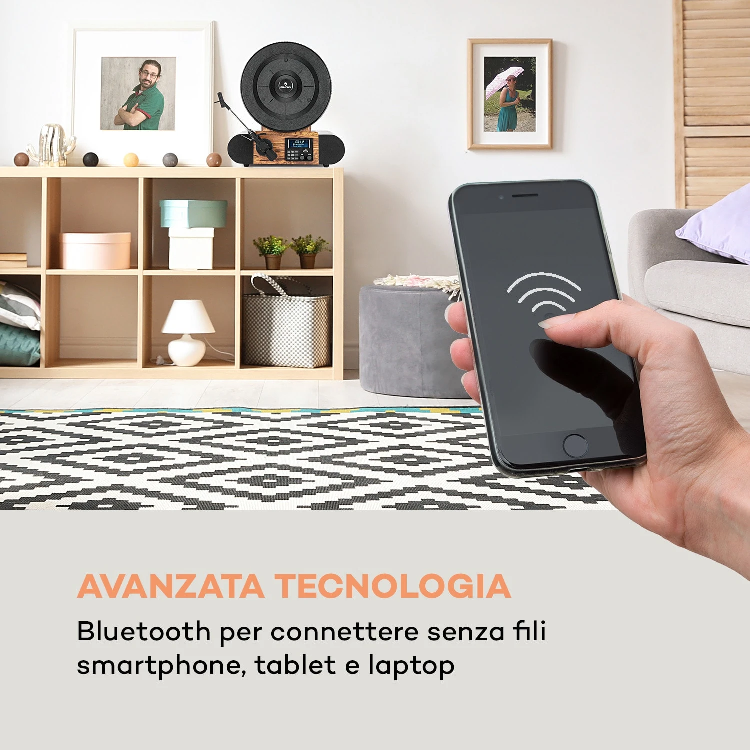 è possibile infatti accedere allo spettro di emittenti digitali DAB+, alle frequenze analogiche del ricevitore FM, utilizzare il Bluetooth per collegare smartphone, tablet e altri dispositivi al giradischi verticale, in modo da ascoltare tranquillamente musica in streaming, ascoltare musica da lettori MP3 con l’ingresso AUX e riprodurre direttamente file MP3 da chiavette USB grazie all’apposita porta USB. Gli altoparlanti stereo riempiono ogni stanza con le vostre canzoni preferite, facilmente visibili sul chiaro schermo LCD.