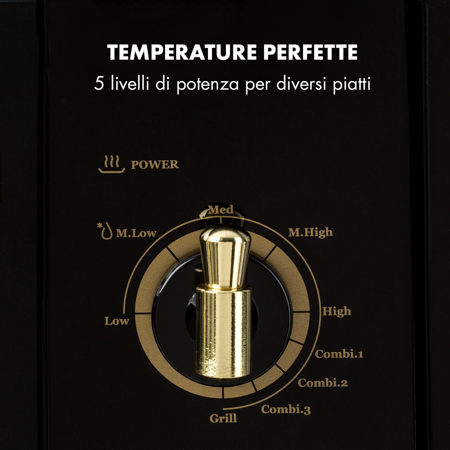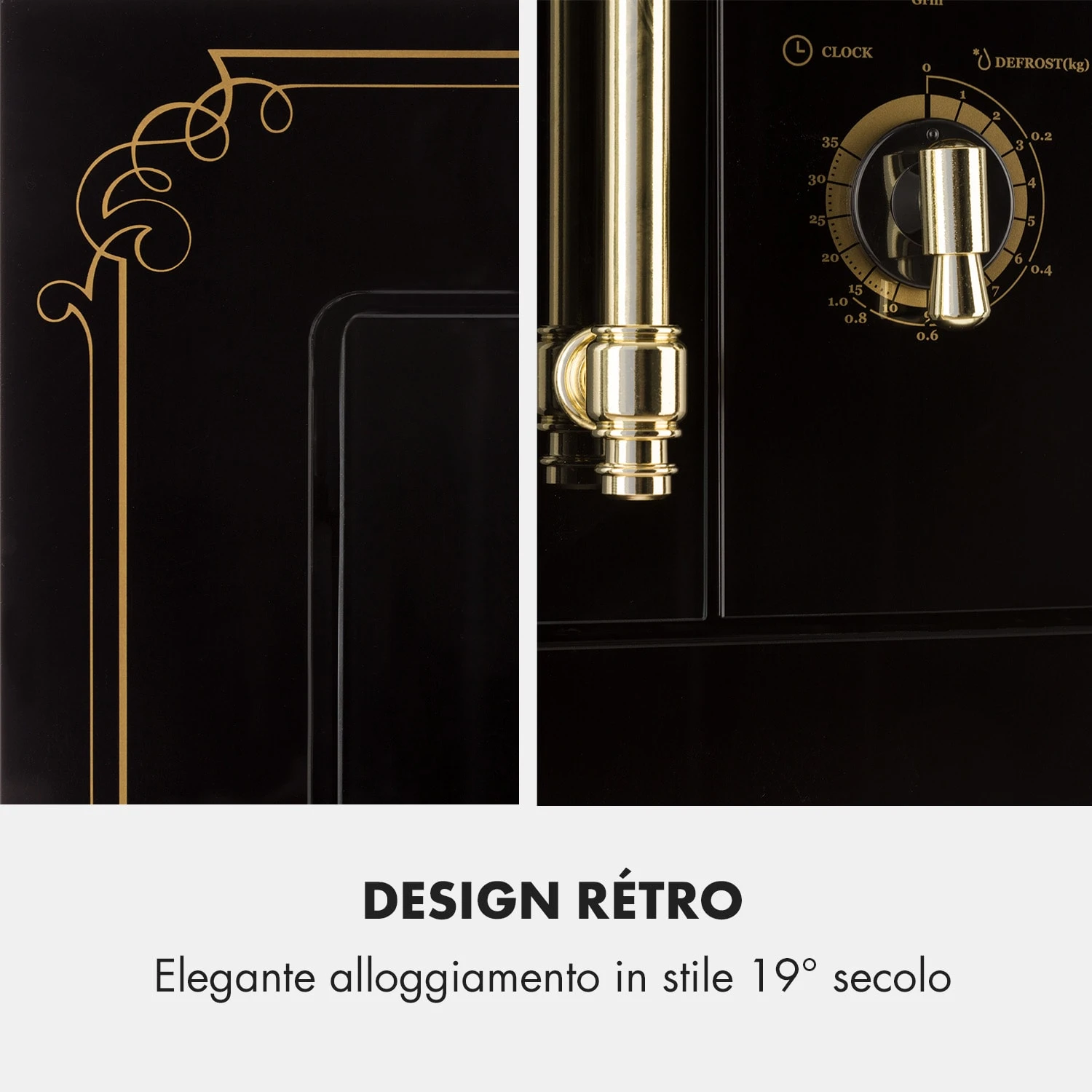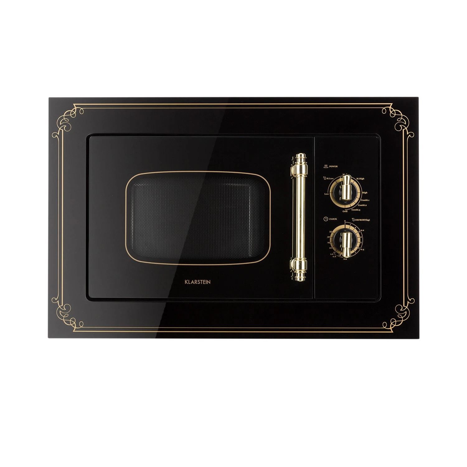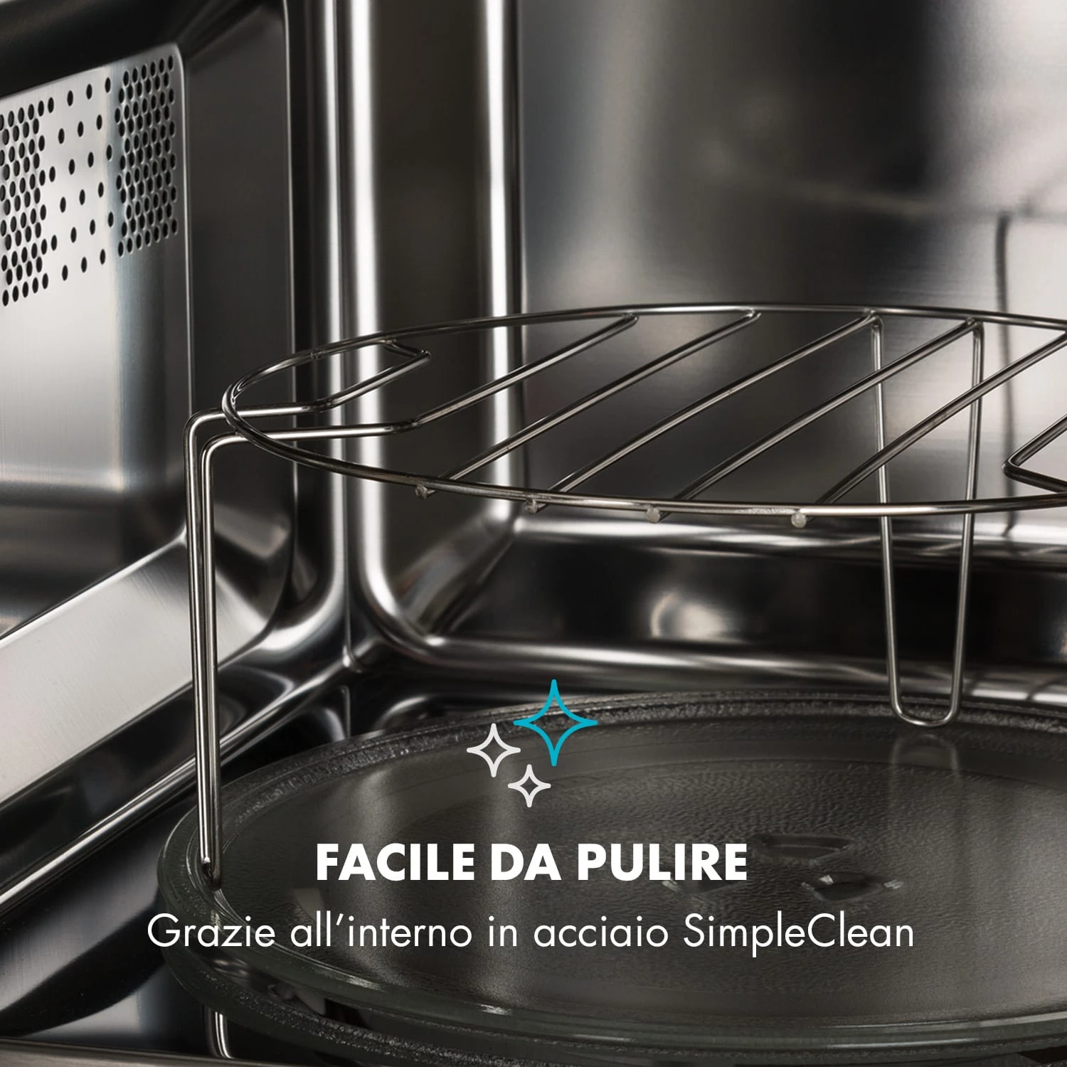 Il forno a microonde ad incasso Victoria 20 di Klarstein inclusa la struttura per l’istallazione è un potente talento tuttofare per uso domestico in famiglia o per single. Il microonde e il grill insieme formano un dispositivo multifunzione. La potenza del microonde di 800 W e lo spazio per la cottura di 20 L si adattano perfettamente alle esigenze del nostro ritmo frenetico: la potenza può essere impostata comodamente su 5 livelli per riscaldare in poco tempo pietanze pronte, cuocere alimenti o per mantenere caldi i cibi già cotti. Per un risultato ottimale è possibile regolare comodamente sulla lastra di vetro di 24,5 cm Ø, oltre al livello di potenza, anche il tempo di cottura. Al termine del tempo stabilito il microonde ad incasso si ferma ed emette un segnale acustico. In tal modo si eviterà di dimenticare i piatti pronti nel microonde e i vostri stomaci affamati saranno riempiti in tempo. Inoltre, il dispositivo victoria 20 possiede un grill di 1000 W, che grazie alla griglia in dotazione, conferisce la giusta cottura a carni e salsiccie: basta impostare la funzione grill o scegliere, tramite QuickSelect, la combinazione desiderata grill-microonde e in poco tempo potrete già gustare le vostre pietanze! Per scongelare gli alimenti surgelati il microonde ad incasso di Klarstein offre, inoltre, una funzione disgelo che permette di scongelare in modo molto semplice carne, pollame e frutti di mare senza farli cuocere involontariamente. All’interno del dispositivo brilla l’acciaio SimpleClean, materiale particolarmente resistente e facile da pulire. Anche dal punto di vista estetico il microonde ad incasso Victoria 20 onora il suo nome e possiede un alloggiamento elegante tipico del 19° secolo che si adatta perfettamente in tutte le cucine moderne e classiche.
