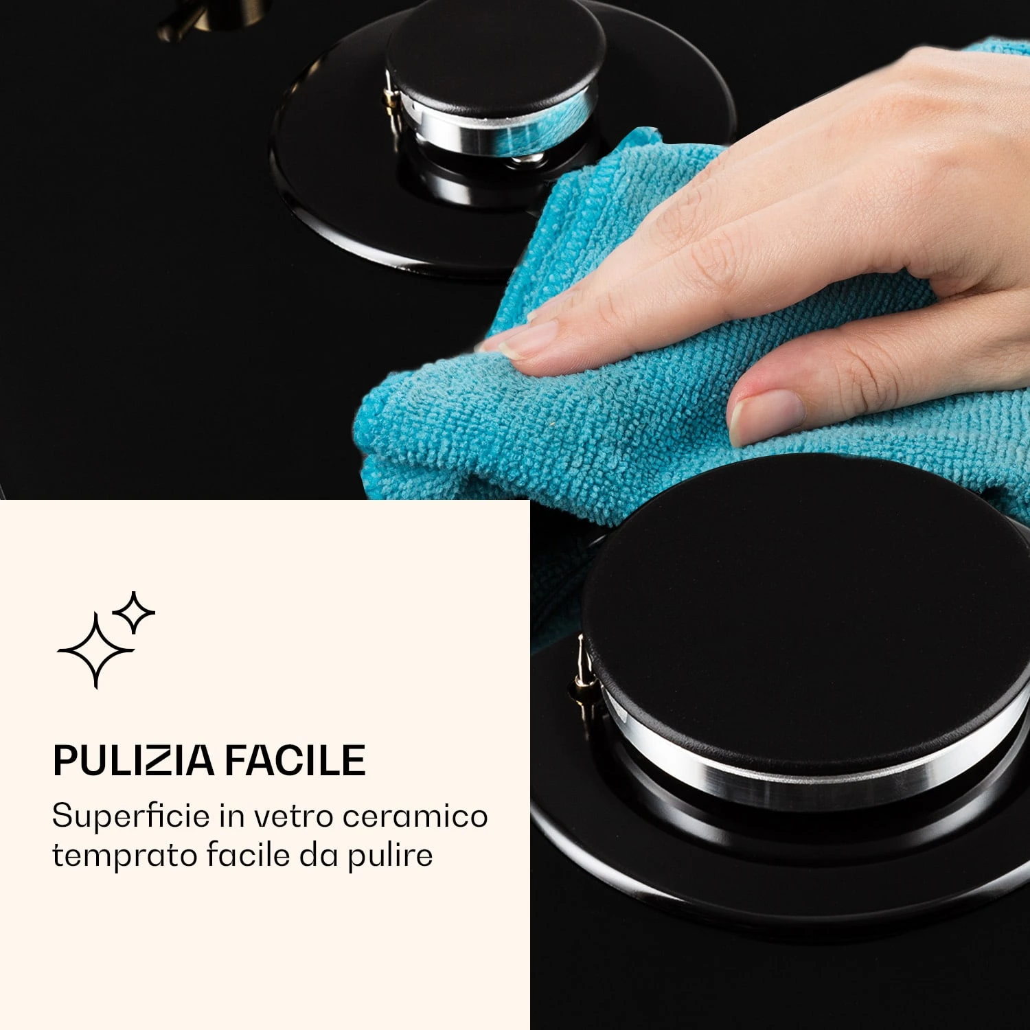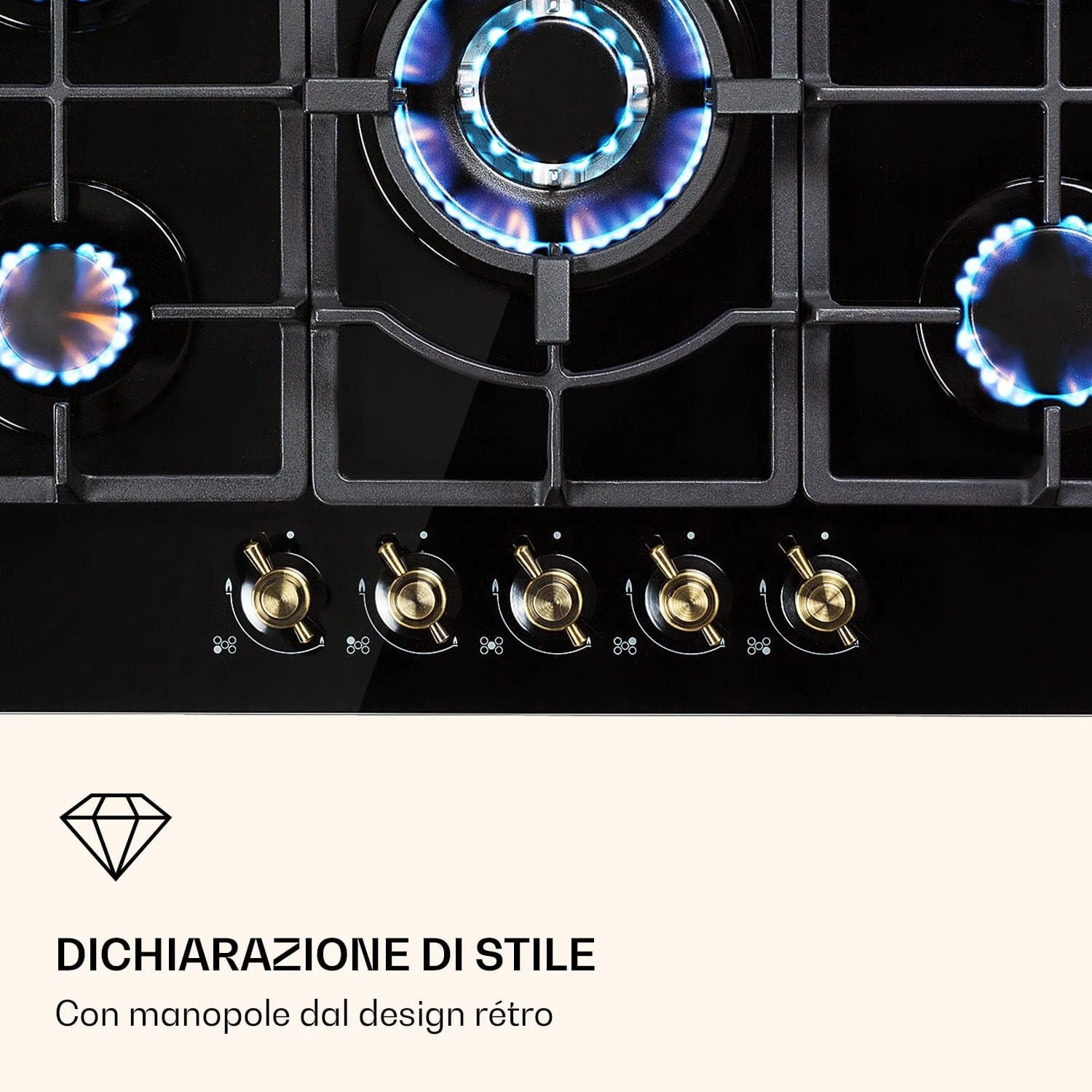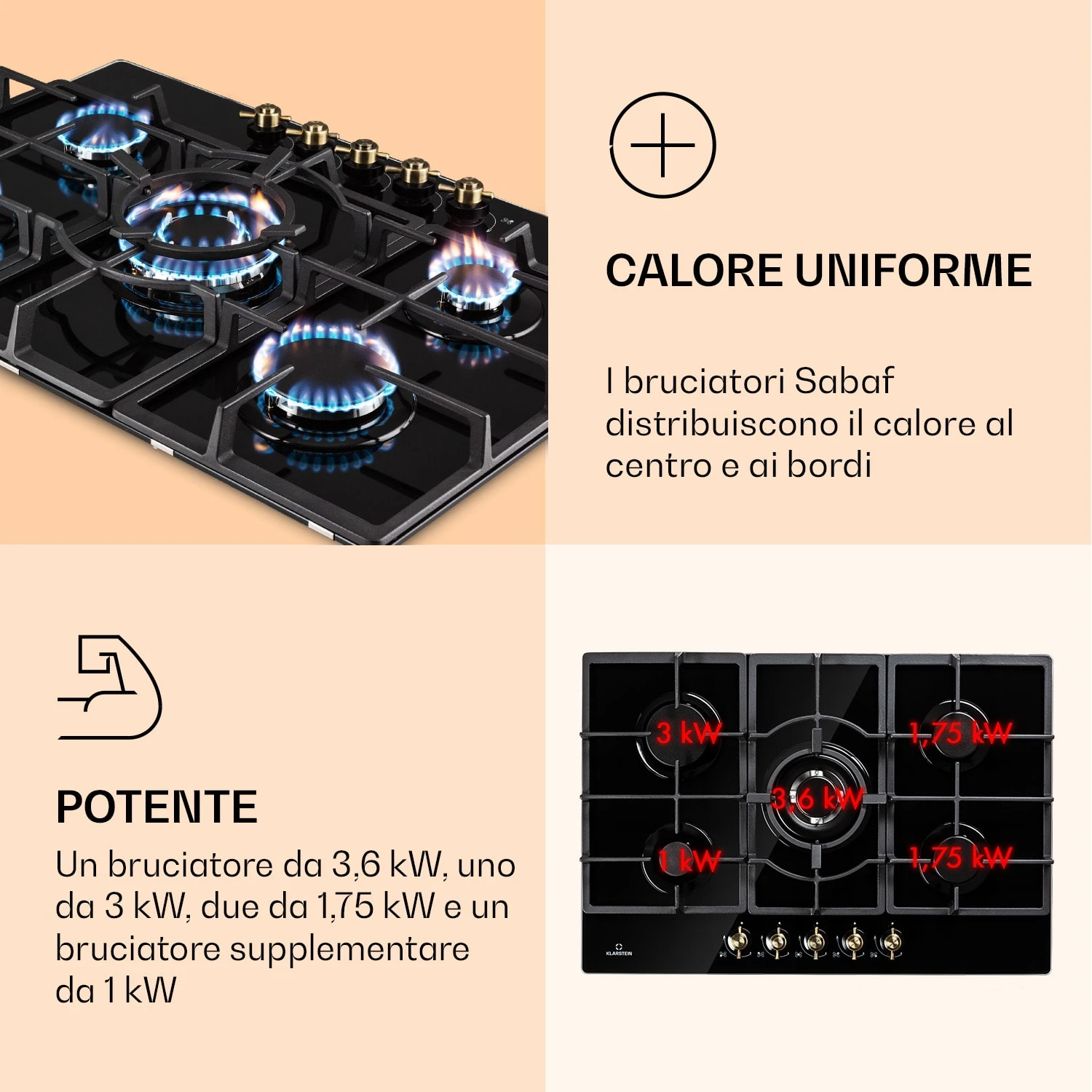 Con lo spazioso piano cottura a gas Victoria 5 di Klarstein hai a disposizione cinque bruciatori Sabaf di alta qualità, che riscaldano a dovere con una potenza di 3,6 kW, 3,0, 1 kW e 2 x 1,75 kW. Con i suoi bruciatori di diverse dimensioni, Victoria 5 è ideale per ogni tipo di preparazione: i bruciatori distribuiscono il calore uniformemente al centro e ai bordi delle pentole, in modo che tutto venga cotto alla perfezione. Il funzionamento è assolutamente intuitivo grazie ai simboli sulle grandi manopole dal design rétro, e l’apporto di calore può sempre essere regolato direttamente in ogni momento della cottura. La fiamma si accende tramite SnapJetIgnition, non occorre quindi alcun fuoco aggiuntivo. La croce rimovibile in solida ghisa viene posizionata sul fuoco in modo stabile e a prova di rovesciamento. Il piano cottura si distingue per un rivestimento in vetro ceramico temprato di facile manutenzione, che non solo ha un bell’aspetto, ma è anche particolarmente comodo da pulire.