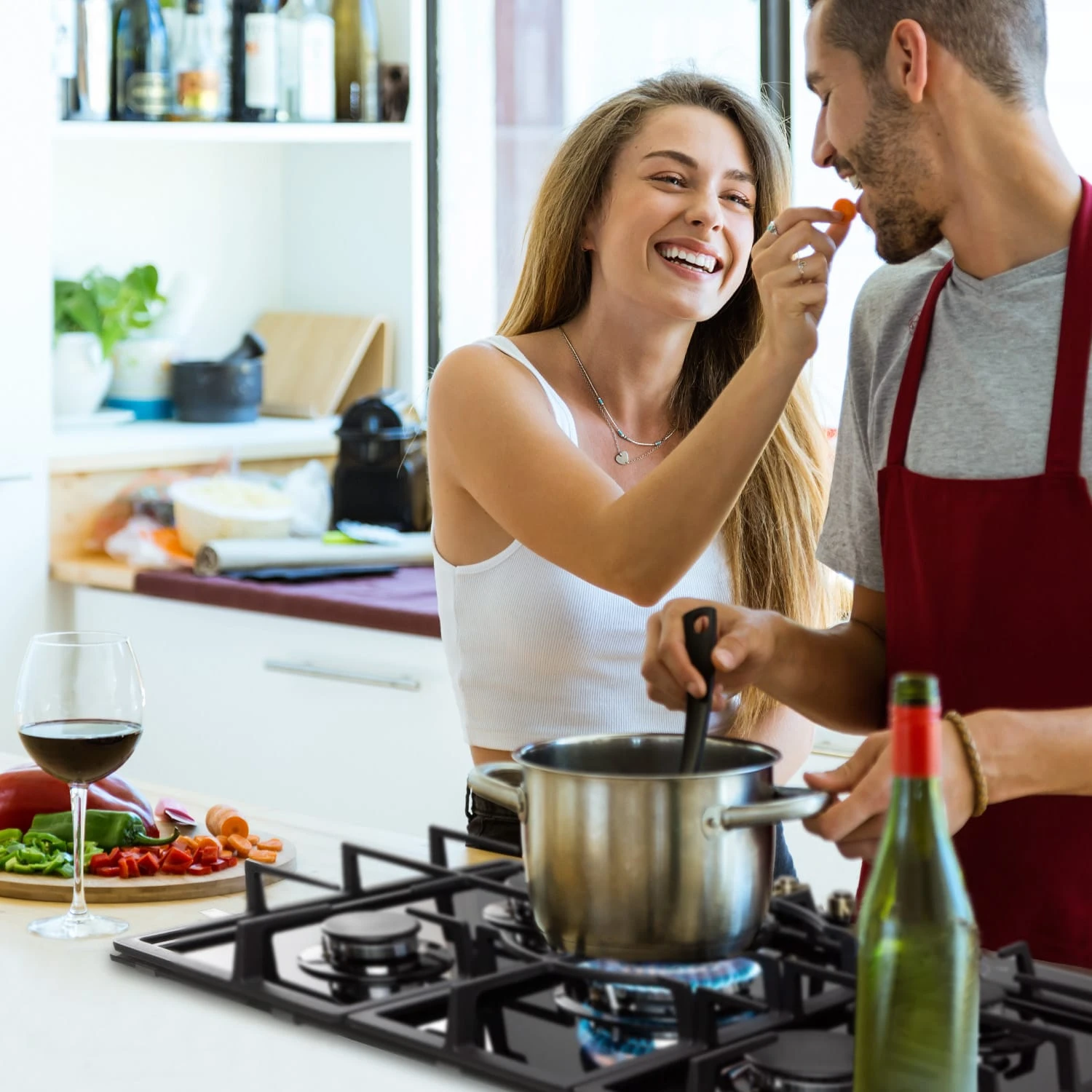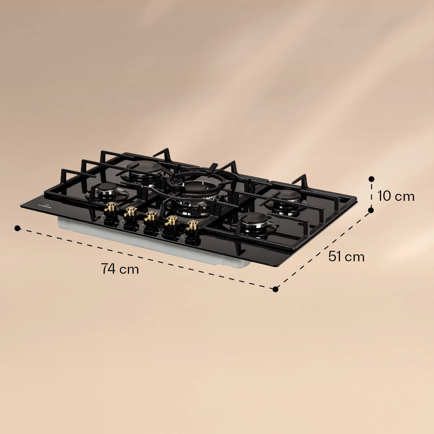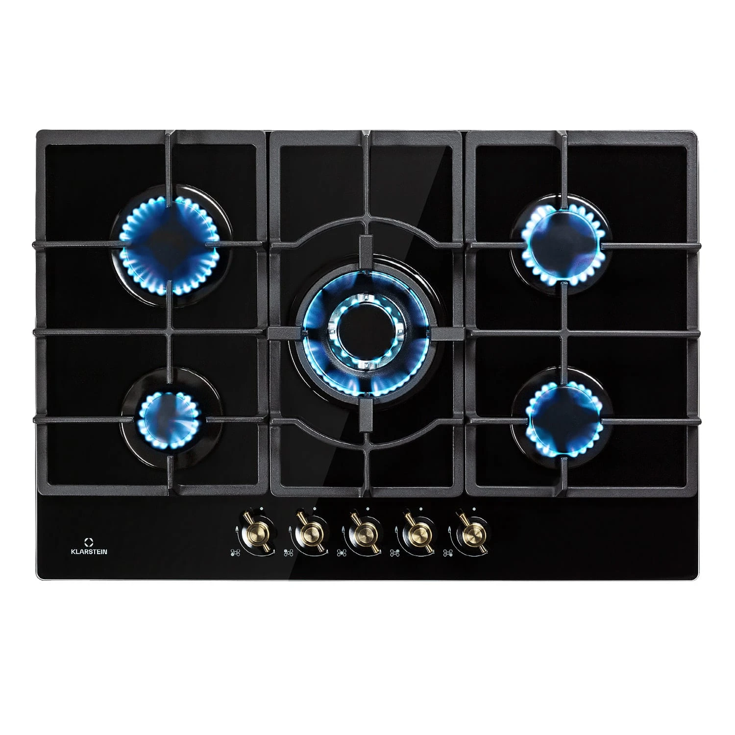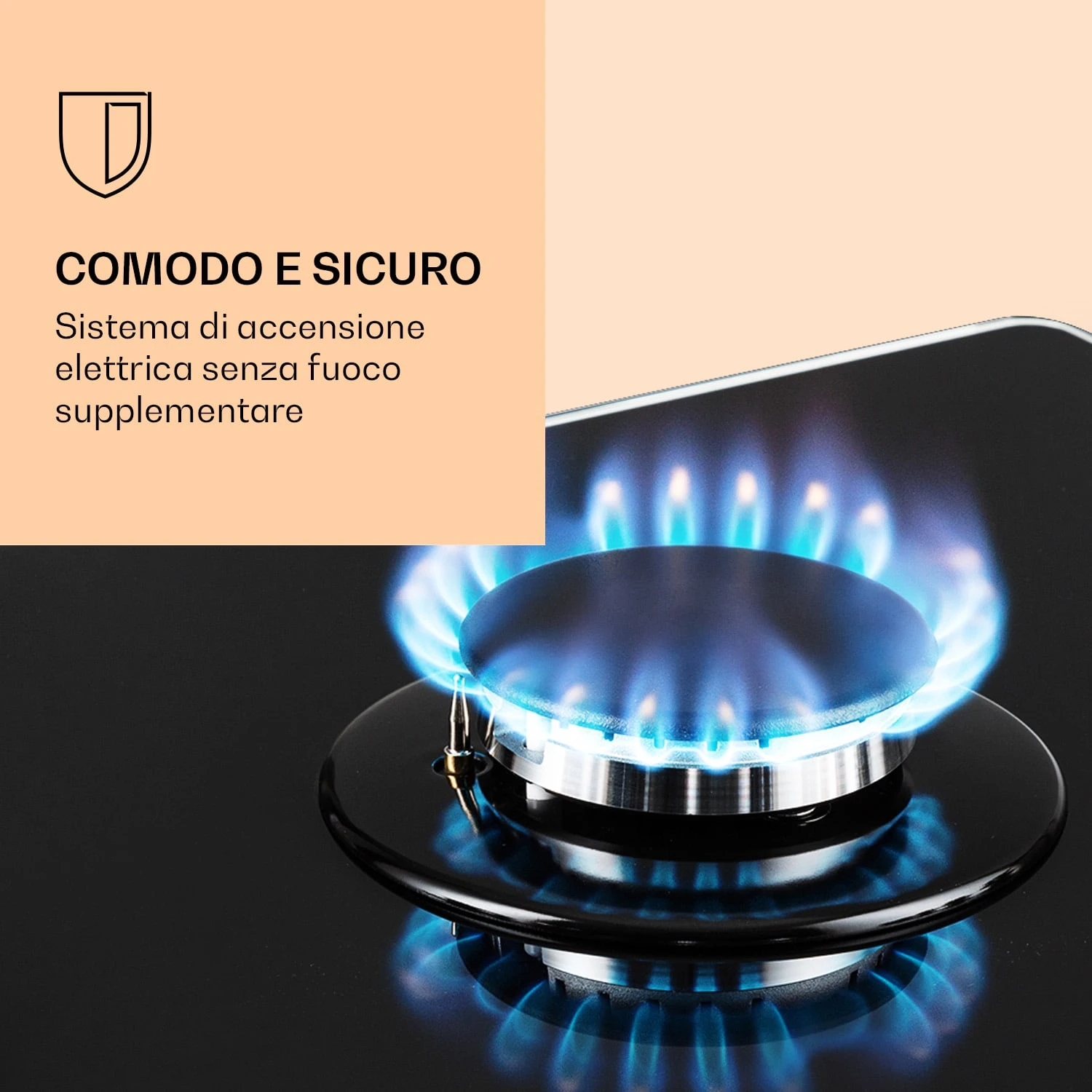 Con lo spazioso piano cottura a gas Victoria 5 di Klarstein hai a disposizione cinque bruciatori Sabaf di alta qualità, che riscaldano a dovere con una potenza di 3,6 kW, 3,0, 1 kW e 2 x 1,75 kW. Con i suoi bruciatori di diverse dimensioni, Victoria 5 è ideale per ogni tipo di preparazione: i bruciatori distribuiscono il calore uniformemente al centro e ai bordi delle pentole, in modo che tutto venga cotto alla perfezione. Il funzionamento è assolutamente intuitivo grazie ai simboli sulle grandi manopole dal design rétro, e l’apporto di calore può sempre essere regolato direttamente in ogni momento della cottura. La fiamma si accende tramite SnapJetIgnition, non occorre quindi alcun fuoco aggiuntivo. La croce rimovibile in solida ghisa viene posizionata sul fuoco in modo stabile e a prova di rovesciamento. Il piano cottura si distingue per un rivestimento in vetro ceramico temprato di facile manutenzione, che non solo ha un bell’aspetto, ma è anche particolarmente comodo da pulire.