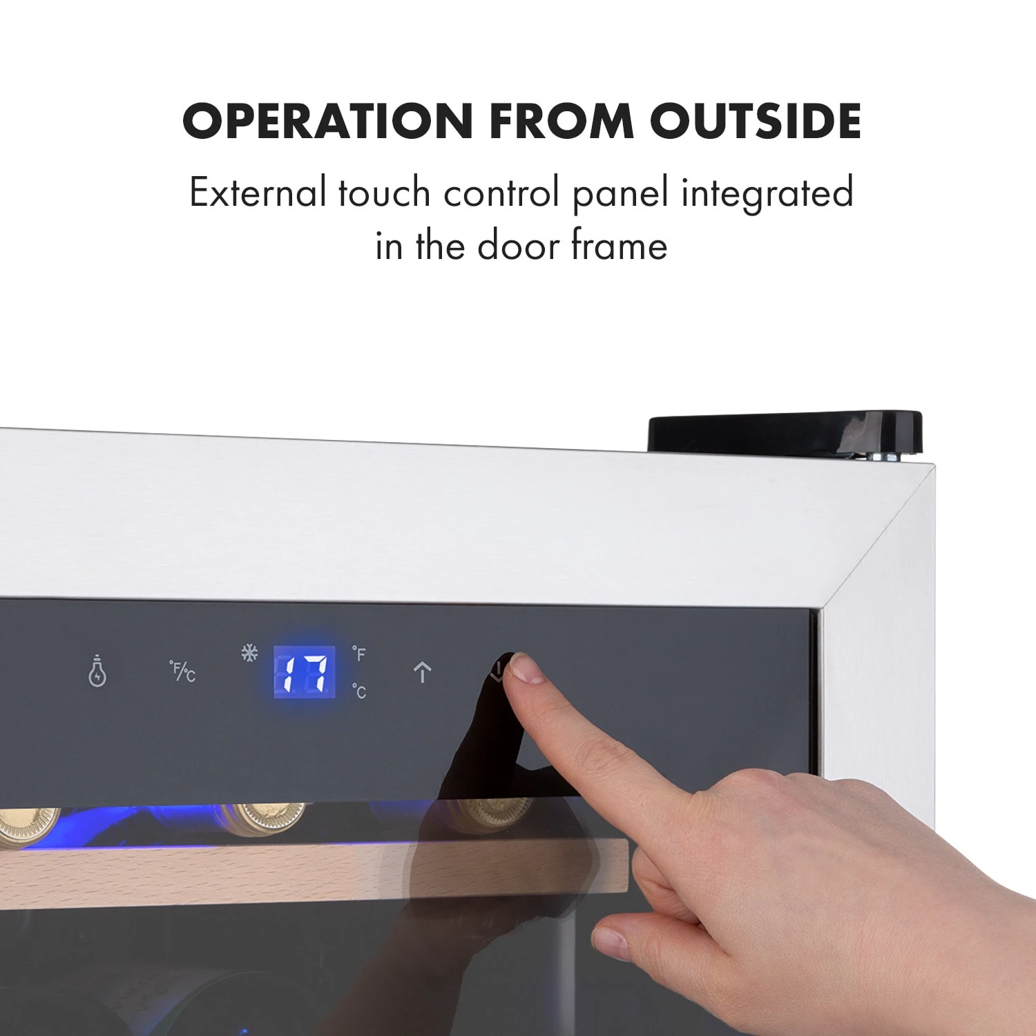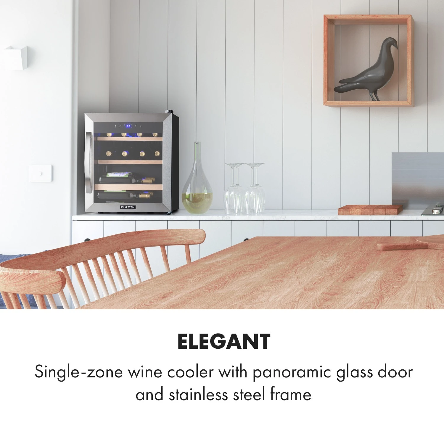 Ben refrigerato, elegantemente presentato in una cornice di acciaio inossidabile lucido: conservazione del vino nel frigorifero da vino Vinamour 12 Uno di Klarstein.