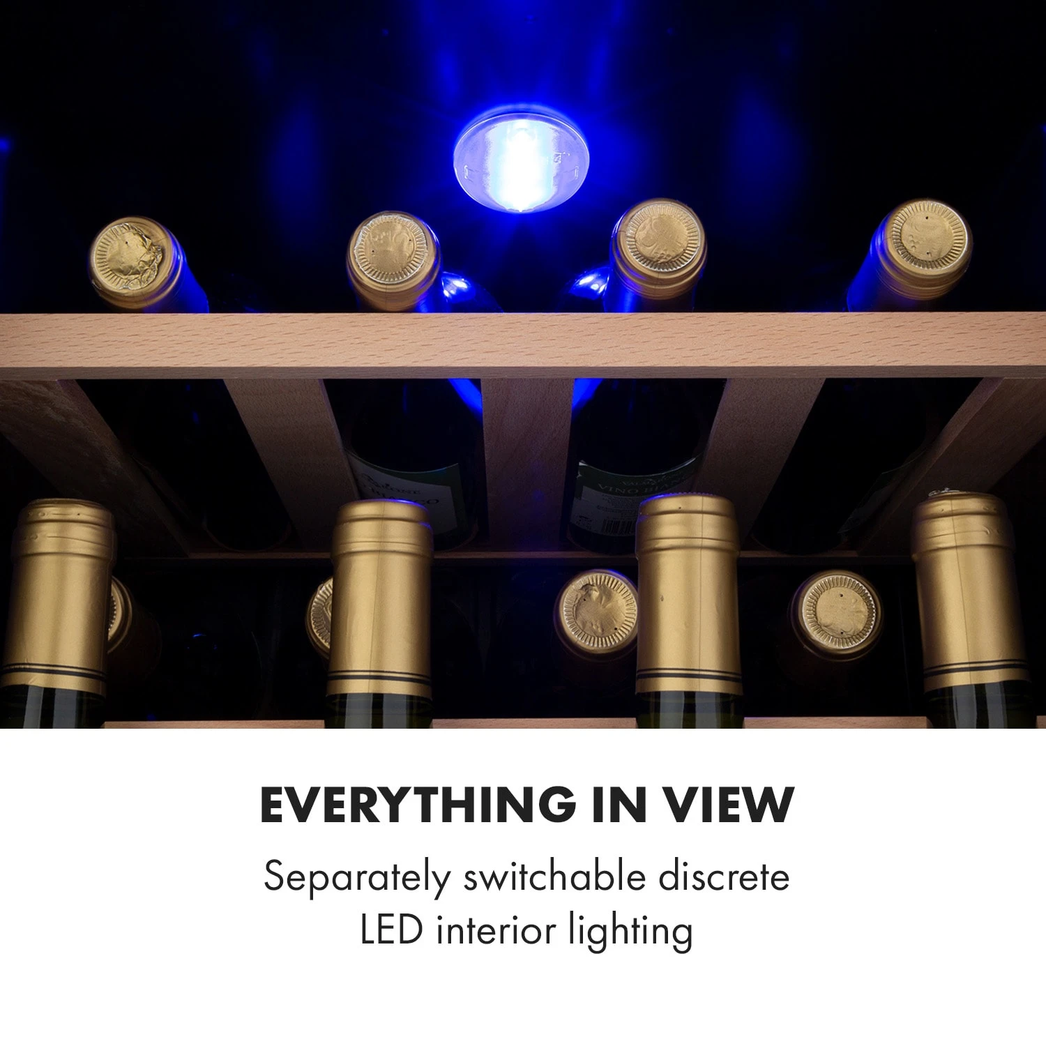 Fino a 12 bottiglie di vino trovano alloggio nell’interno da 46 litri della cantinetta per vini Vinamour 12 Uno di Klarstein. Su 2 robusti ripiani di legno estraibili sono conservati da 4 a 18 °C alla temperatura ideale per il consumo, esteticamente gradevoli e insieme facilmente accessibili. La porta panoramica in vetro di sicurezza offre sempre una visione delle scorte di vino, abilmente messe in scena dall’illuminazione interna a LED. Il pannello di controllo touch esterno rende un gioco da ragazzi impostare la temperatura di raffreddamento e accendere o spegnere la luce dall’esterno.