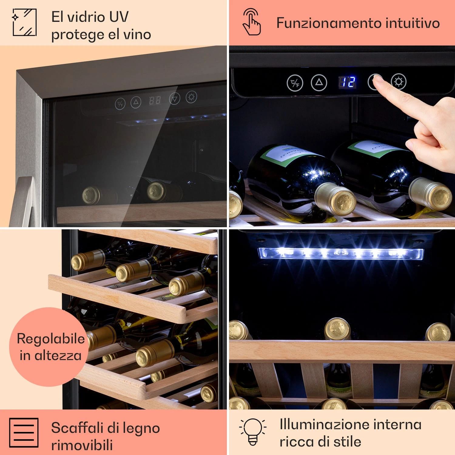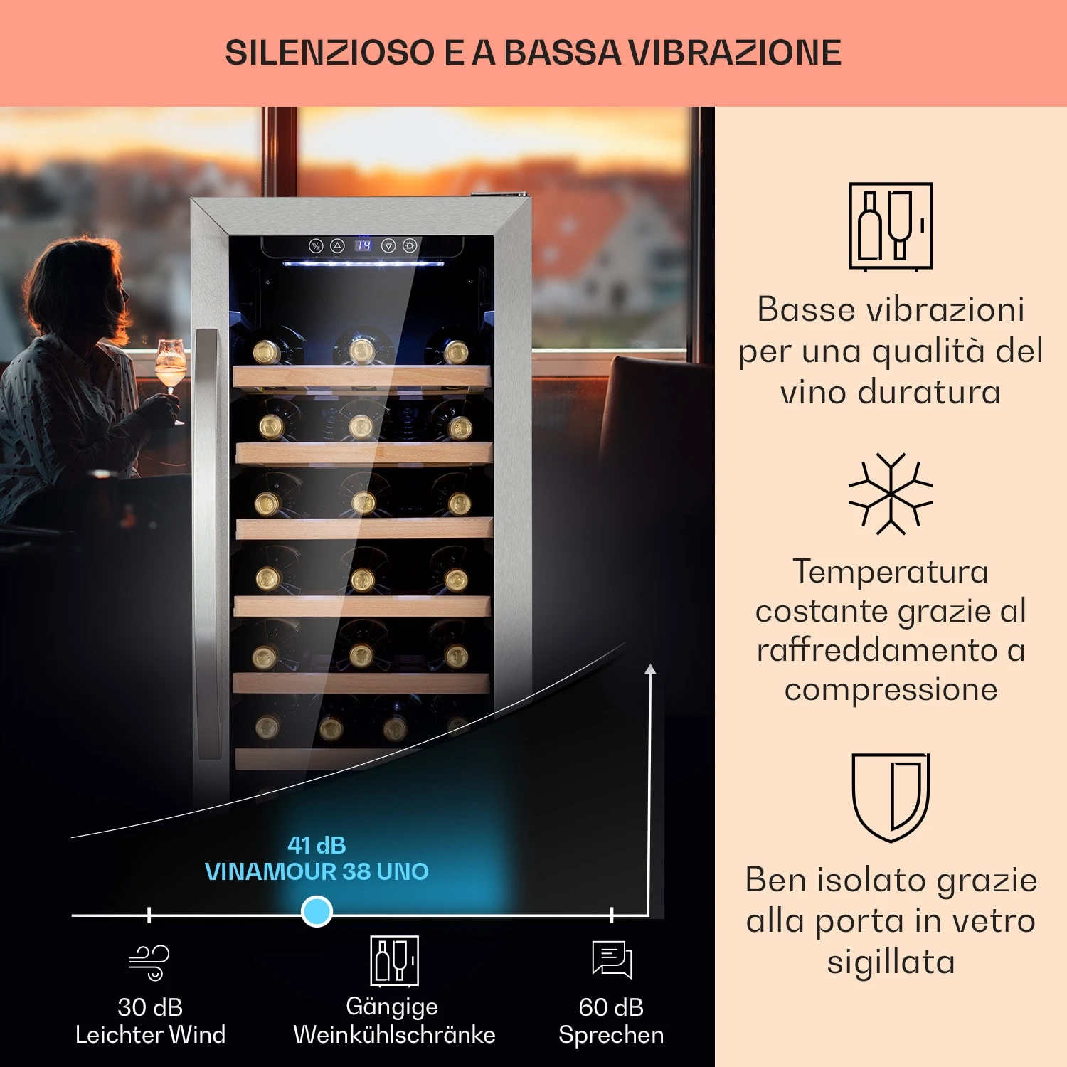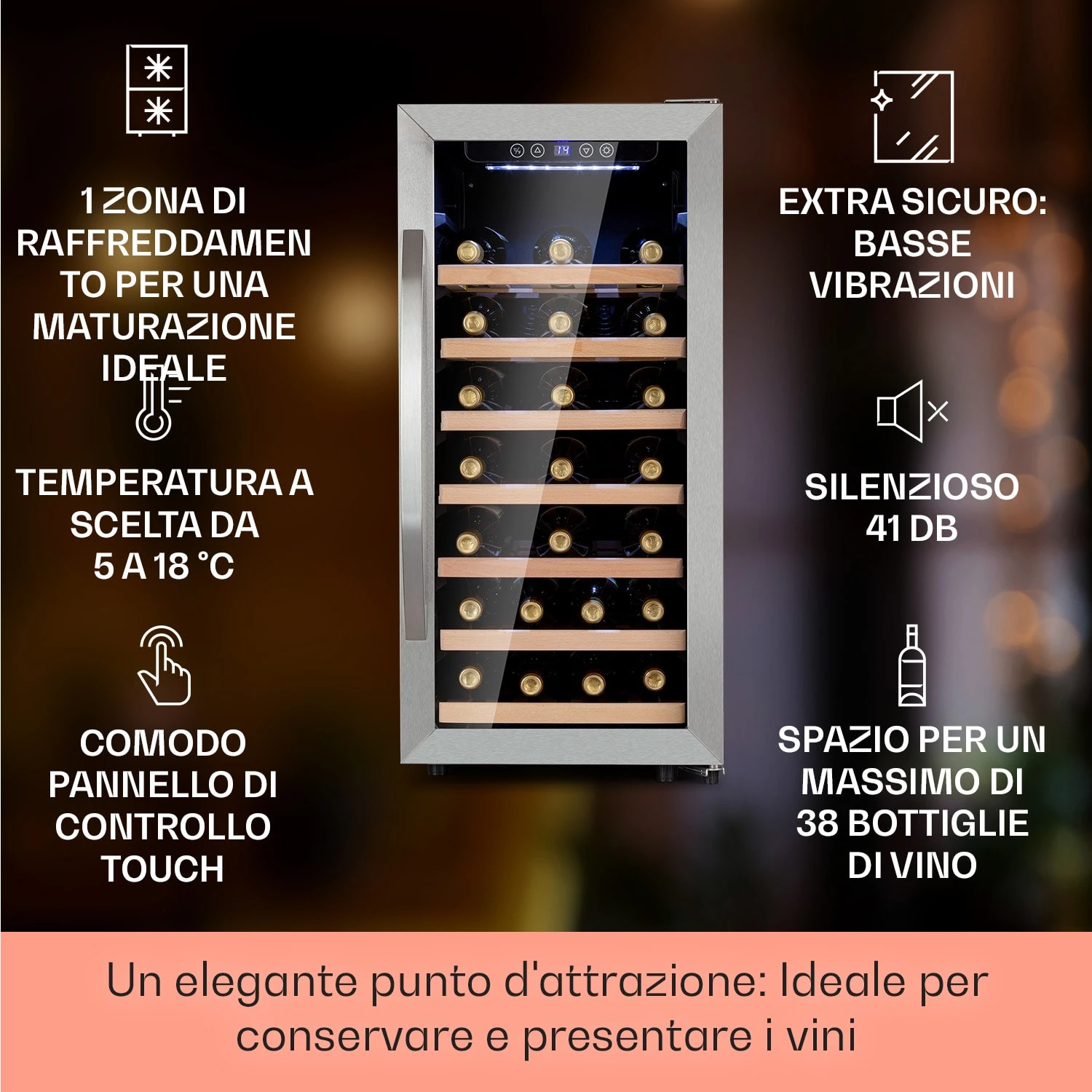Il frigorifero per vini Vinamour 38 Uno di Klarstein assicura degustazioni di alto livello. Con una zona di raffreddamento, garantisce la temperatura corretta a un totale di 38 bottiglie di vini bianchi o rossi. Le temperature di raffreddamento possono essere impostate tramite il pannello di controllo touch tra 5 e 18 °C, ponendo le condizioni ideali anche per lo champagne. Inoltre, dona un tocco di lusso all’ambiente e presenta i tuoi pregiati vini con gran raffinatezza. L’illuminazione bianca mette in risalto le tue bottiglie, mentre lo sportello panoramico in vetro ti permette di avere sempre sotto controllo le scorte.