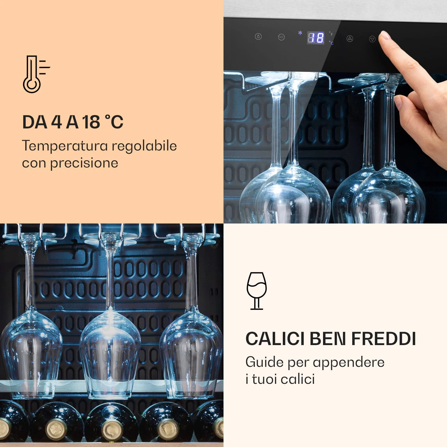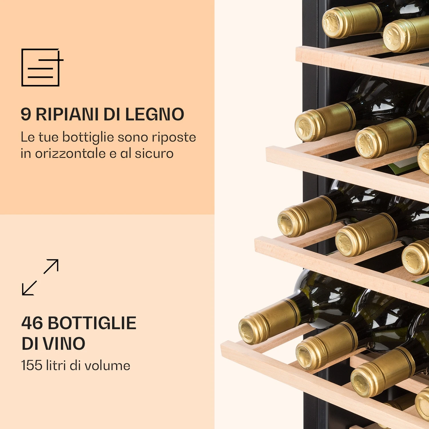 Per l’amore del vino: il frigorifero per vini Vinamour 46 Uno di Klarstein assicura degustazioni impeccabili. Con 155 litri di capacità, accoglie fino a 46 bottiglie di vino su 10 livelli e 9 ripiani in legno e le raffredda alla temperatura desiderata tra i 4 e i 18 °C. Nella parte superiore offre lo spazio sufficiente per alloggiare 6 bicchieri da vino capovolti. Inoltre, il comando tramite il touch rende la gestione pratica e semplice. Grazie all’interno illuminato le bottiglie più pregiate sono sapientemente messe in scena e la porta di vetro permette di ammirarle.