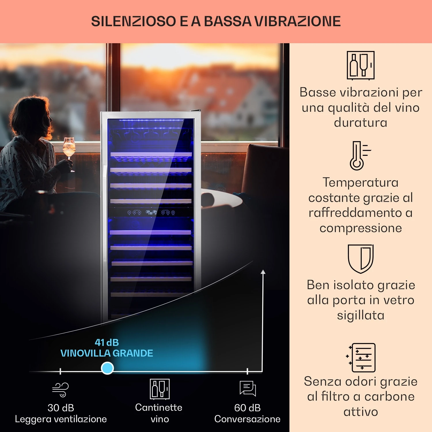 Conservazione del vino di prima classe per ristoratori e intenditori: il capiente frigorifero per vino a due ambienti Vinovilla Grande 116 Built-in Duo di Klarstein è uno spazio di conservazione elegante con le migliori condizioni per vini di ogni tipo.