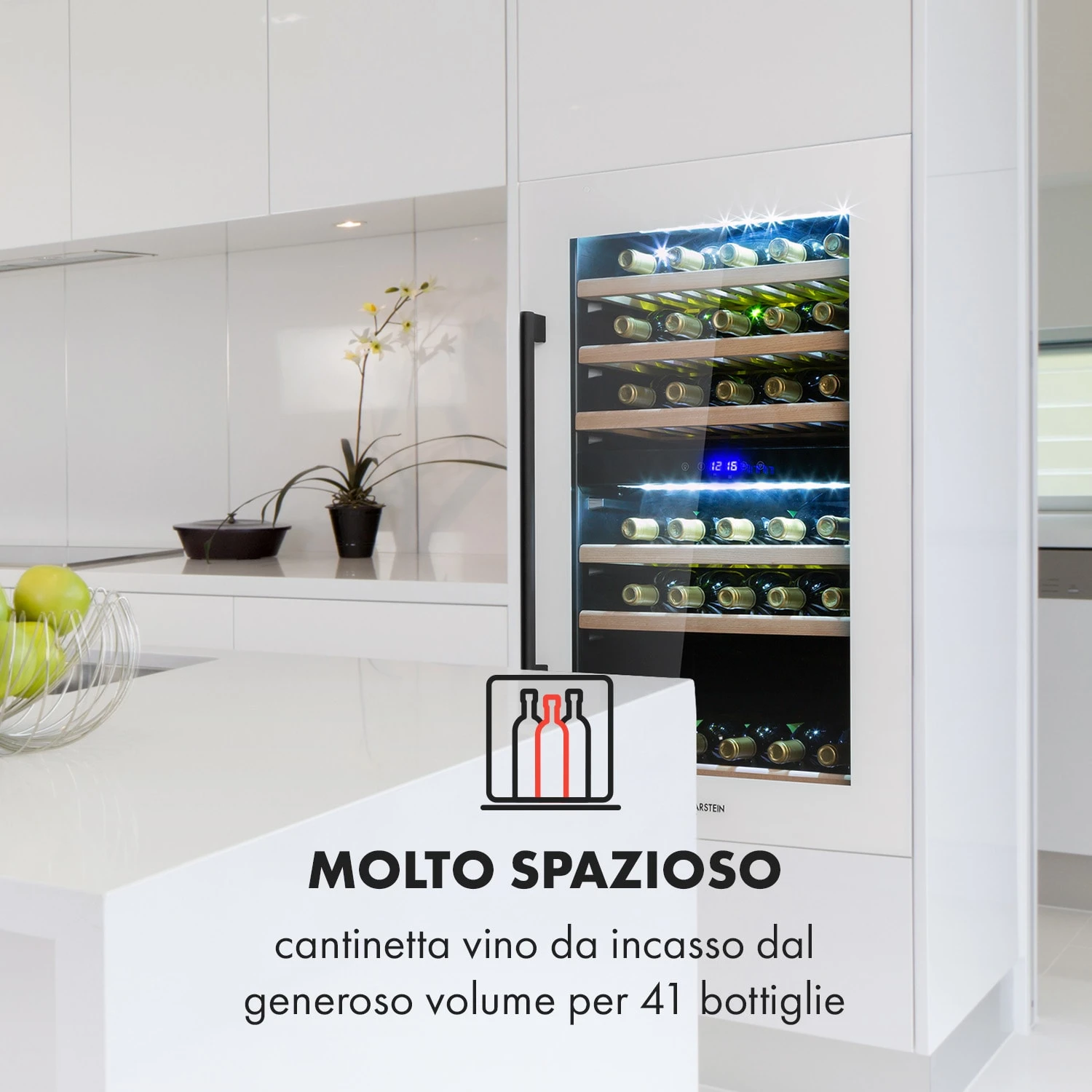Su 3 ripiani in legno, il frigorifero per vini Vinsider 41D Built-In Duo di Klarstein offre spazio per ben 41 bottiglie di vino. Non assicura solo condizioni di conservazione ottimali, ma mette sapientemente in risalto le tue bottiglie. Potrai illuminare le tue scorte di pregiati nettari e metterle in mostra con grande raffinatezza grazie allo sportello in vetro. Le due zone con temperature diverse permettono di raffreddare contemporaneamente vini bianchi e rossi. L’intuitivo display touch con indicazione digitale garantisce un utilizzo davvero comodissimo.