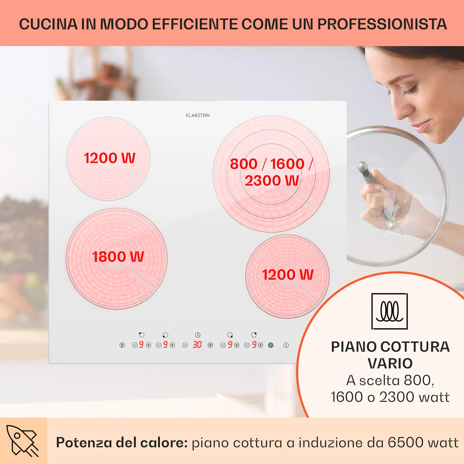 Qui potrai cucinare come vorrai. Il piano cottura a incasso Virtuosa 4 di Klarstein offre un piano cottura ampio, due piccoli e un piano cottura Vario flessibile per preparare velocemente i tuoi piatti. 6500 Watt totali cuociono e friggono gli alimenti in pentole e padelle. Particolarmente pratico risulta essere il fornello Vario, che funziona a una potenza di 800, 1600 oppure 2300 Watt a seconda delle dimensioni della pentola e che riconosce automaticamente la grandezza delle stoviglie. Il fornello in ceramica Virtuosa 4 di Klarstein viene gestito da un pannello di controllo touch integrato, grazie al quale si possono regolare i 9 livelli di potenza di ogni singolo fornello così come il timer. Per fare in modo che non ci siano intoppi durante la cottura, il fornello a incasso Virtuosa 4 di Klarstein possiede una protezione da surriscaldamento, una spia del calore residuo e un blocco di sicurezza per bambini per evitare una modifica involontaria delle impostazioni di cottura.