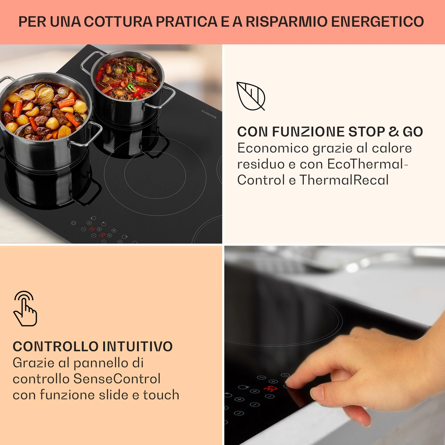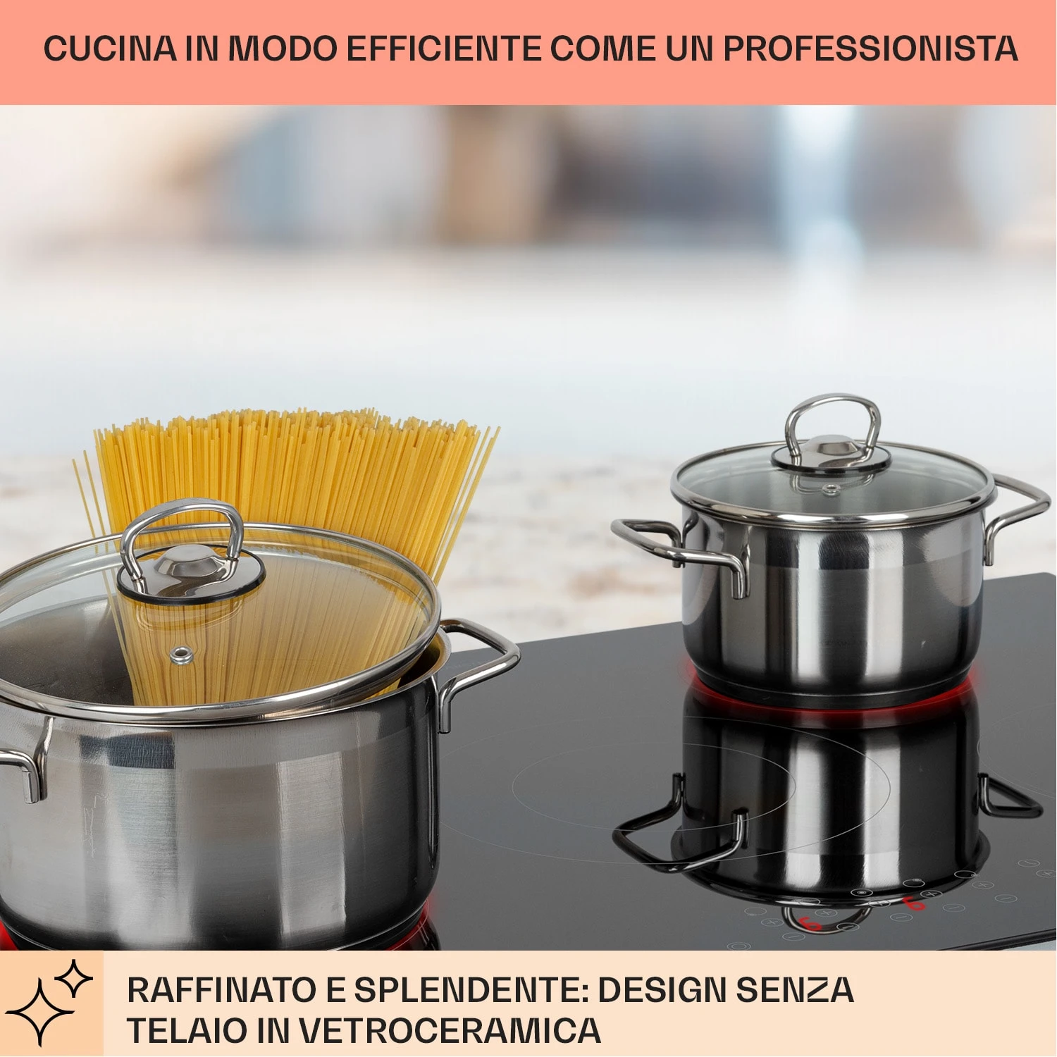 Qui potrai cucinare tutto ciò che desideri. Il piano cottura da incasso Virtuosa 5 di Klarstein offre due zone di cottura grandi, due piccole e una flessibile per preparare rapidamente un sacco di prelibatezze. Con un totale di 8200 watt di potenza, potrai cucinare in modo rapido ed efficace. Una caratteristica particolarmente pratica è la zona Vario, che funziona a 1000 o 2200 watt e rileva automaticamente le dimensioni delle pentole. Il piano in vetroceramica Virtuosa 5 di Klarstein viene gestito con un pannello di controllo touch integrato che consente di impostare i 9 livelli di potenza delle singole zone e il timer. Per garantire che tutto fili liscio mentre cucini, il piano da incasso Virtuosa 5 di Klarstein è dotato di una protezione contro il surriscaldamento, di un indicatore di calore residuo e di un blocco per bambini per evitare modifiche accidentali alle impostazioni di cottura.